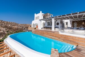 In amazing Cycladic-style, Artisti Watercolor is a stand alone classic Greek Villa well positioned on over 4000 sqm of land, overlooking Agrari and Elia Beach. Artisti