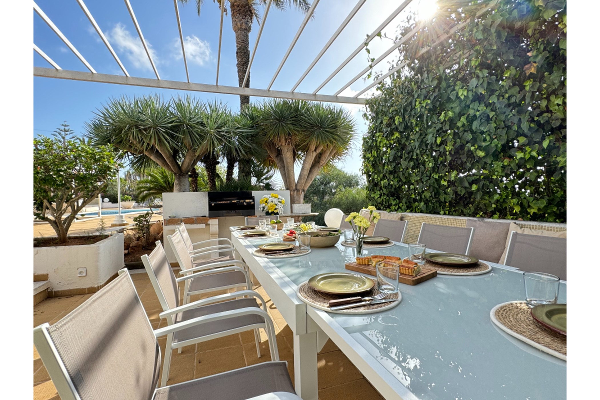 A private swimming pool anchors the outdoor space, framed by sun loungers and shaded seating. The barbecue and al fresco dining area invite long outdoor meals. Mature Mediterranean gardens provide both shade and fragrance. Terraces are oriented to maximise the sea views.