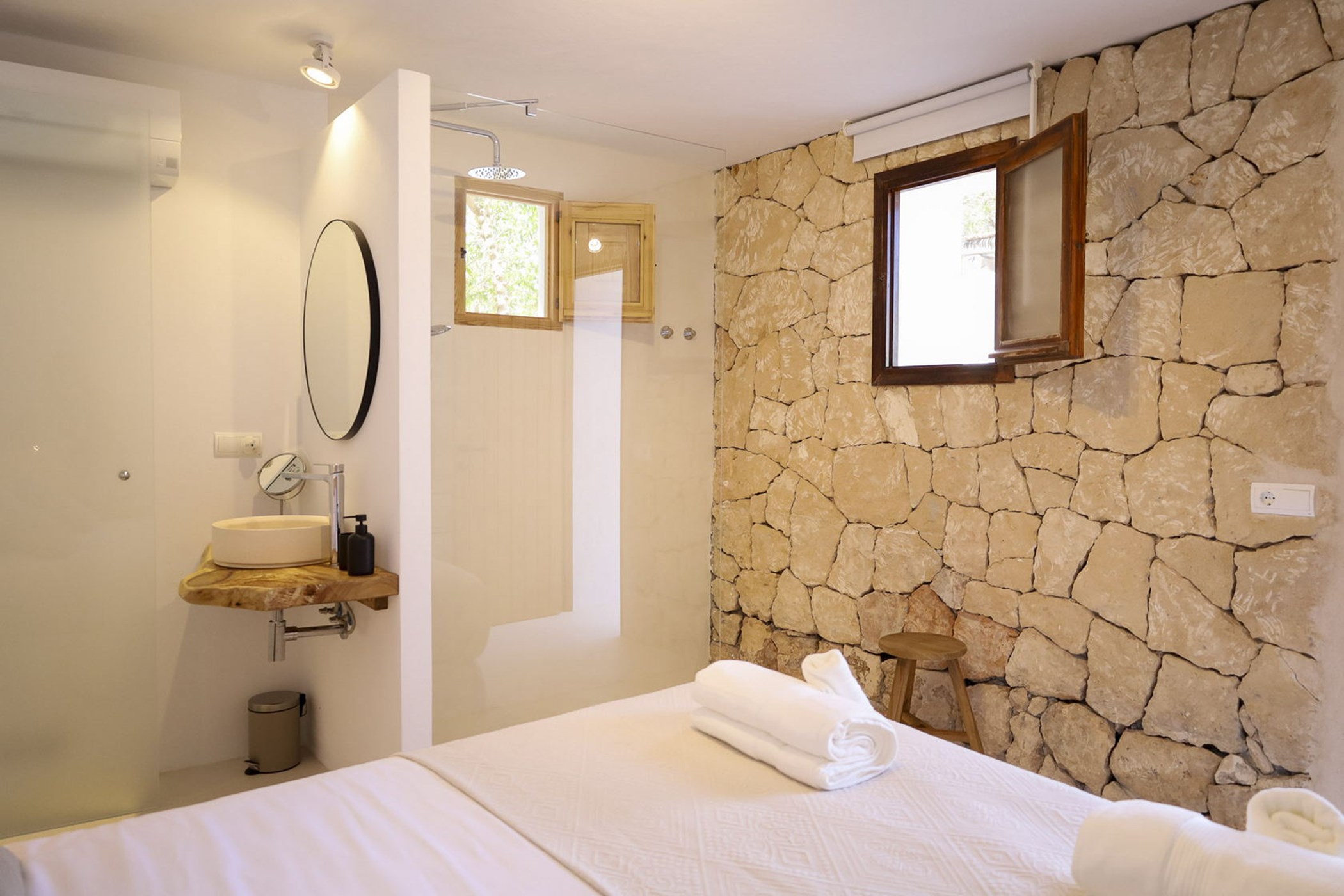 The interiors are generous and well-proportioned, dressed in neutral tones that allow the Mediterranean light — and the landscape beyond the windows — to be the protagonists. Living spaces move naturally from inside to outside.