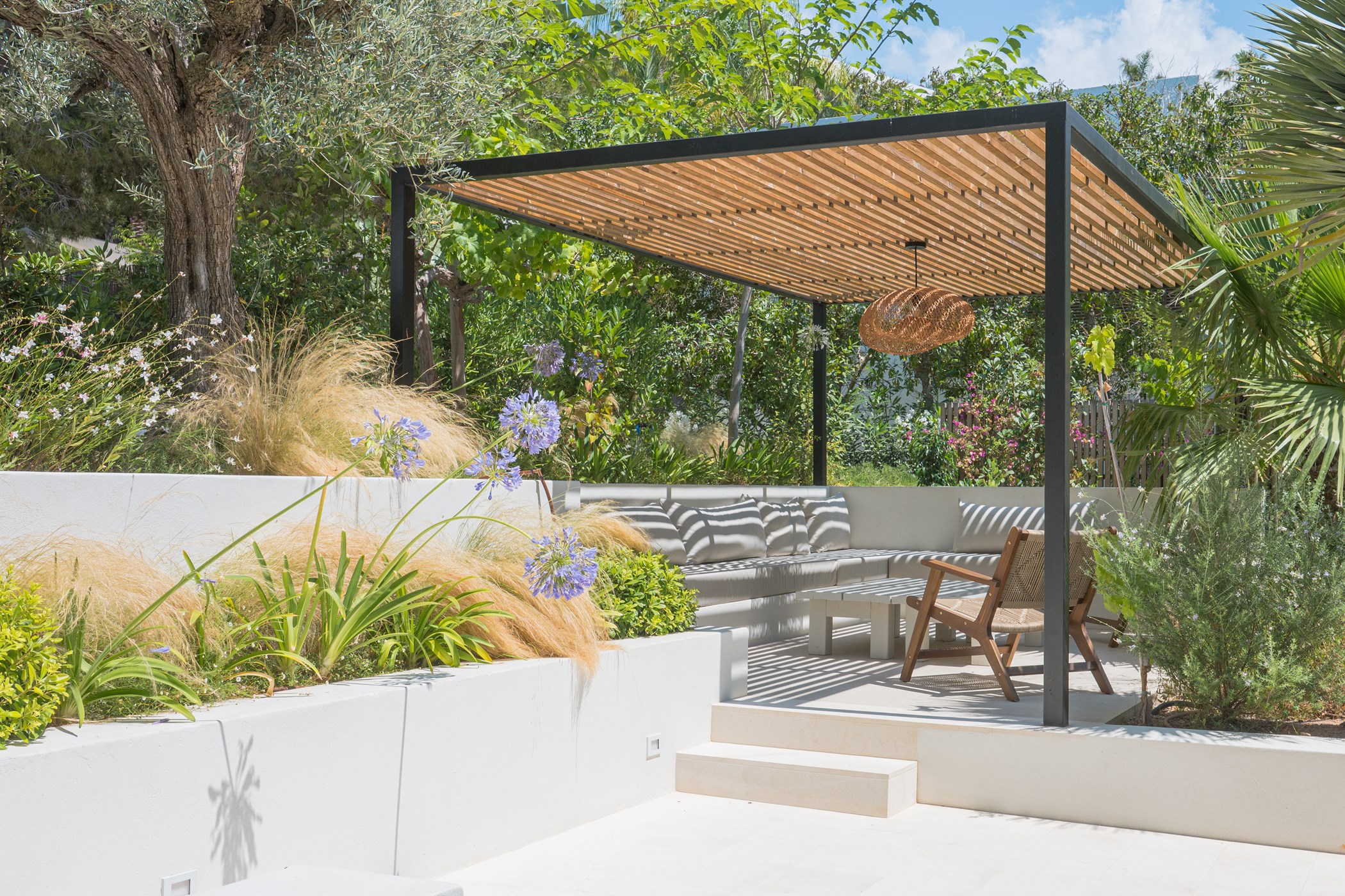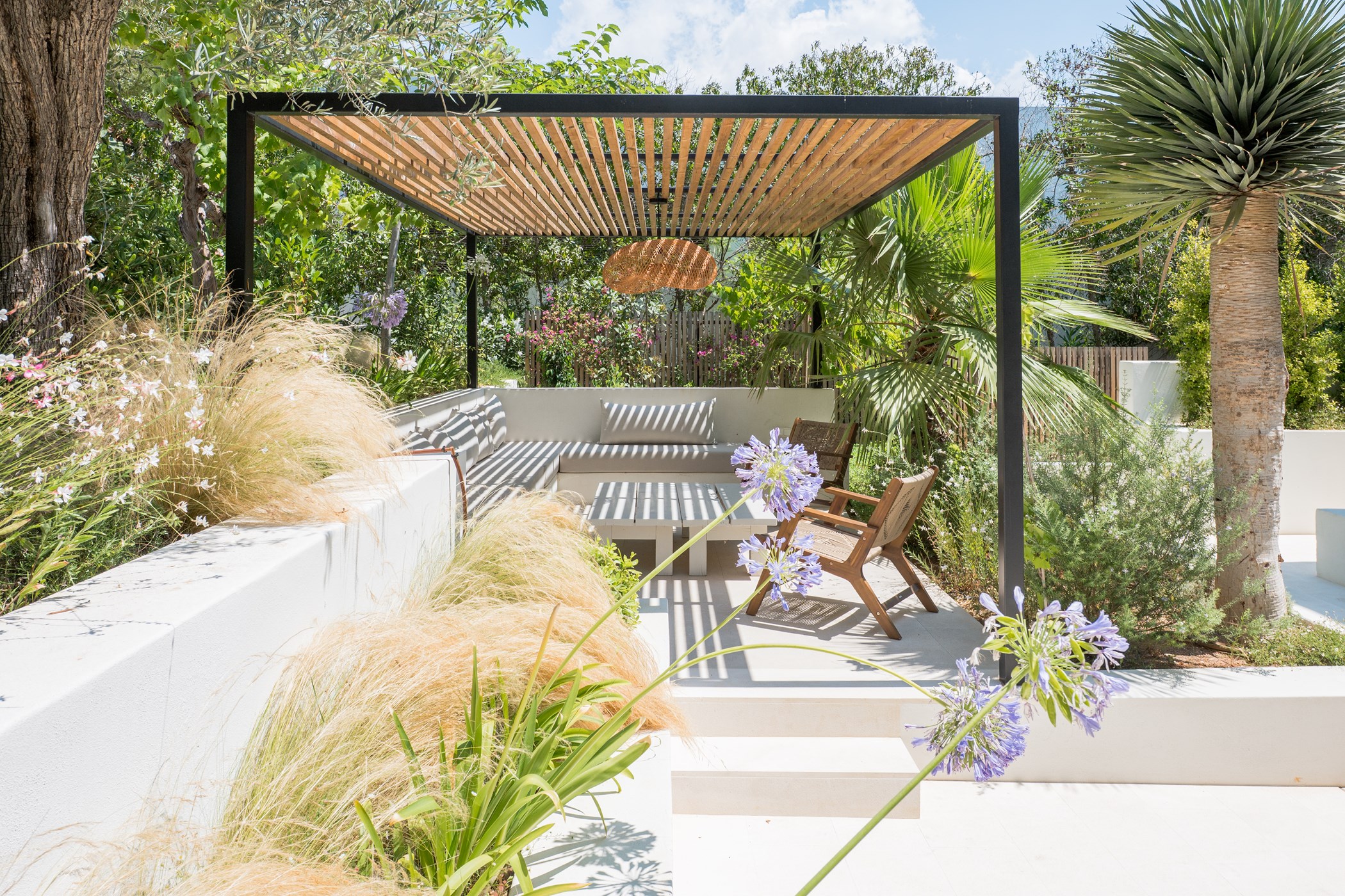 A private swimming pool anchors the outdoor space, framed by sun loungers and shaded seating. The barbecue and al fresco dining area invite long outdoor meals. Mature Mediterranean gardens provide both shade and fragrance. Terraces are oriented to maximise the sea views.