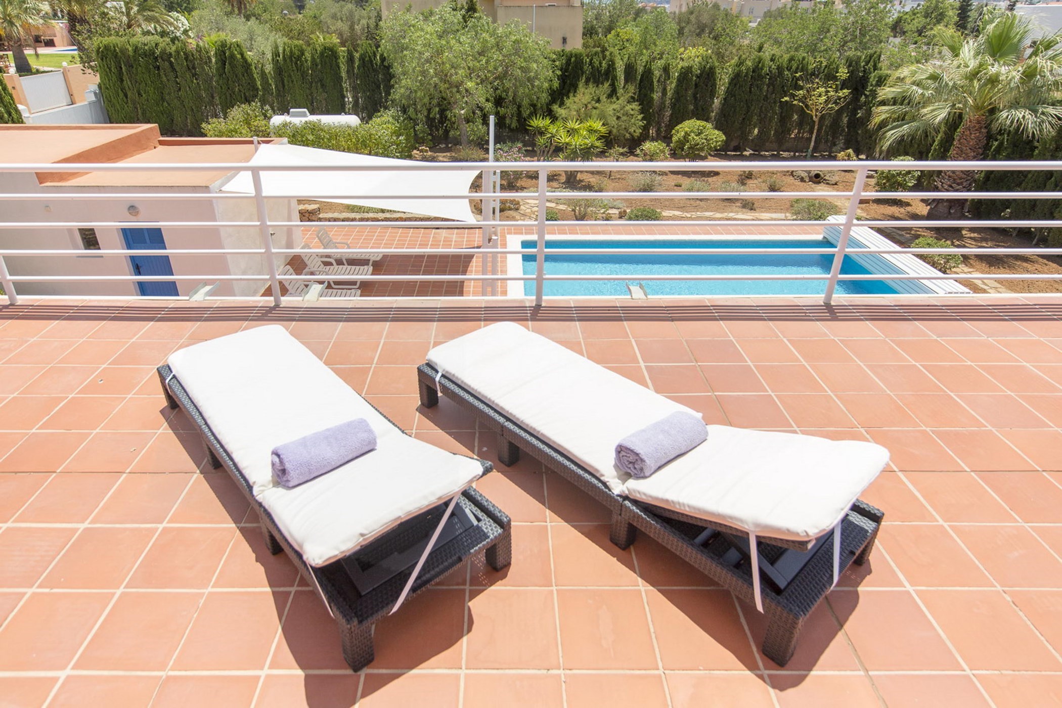 A private swimming pool anchors the outdoor space, framed by sun loungers and shaded seating. The barbecue and al fresco dining area invite long outdoor meals. Terraces are oriented to maximise the sea views.