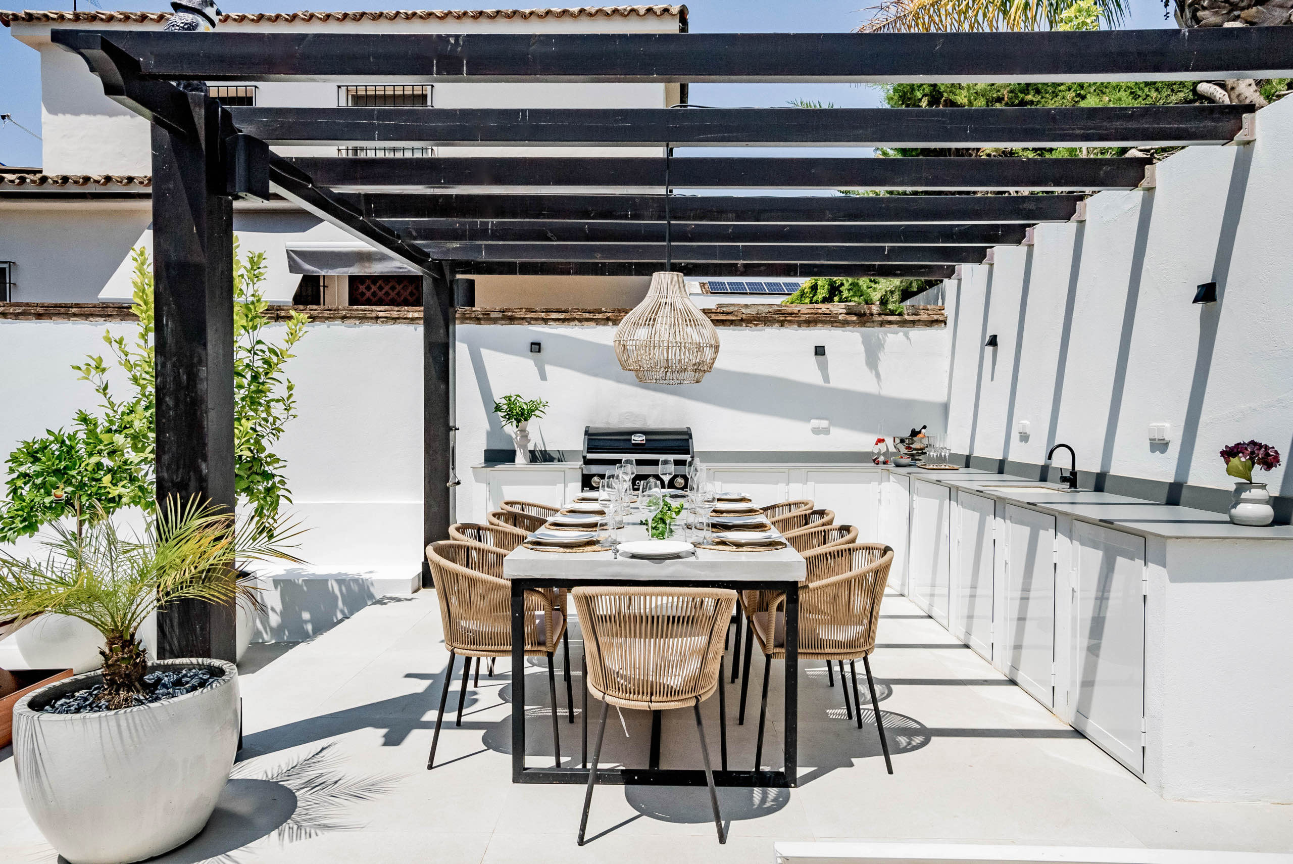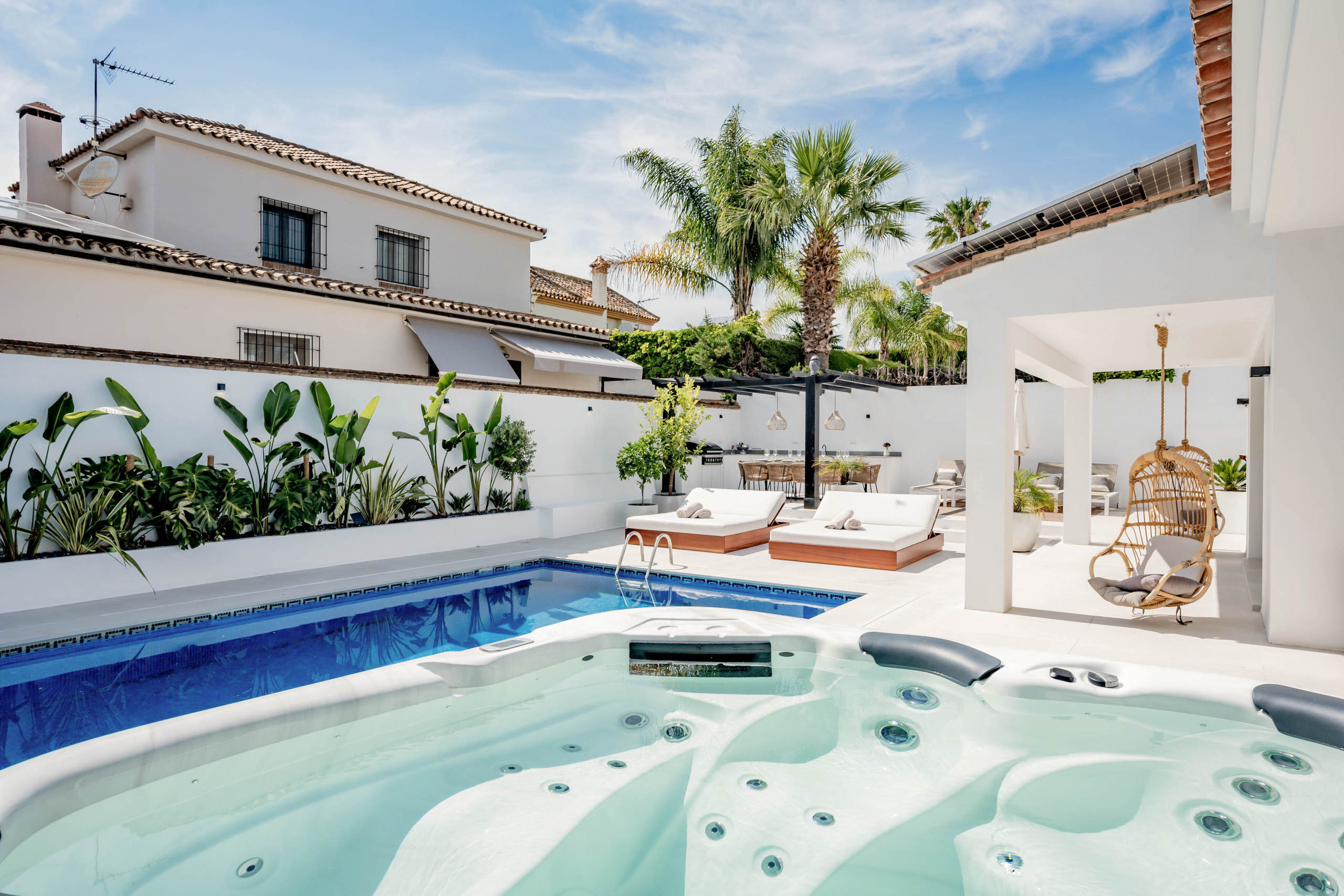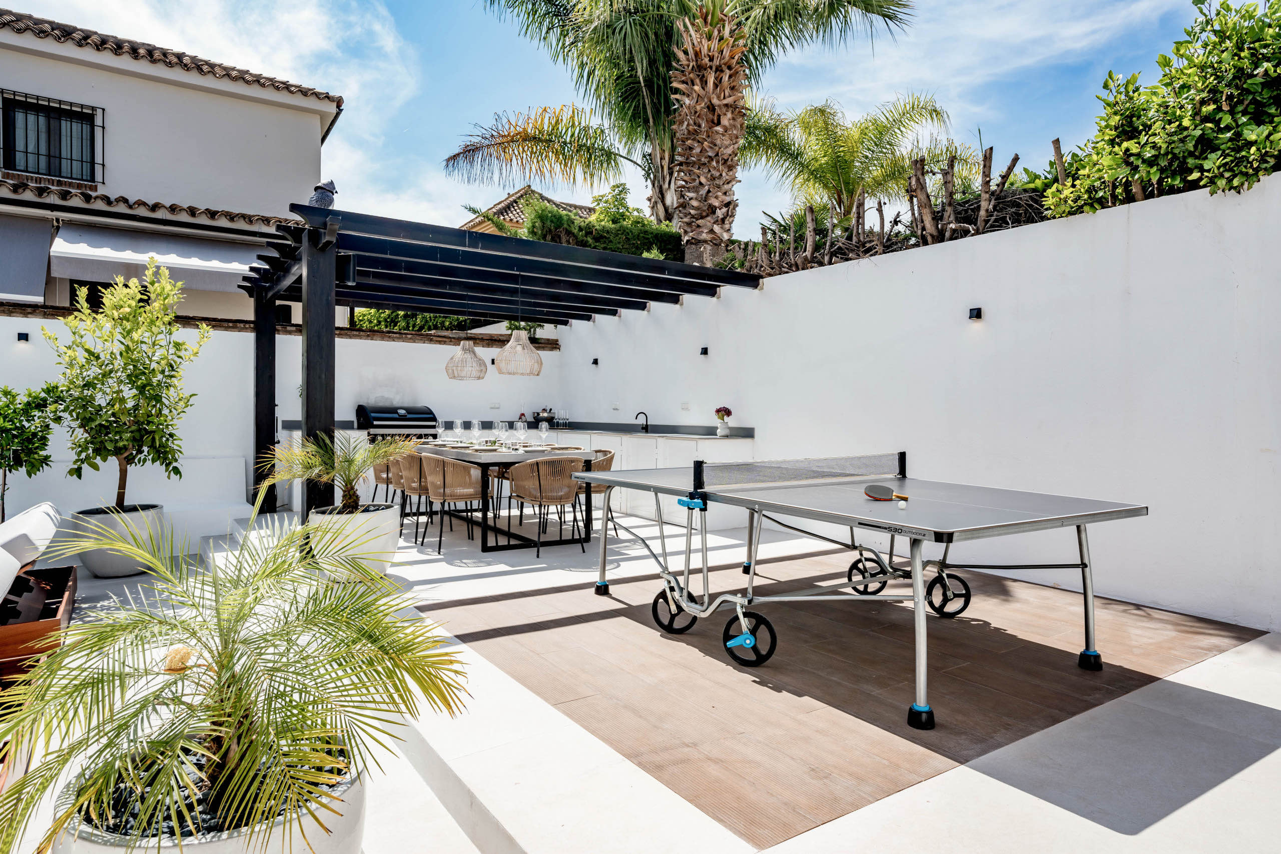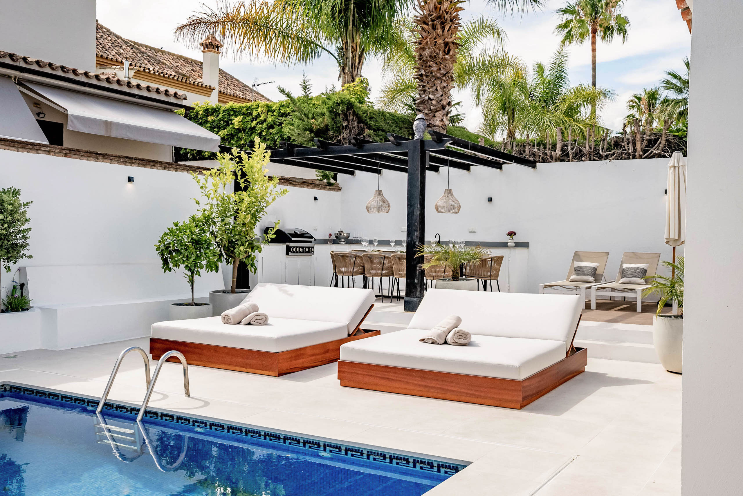 The landscaped garden wraps around the private swimming pool, bordered by chill-out zones and outdoor dining spaces. A built-in summer kitchen and Weber BBQ set the scene for long, languid evenings under the Marbella sky. Lush greenery and thoughtful lighting create an atmosphere of serenity and delight.