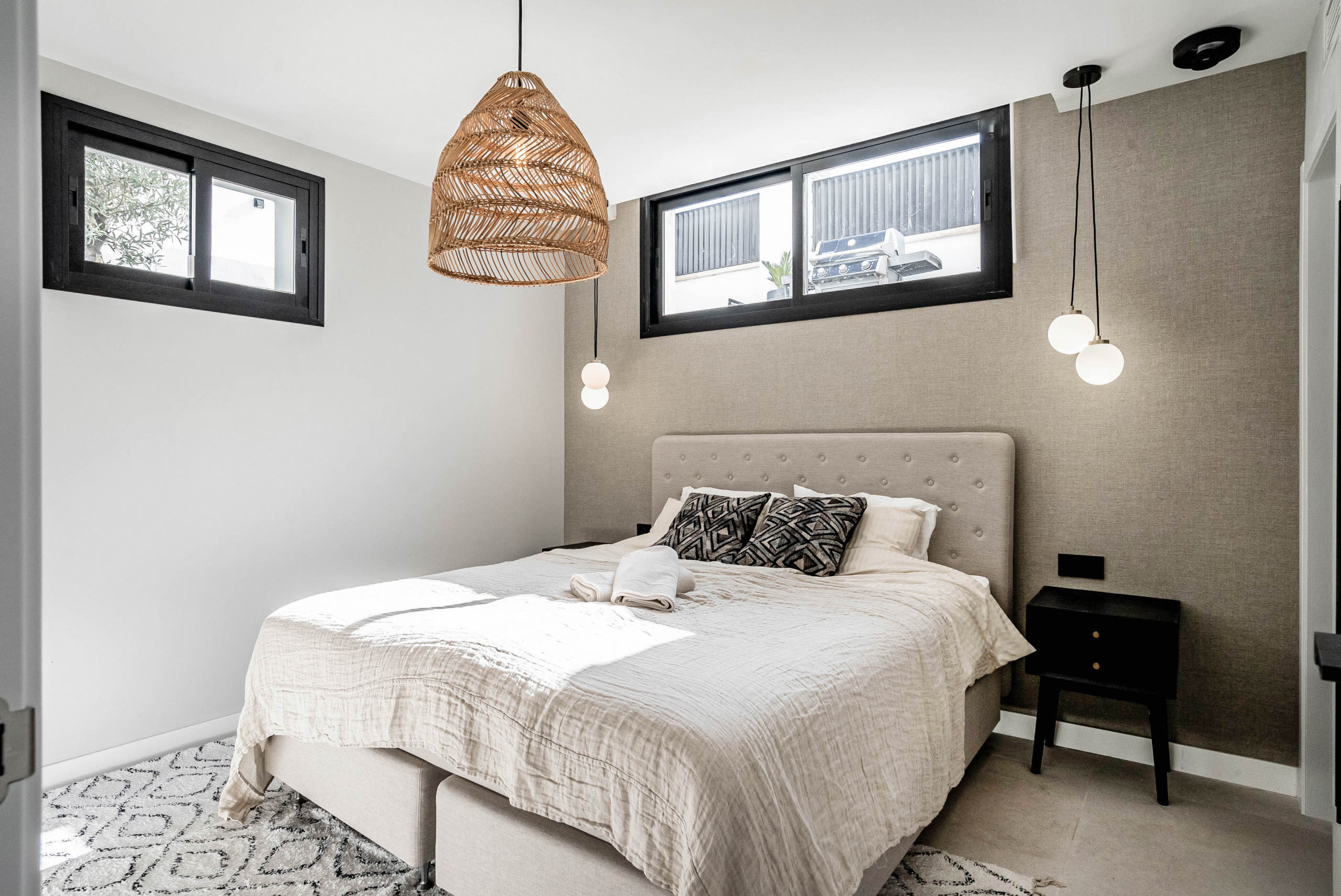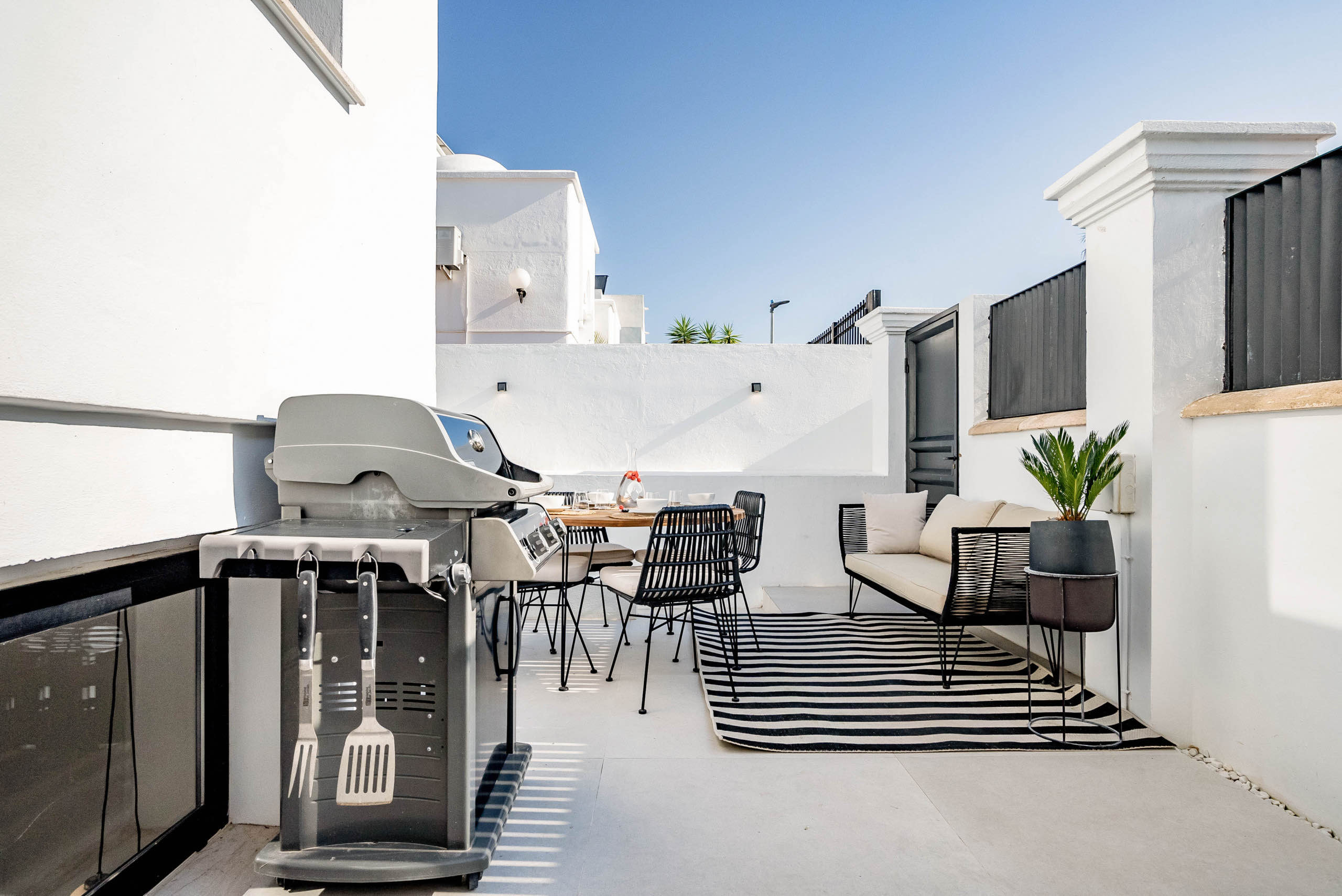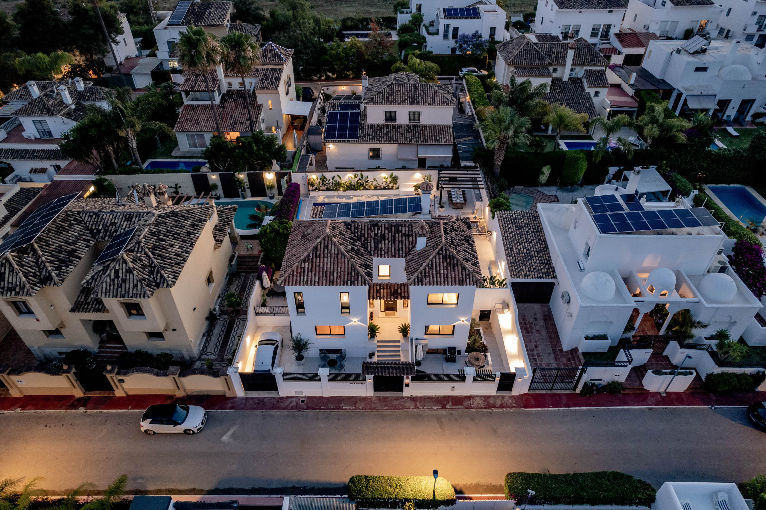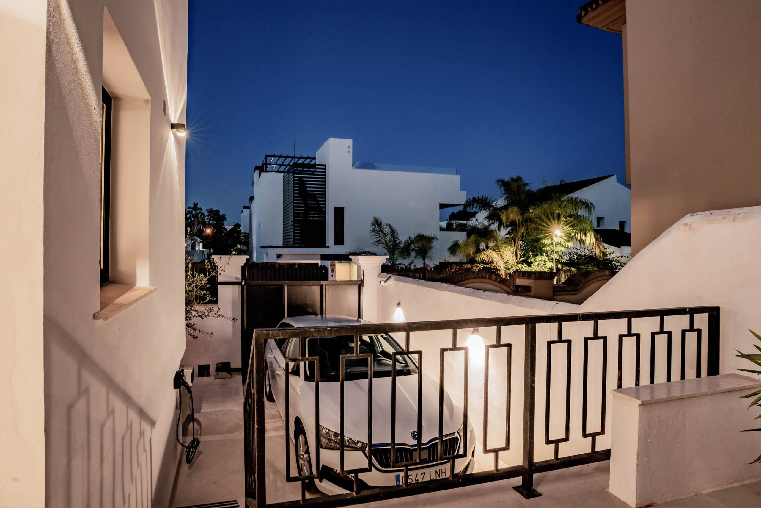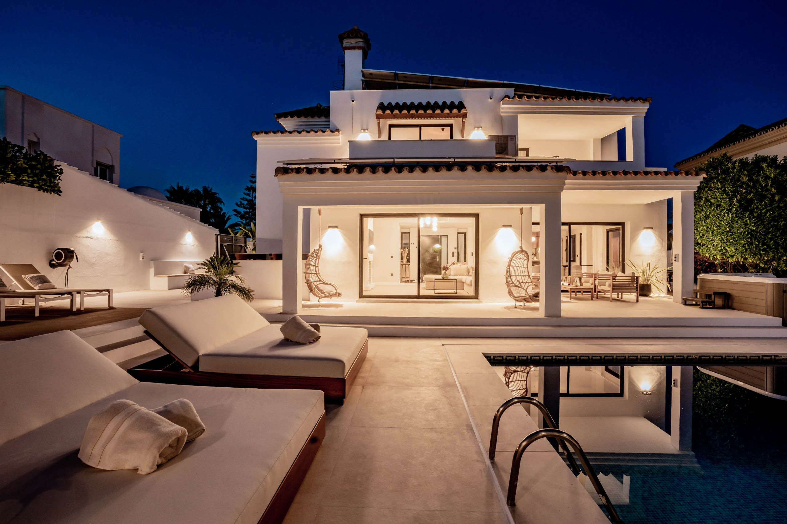 The landscaped garden wraps around the private swimming pool, bordered by chill-out zones and outdoor dining spaces. A built-in summer kitchen and Weber BBQ set the scene for long, languid evenings under the Marbella sky. Lush greenery and thoughtful lighting create an atmosphere of serenity and delight.