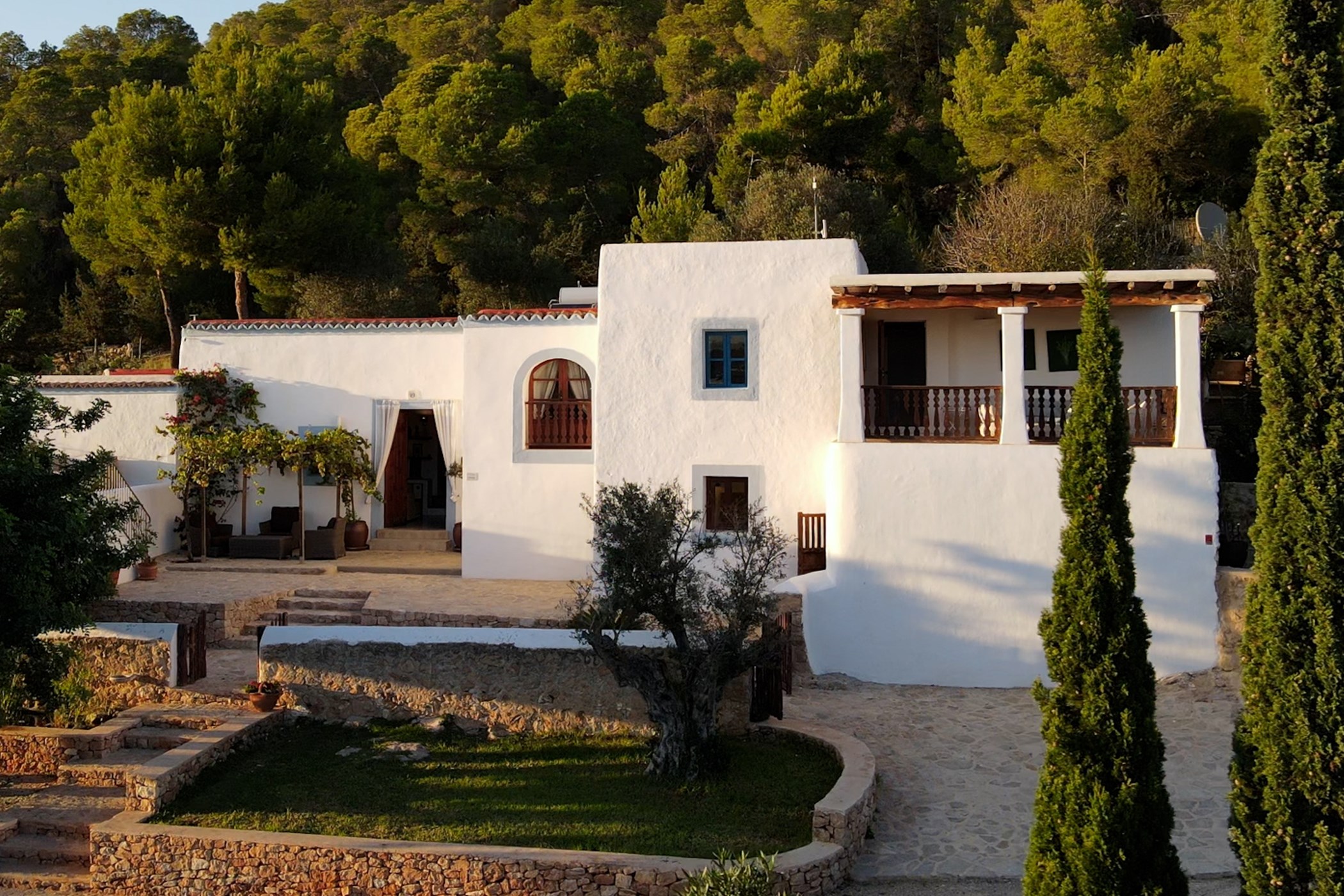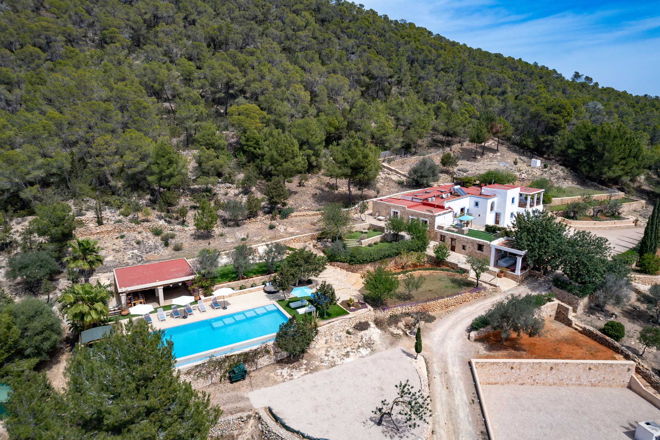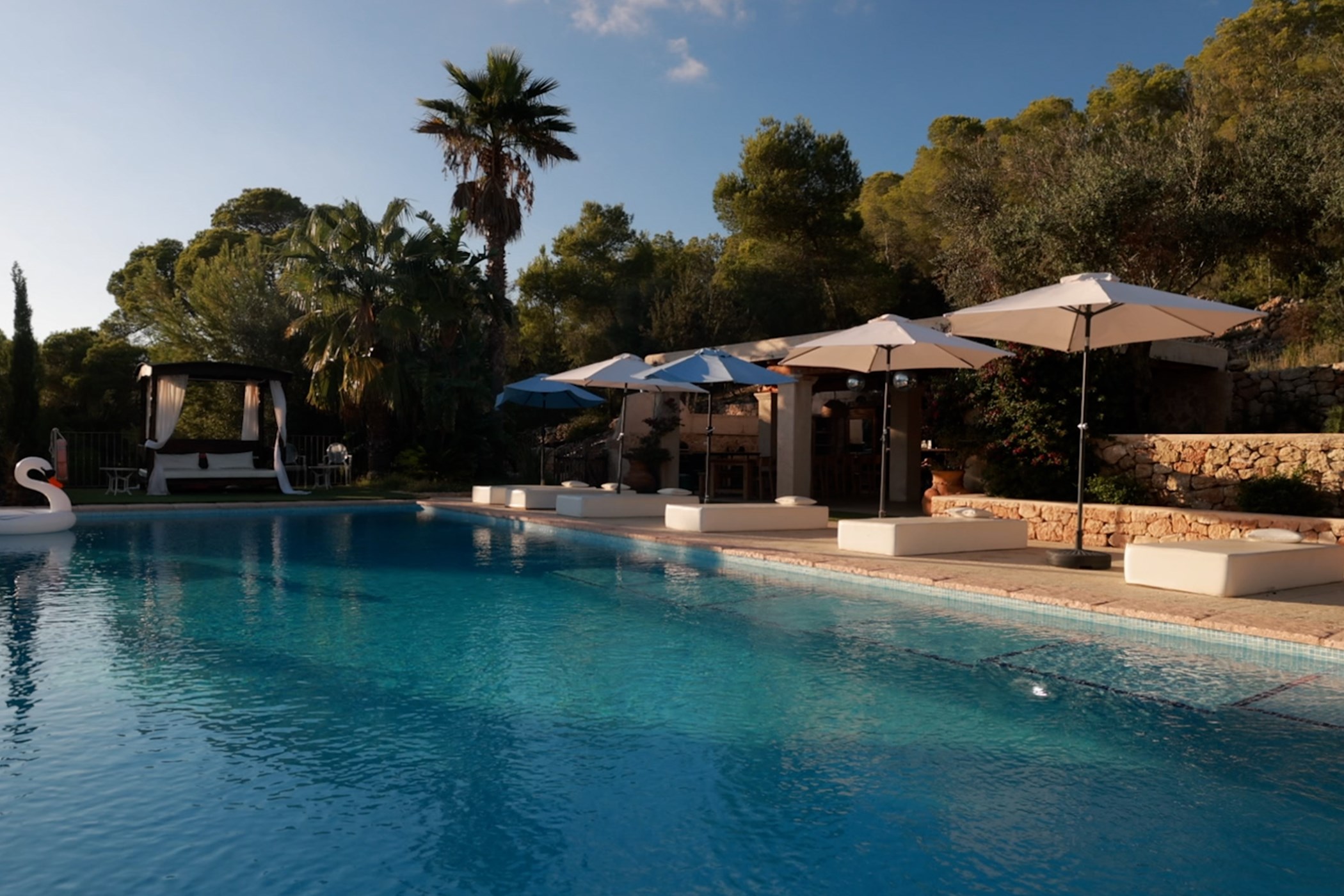 Among its distinguishing elements: a generous private pool at the centre of the grounds and an outdoor kitchen. The interiors are generous and well-proportioned, with neutral tones that allow the Mediterranean light to do the rest.