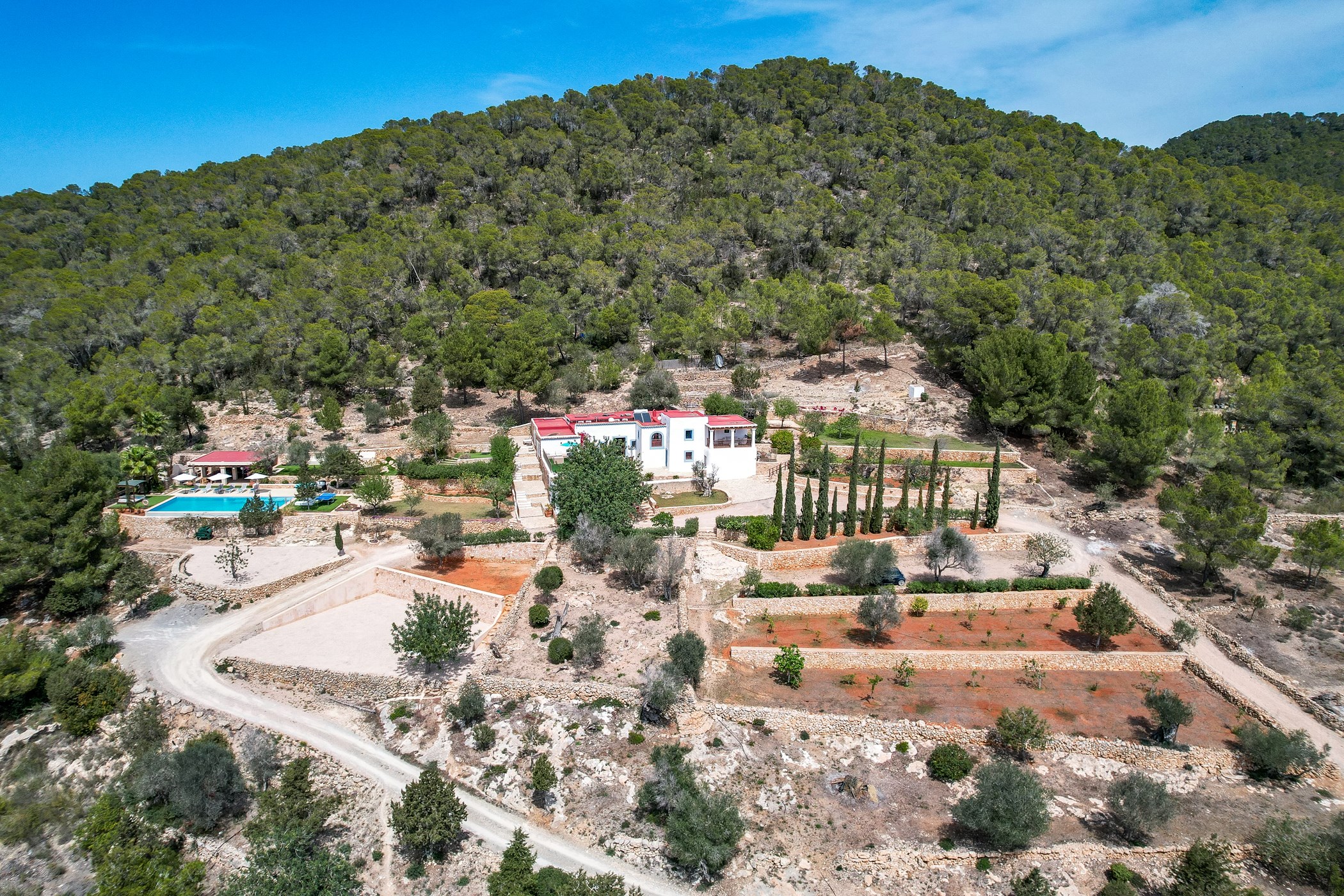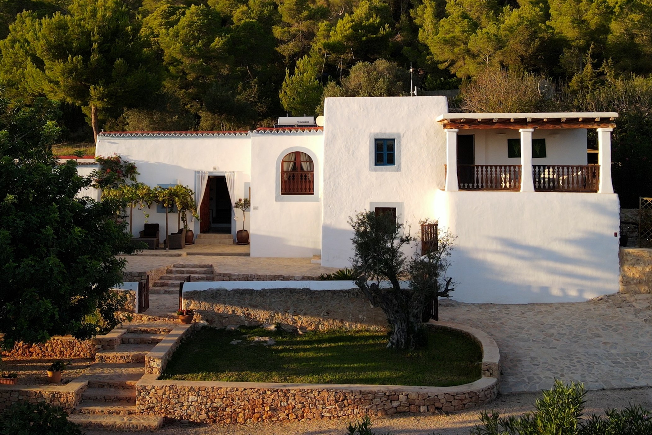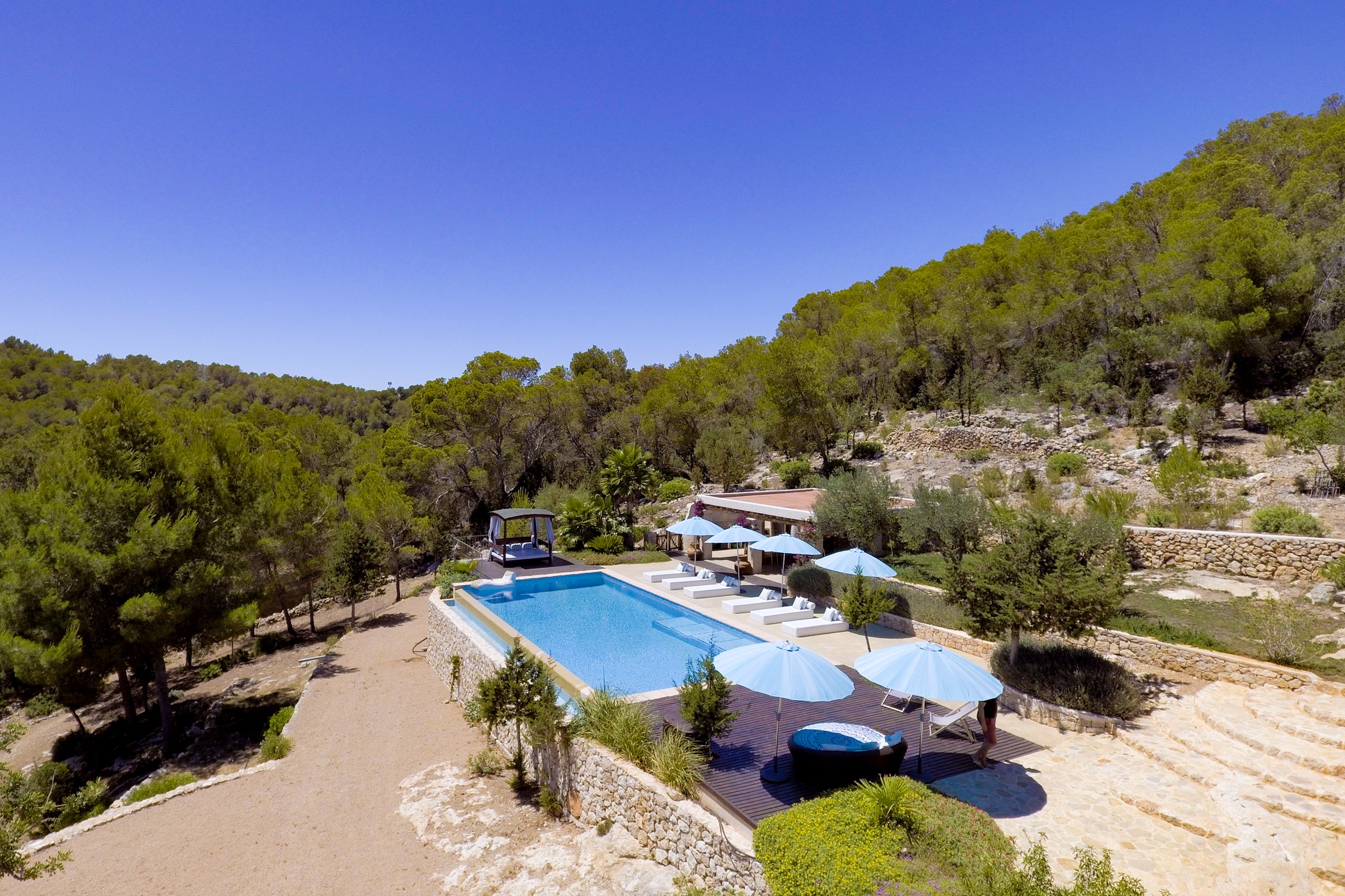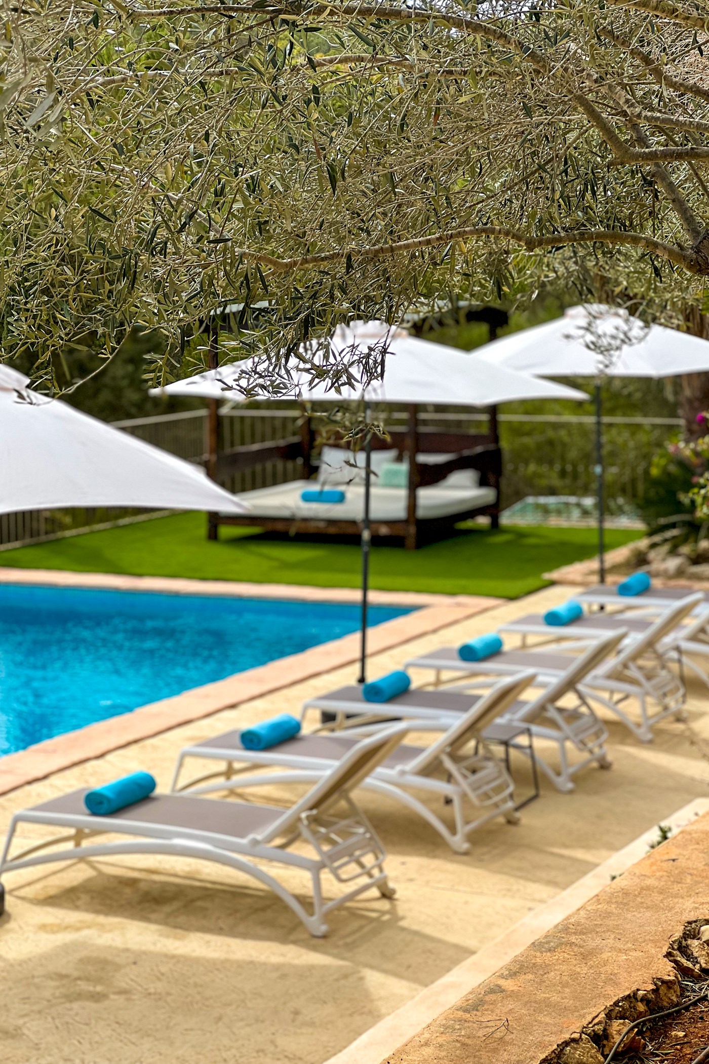 Among its distinguishing elements: a generous private pool at the centre of the grounds and an outdoor kitchen. The interiors are generous and well-proportioned, with neutral tones that allow the Mediterranean light to do the rest.