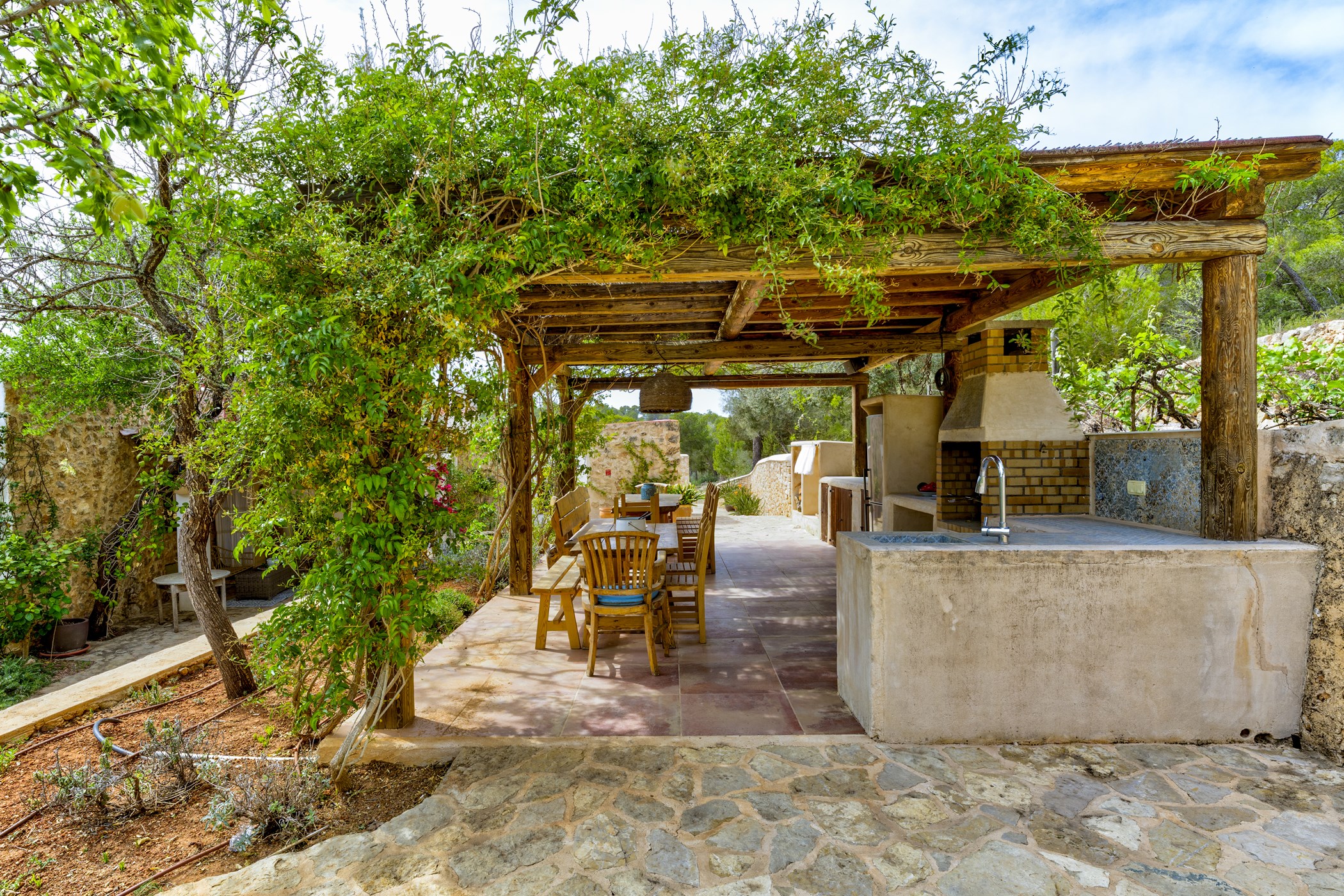 A private swimming pool anchors the outdoor space, framed by sun loungers and shaded seating. The barbecue and al fresco dining area invite long outdoor meals. A fully equipped outdoor kitchen extends the living space into the open air. Mature Mediterranean gardens provide both shade and fragrance. West-facing terraces capture the evening light in full.