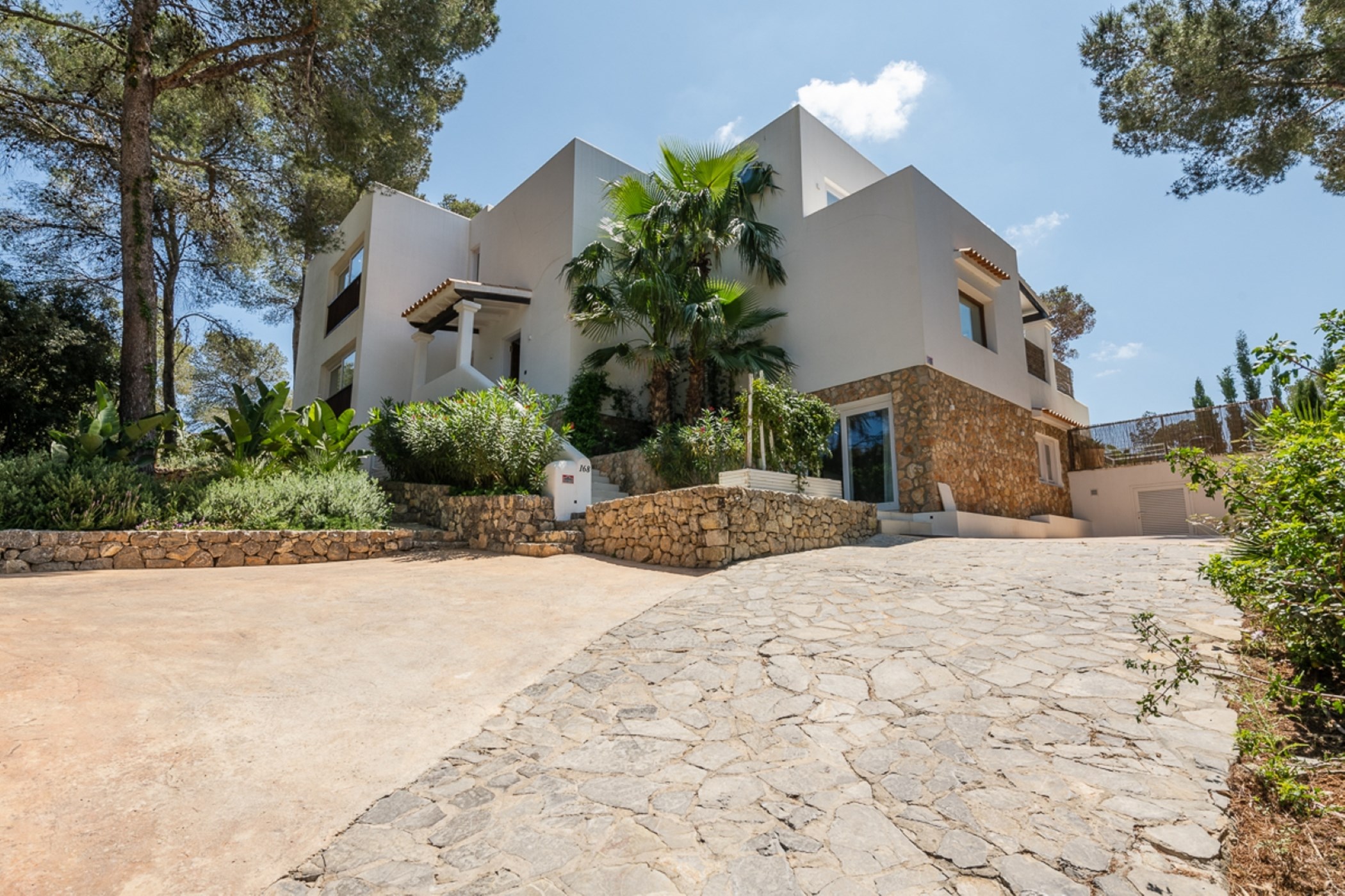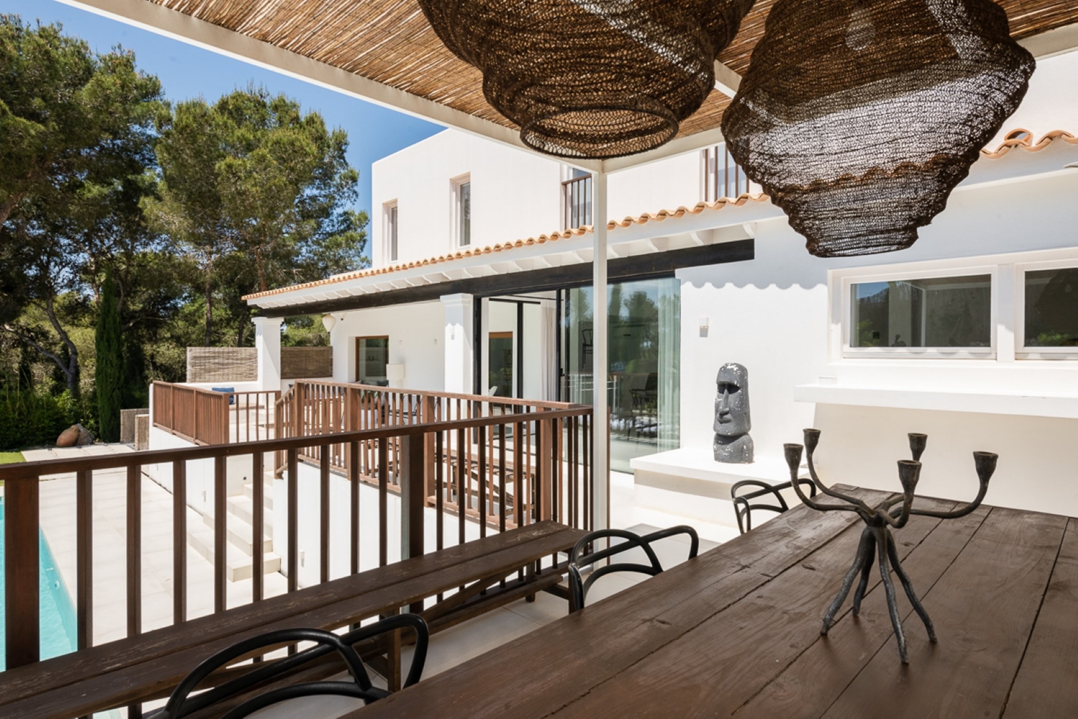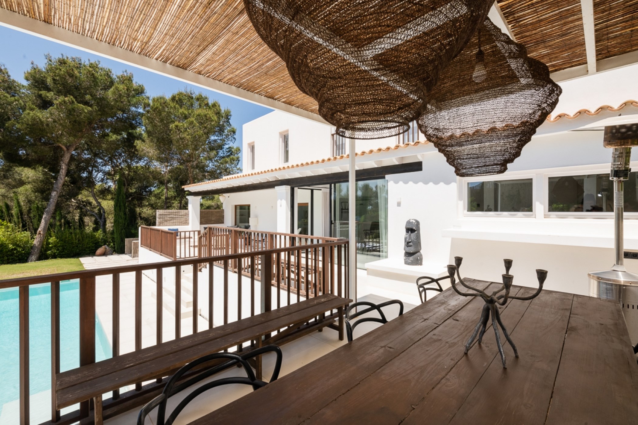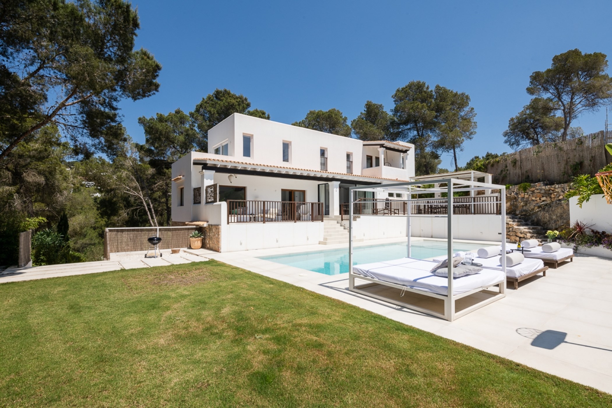 Among its distinguishing elements: a generous private pool at the centre of the grounds. The interiors are generous and well-proportioned, with neutral tones that allow the Mediterranean light to do the rest.