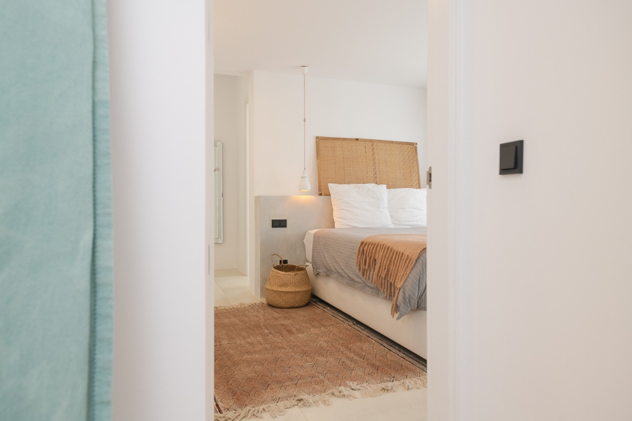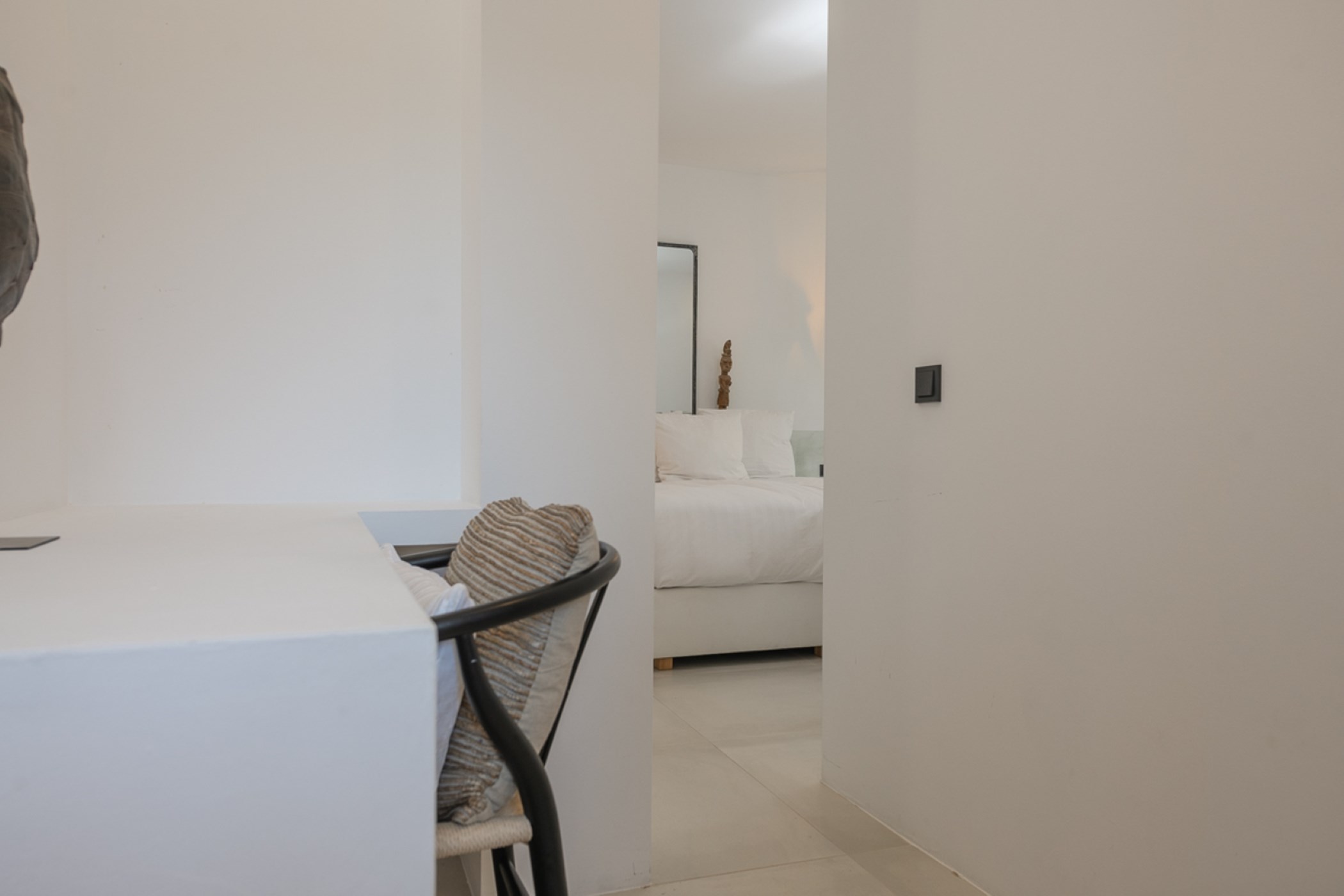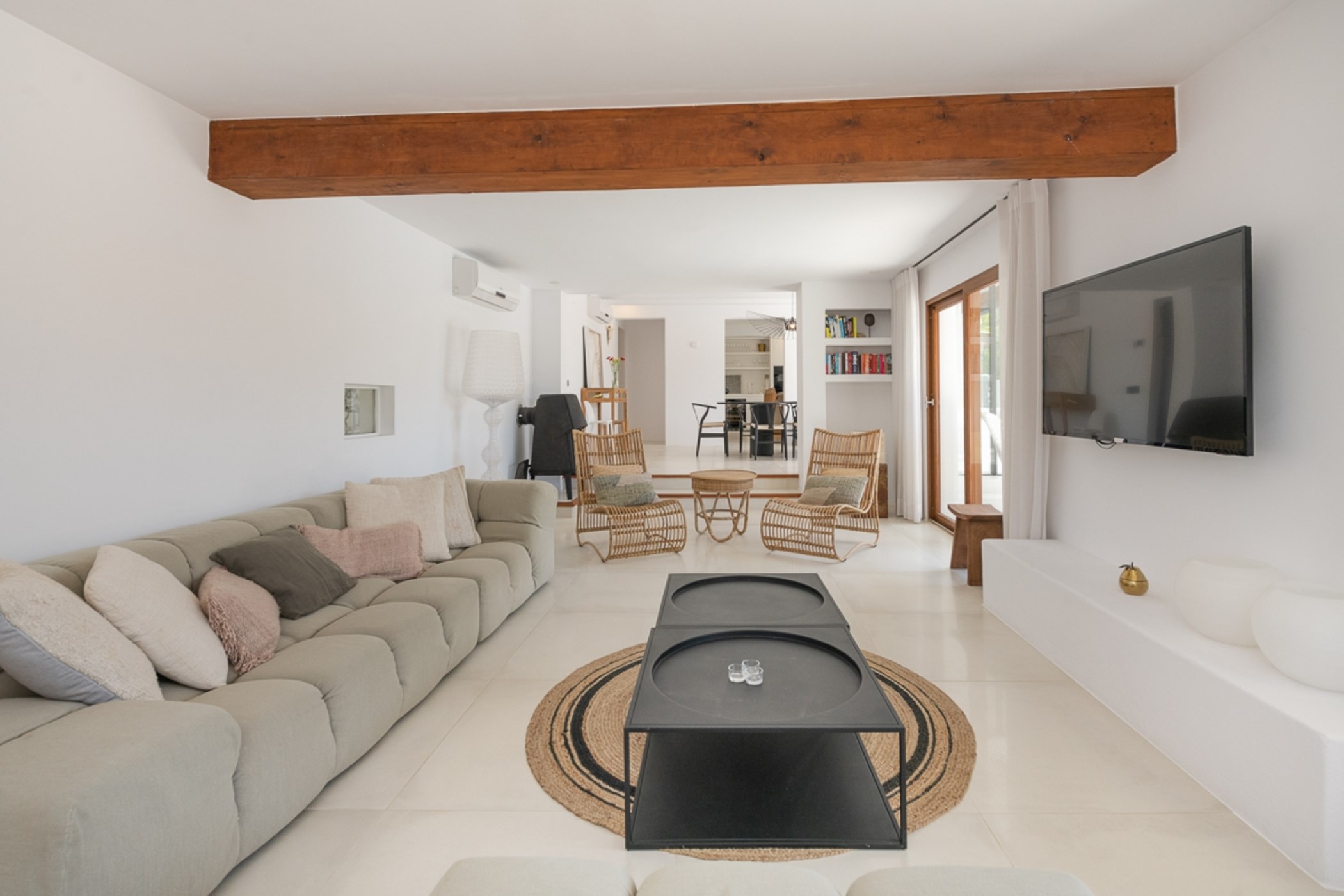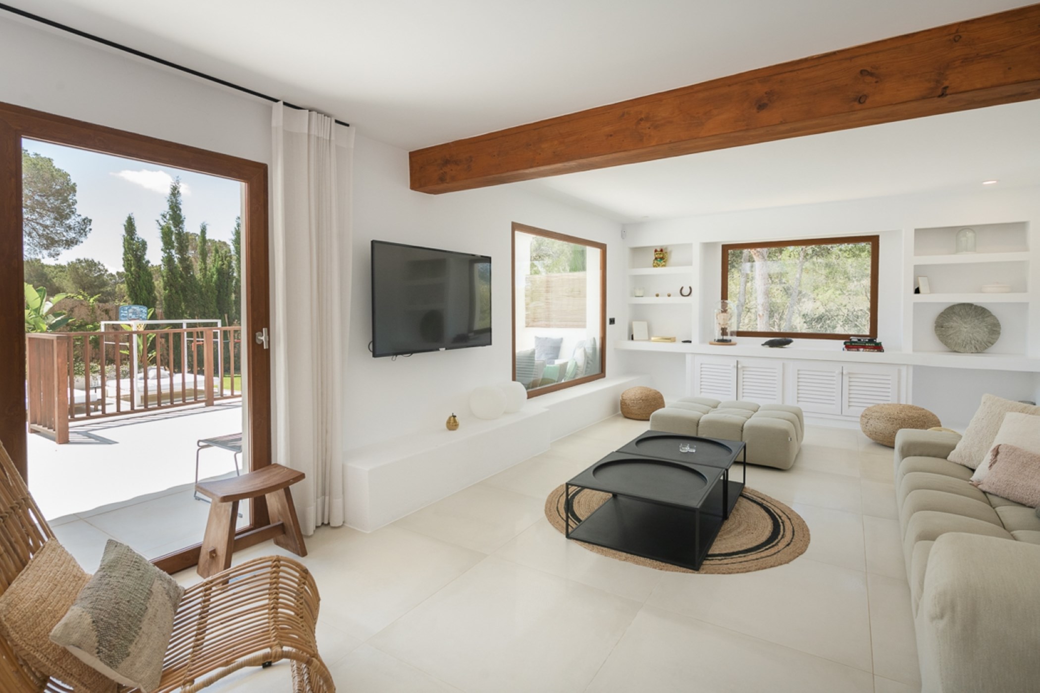 Among its distinguishing elements: a generous private pool at the centre of the grounds. The interiors are generous and well-proportioned, with neutral tones that allow the Mediterranean light to do the rest.