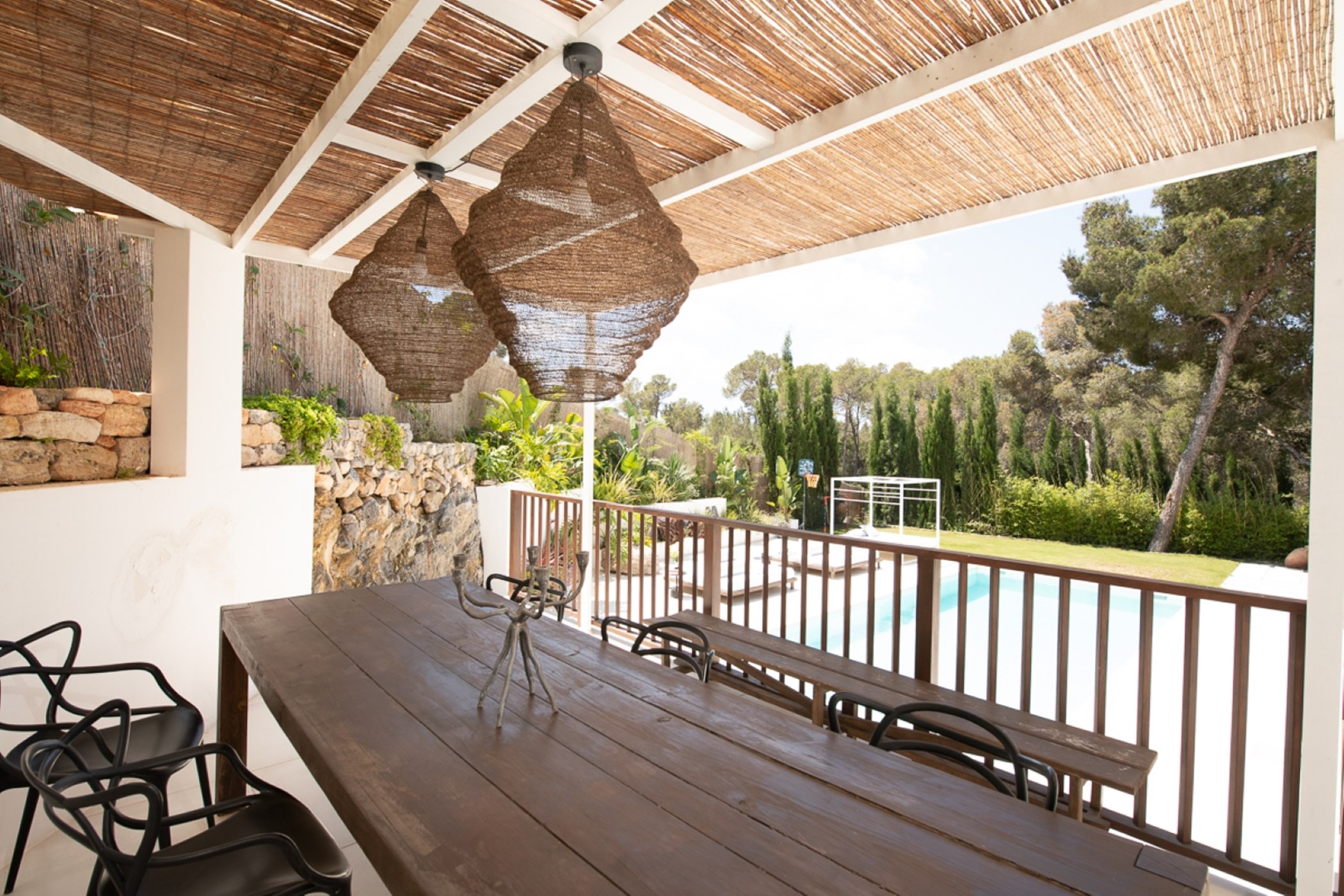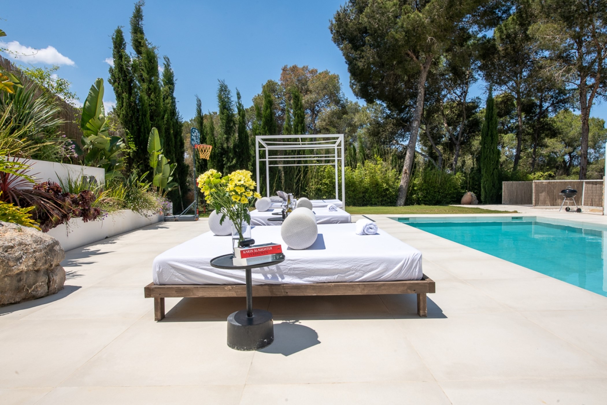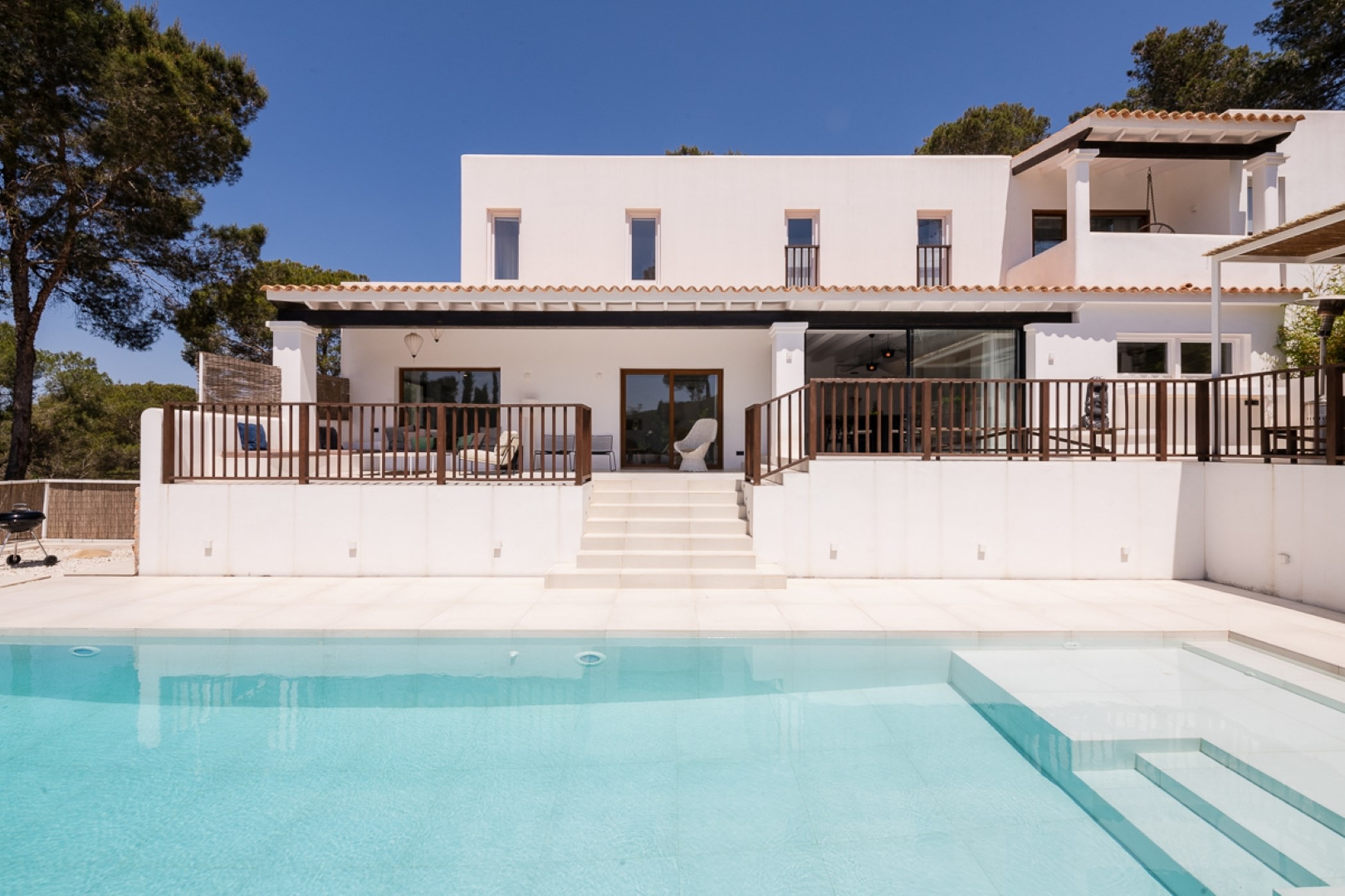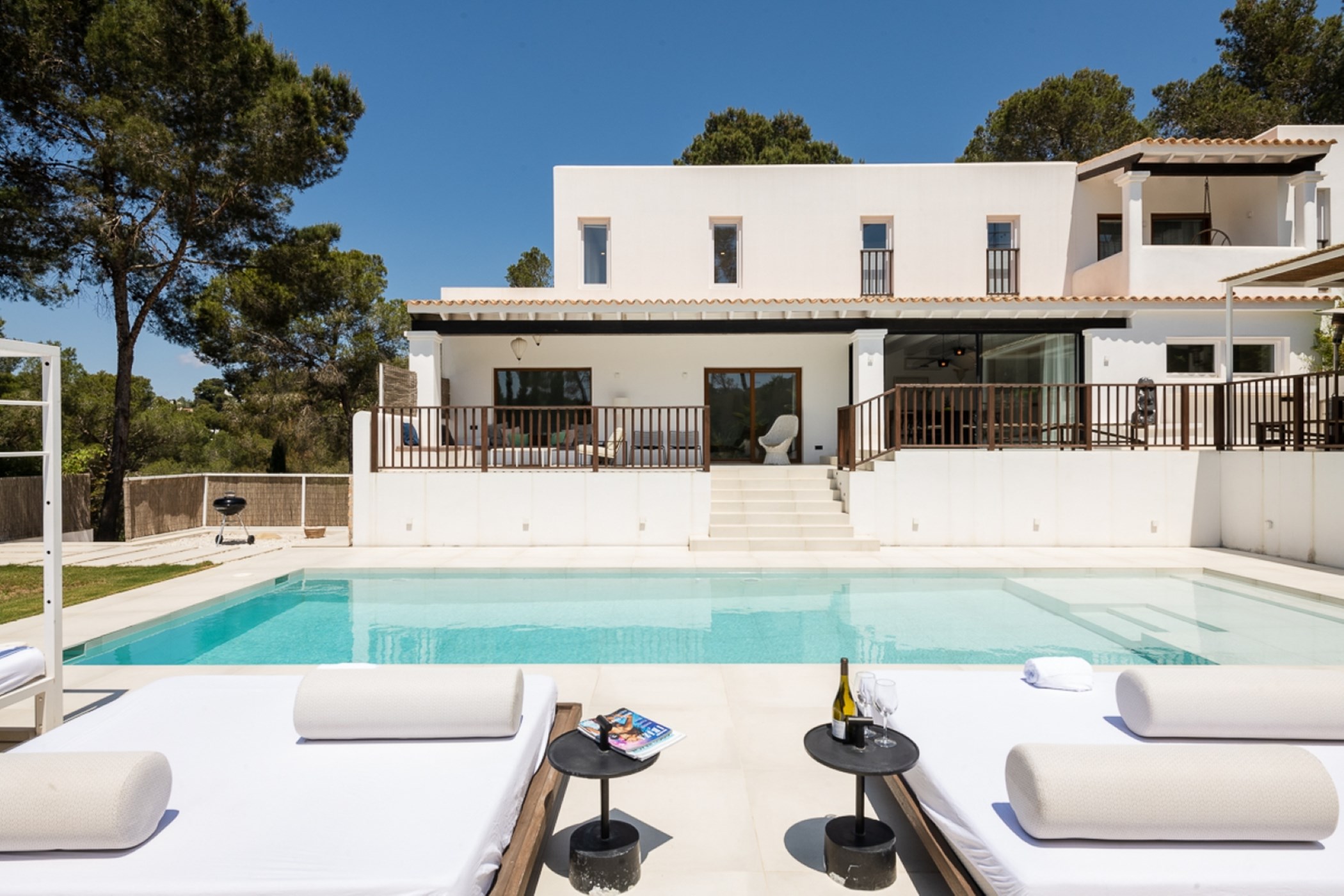 A private swimming pool anchors the outdoor space, framed by sun loungers and shaded seating. The barbecue and al fresco dining area invite long outdoor meals. Mature Mediterranean gardens provide both shade and fragrance.