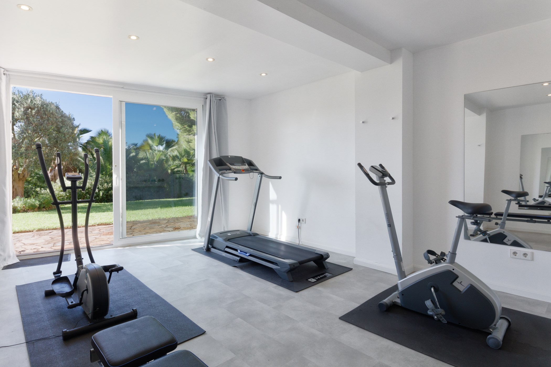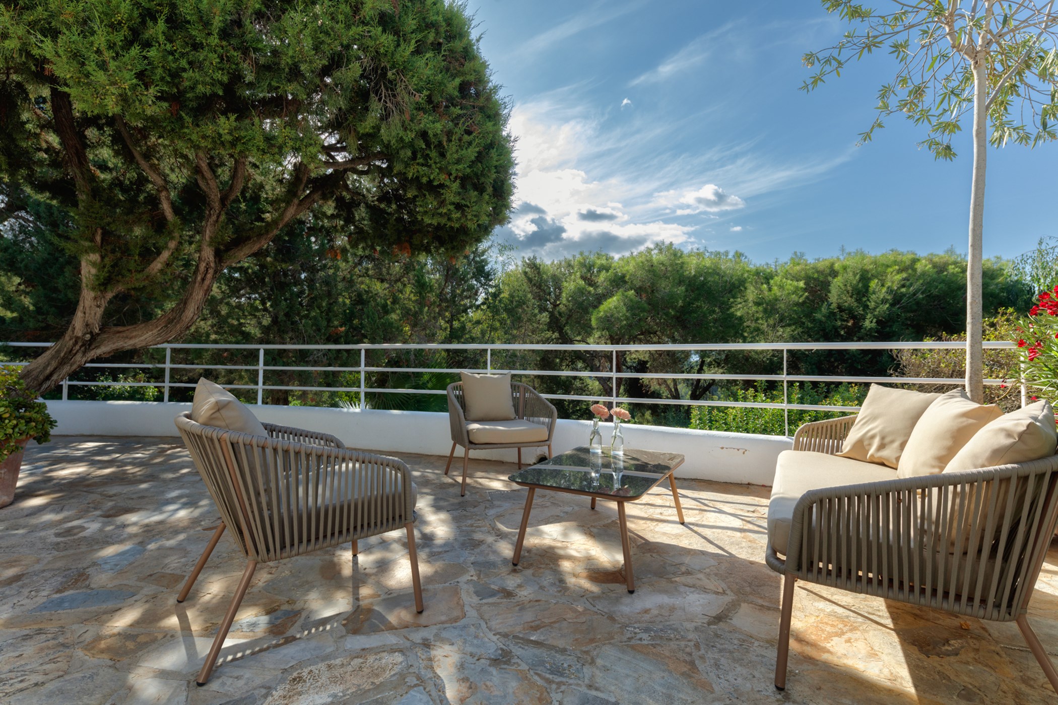 A private swimming pool anchors the outdoor space, framed by sun loungers and shaded seating. The barbecue and al fresco dining area invite long outdoor meals. A fully equipped outdoor kitchen extends the living space into the open air. Mature Mediterranean gardens provide both shade and fragrance. Terraces are oriented to maximise the sea views.