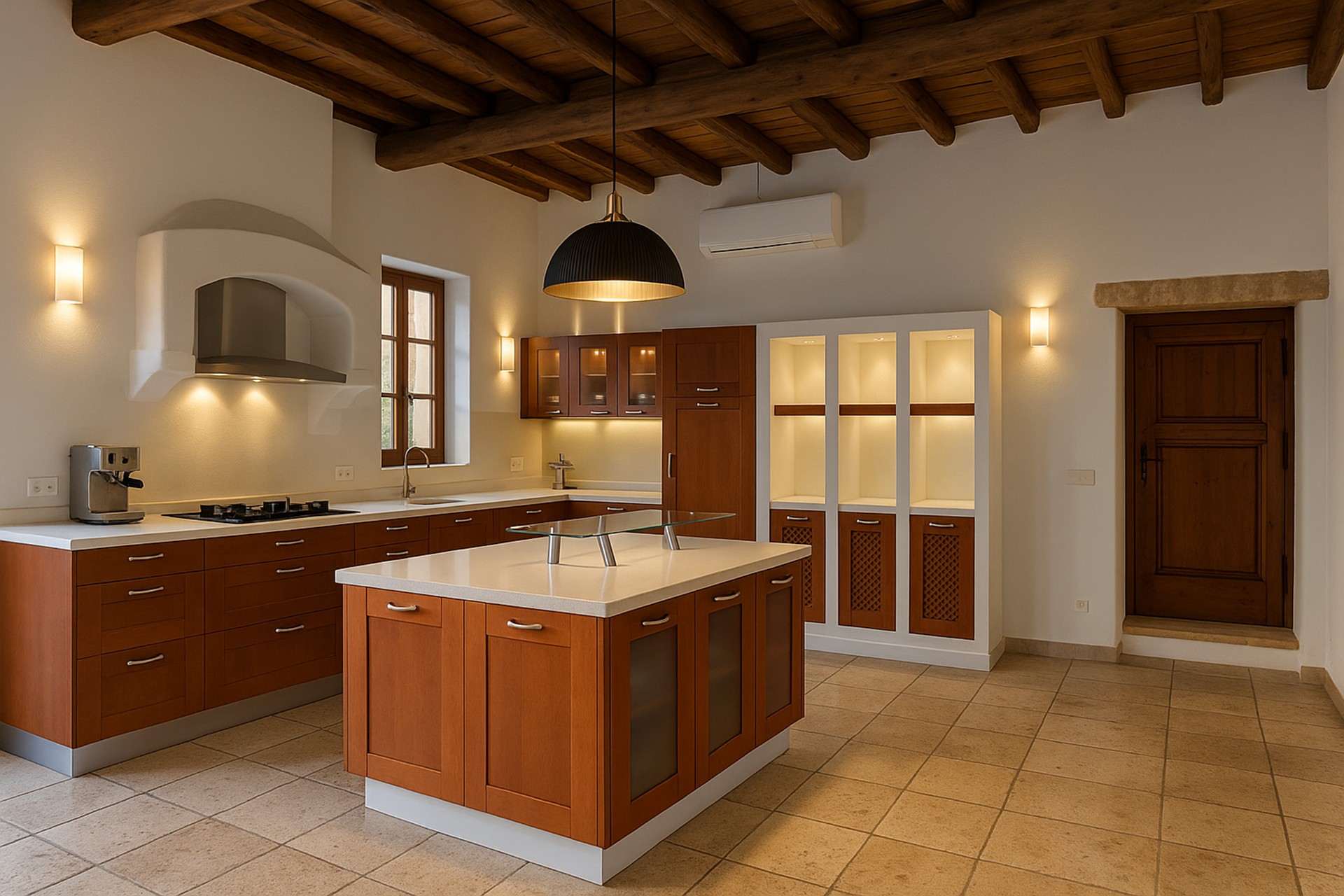 The interiors are generous and well-proportioned, dressed in neutral tones that allow the Mediterranean light — and the landscape beyond the windows — to be the protagonists. Living spaces move naturally from inside to outside.