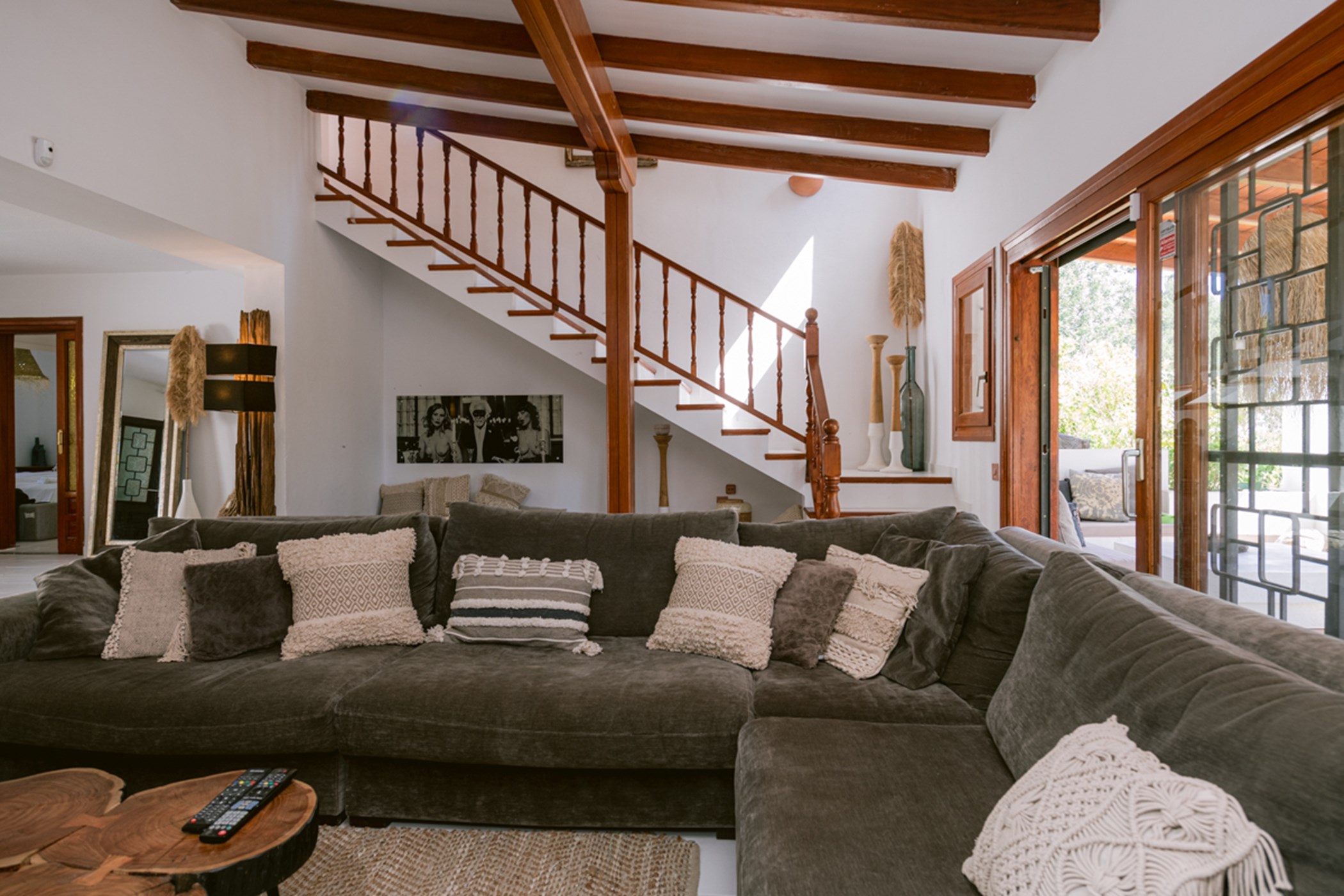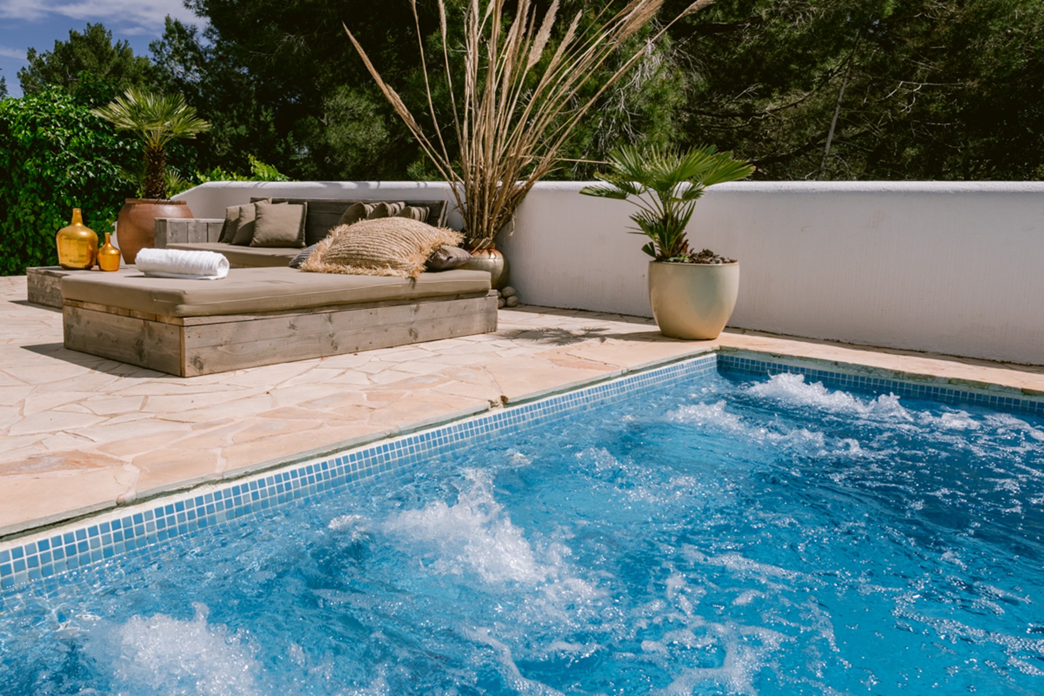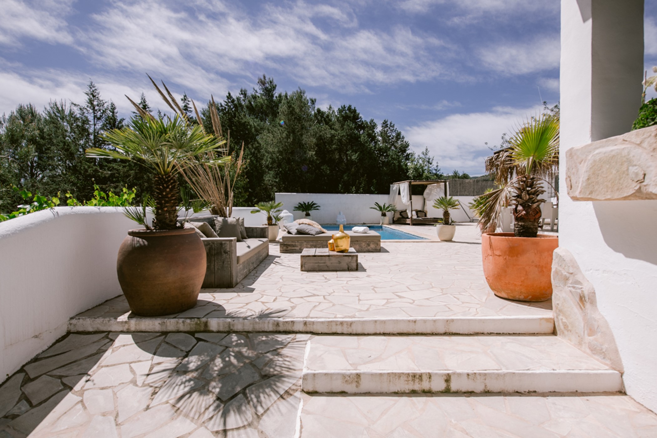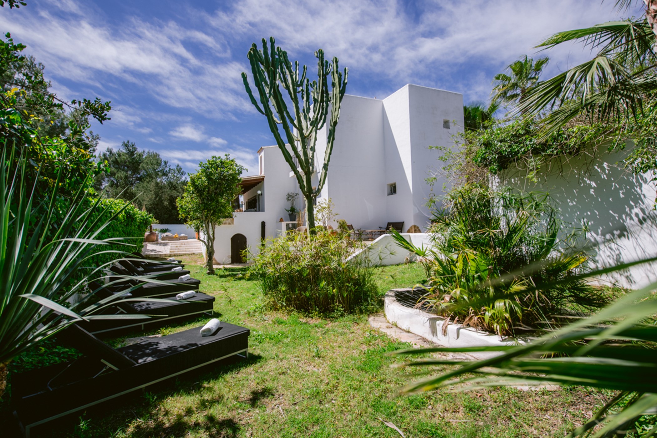 Among its distinguishing elements: a generous private pool at the centre of the grounds. The interiors are generous and well-proportioned, with neutral tones that allow the Mediterranean light to do the rest.