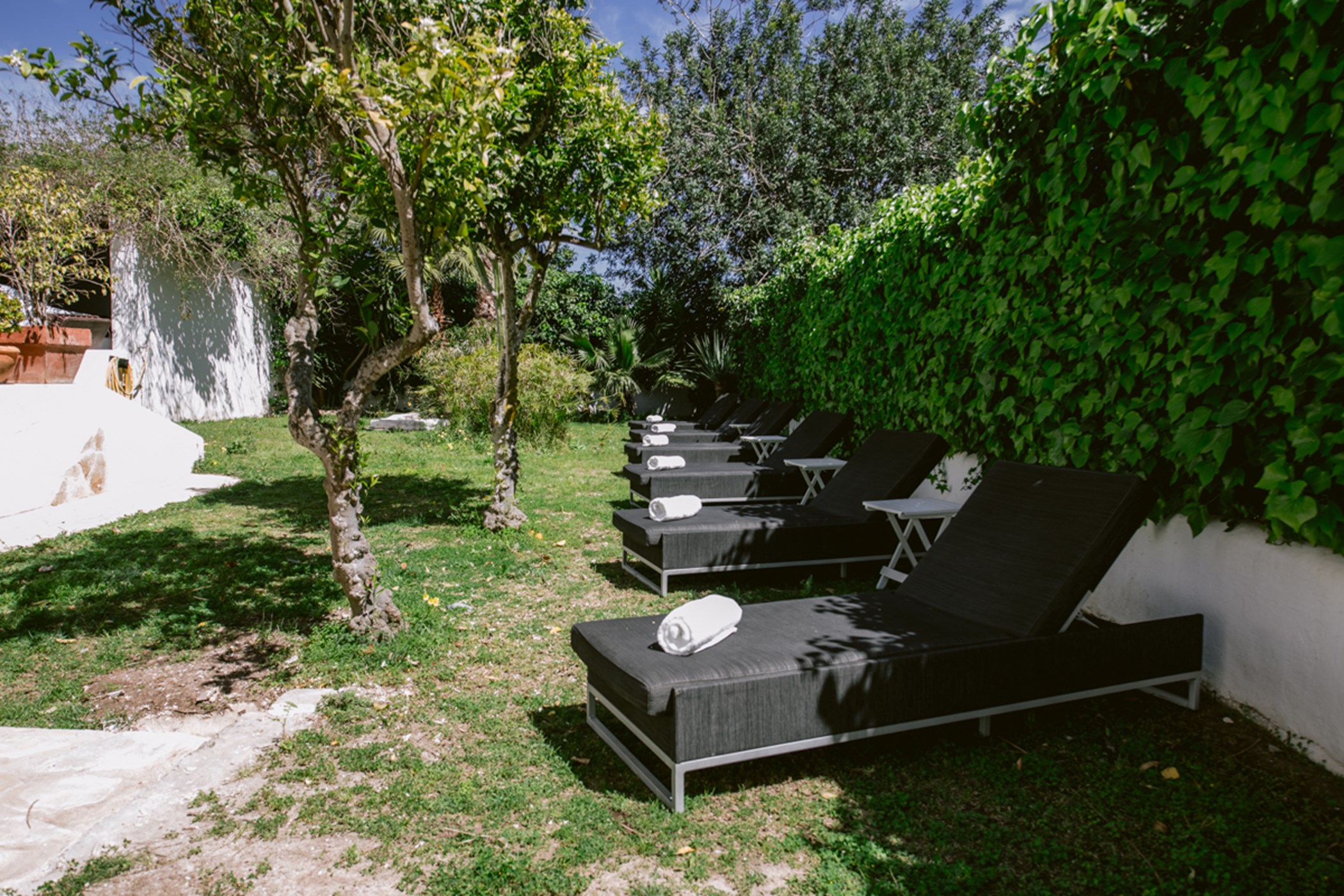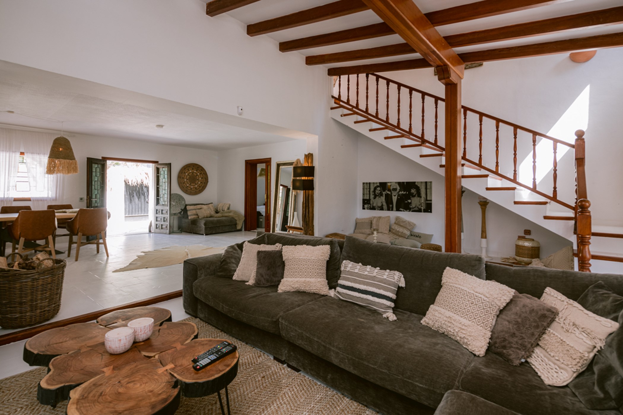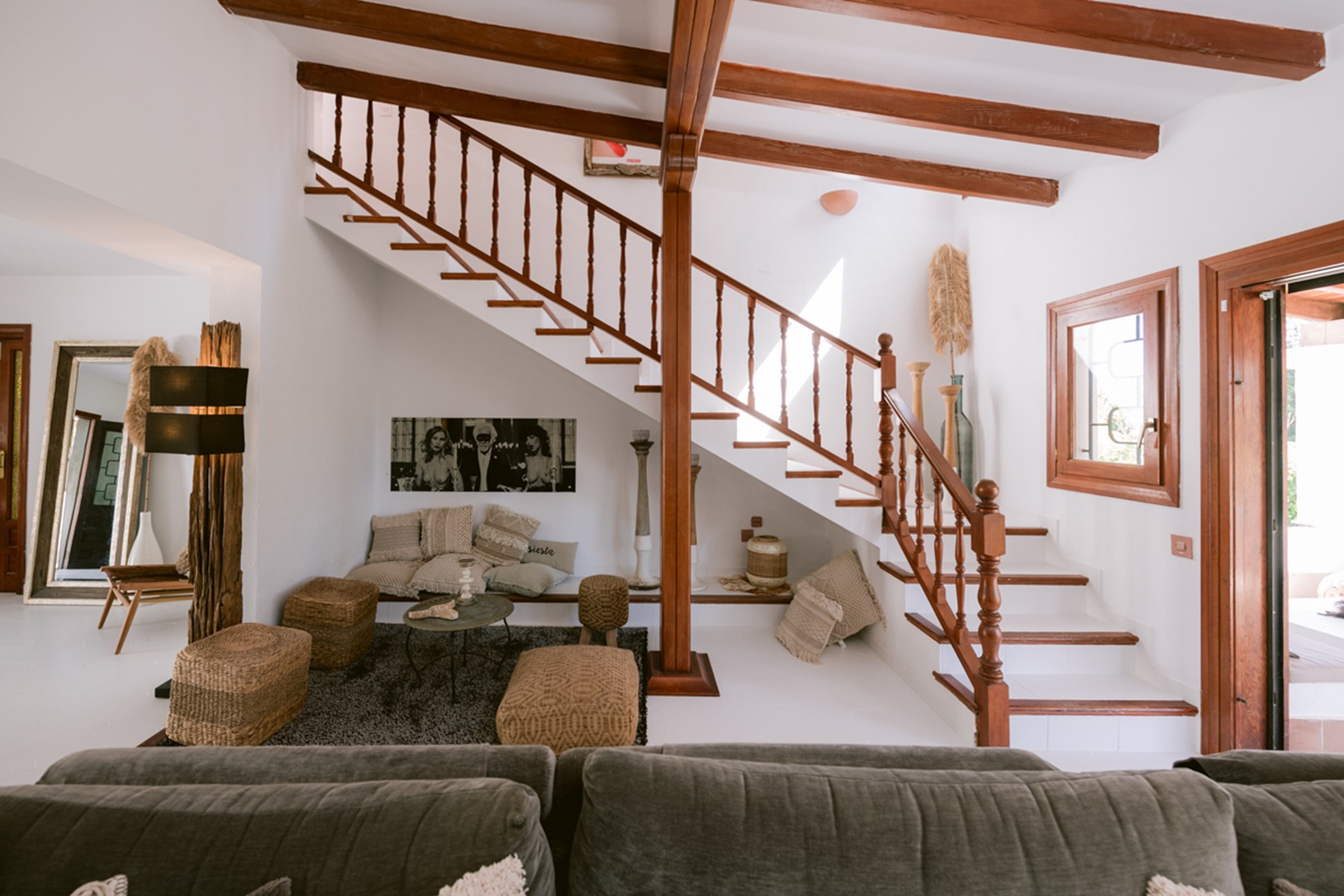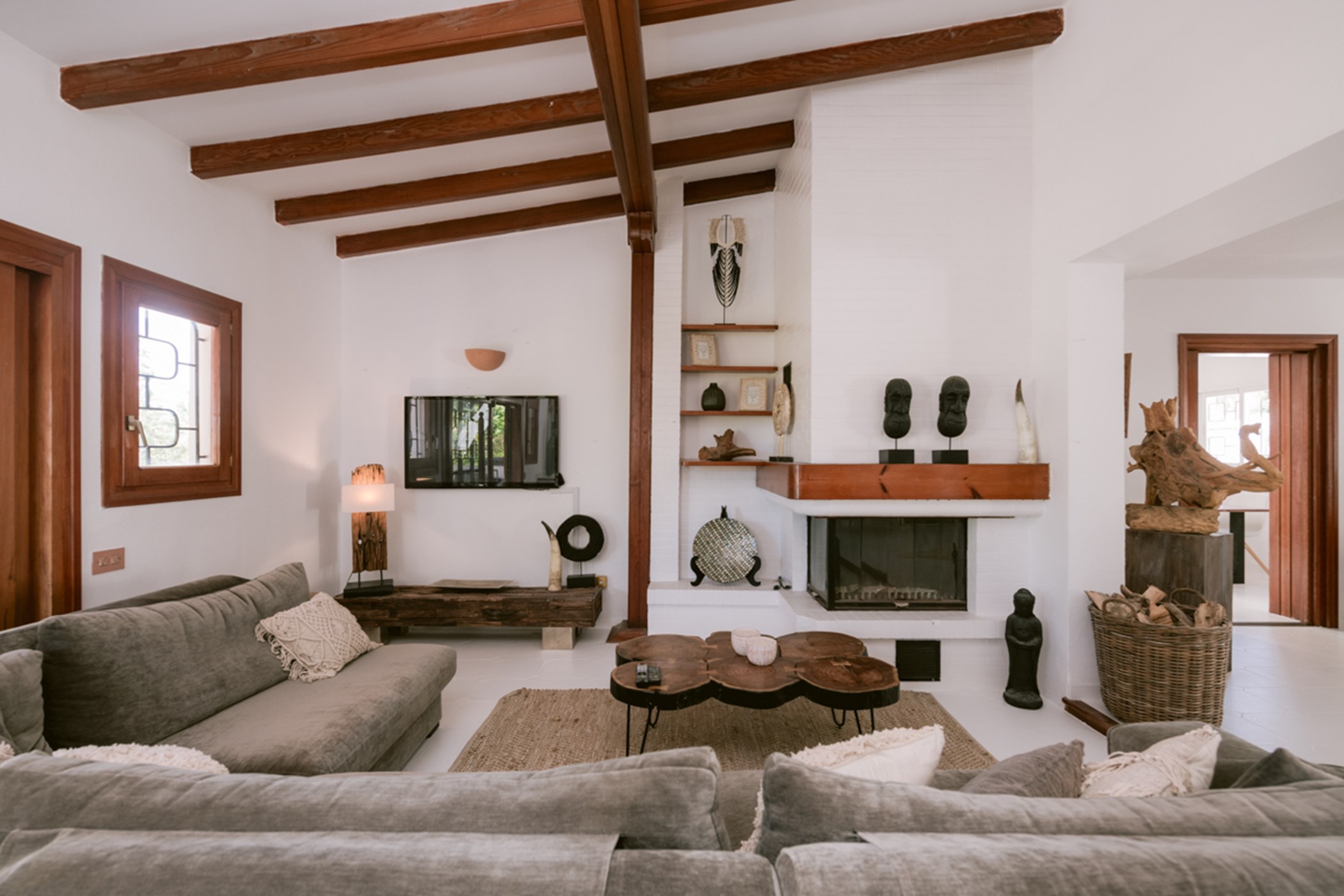 Among its distinguishing elements: a generous private pool at the centre of the grounds. The interiors are generous and well-proportioned, with neutral tones that allow the Mediterranean light to do the rest.