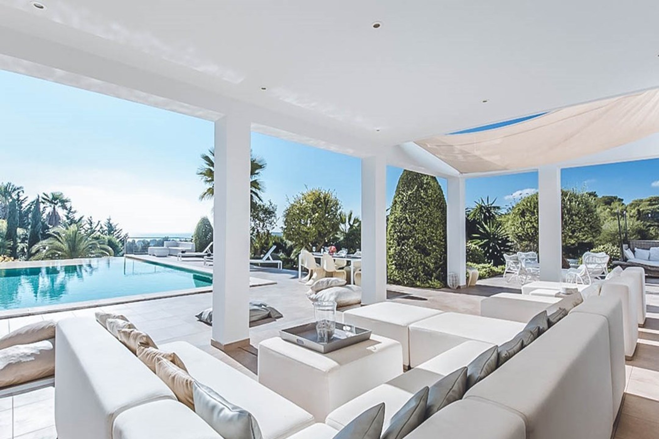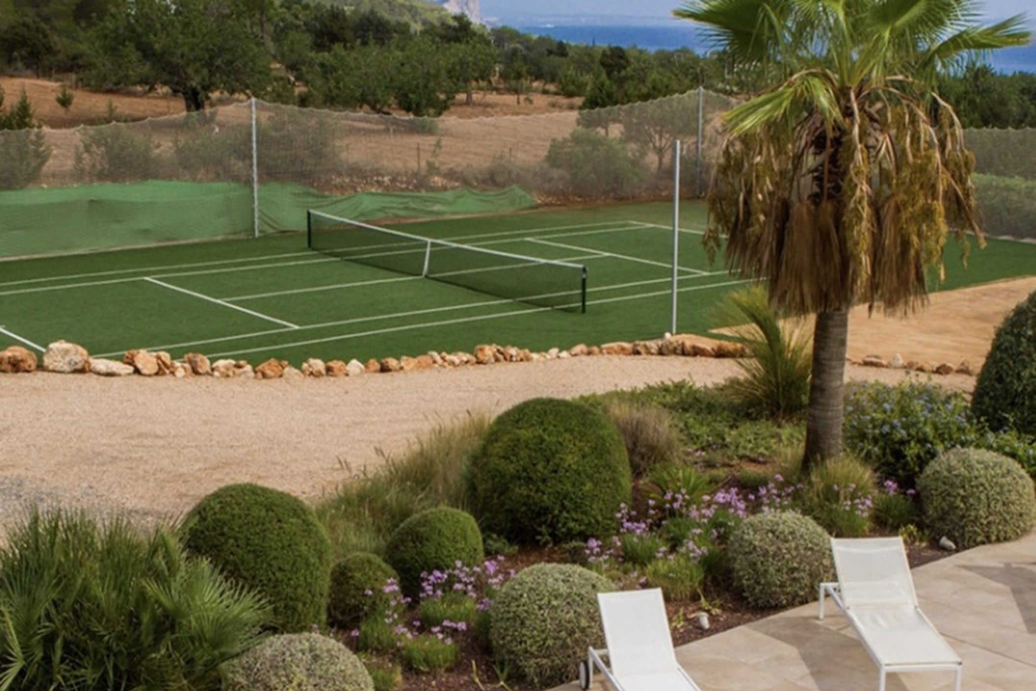 Among its distinguishing elements: a generous private pool at the centre of the grounds and its own tennis court. The interiors are generous and well-proportioned, with neutral tones that allow the Mediterranean light to do the rest.