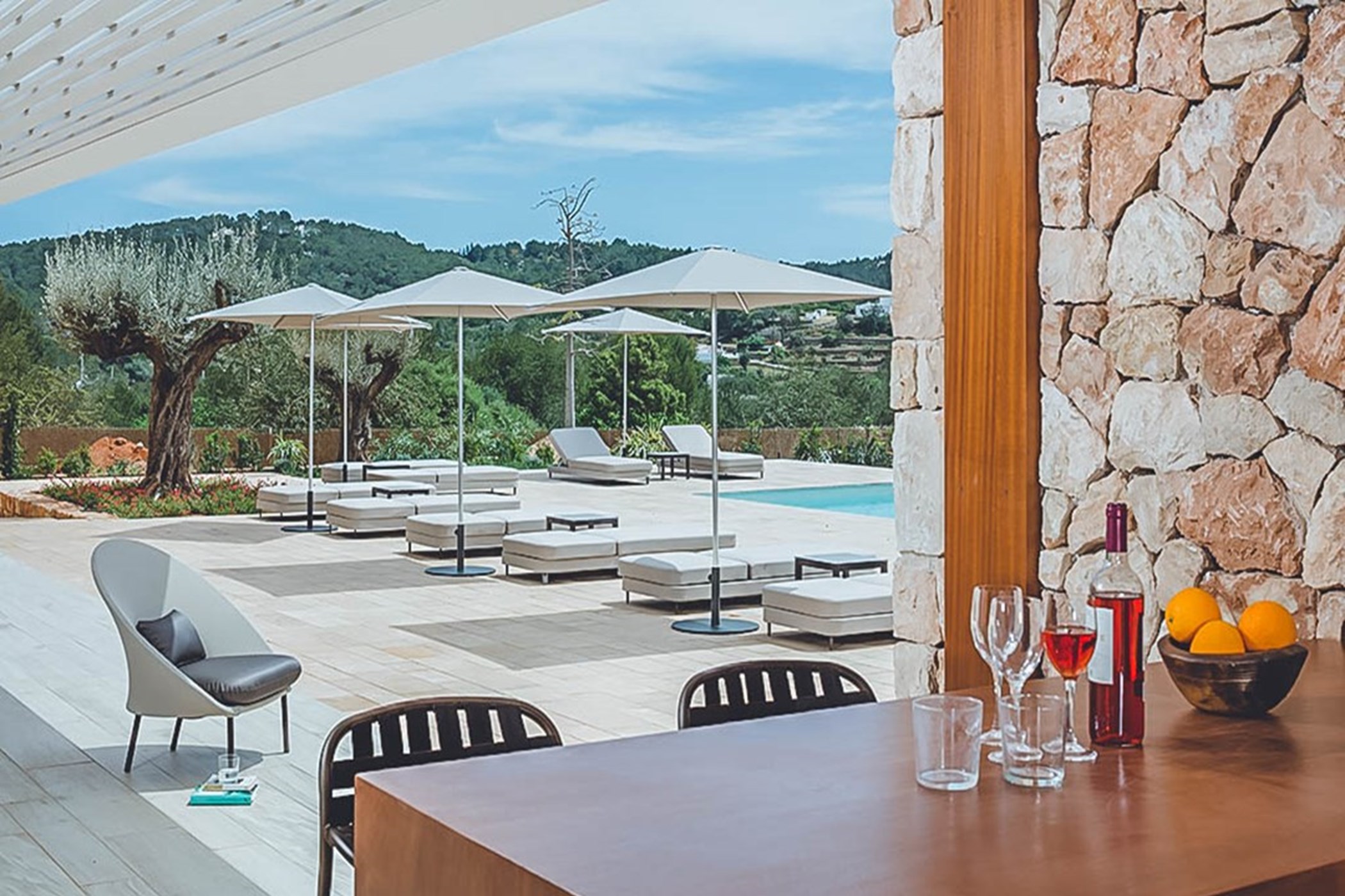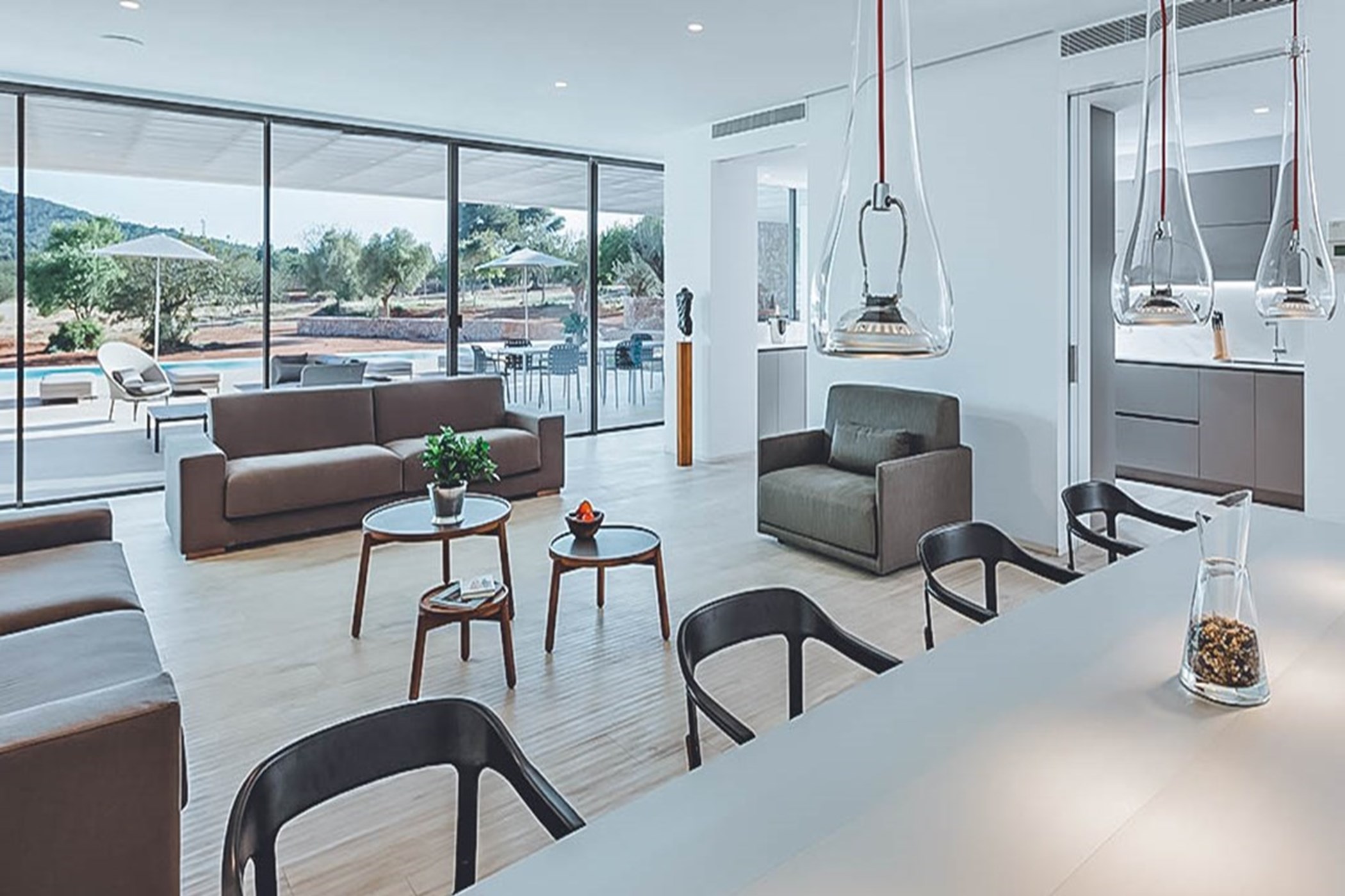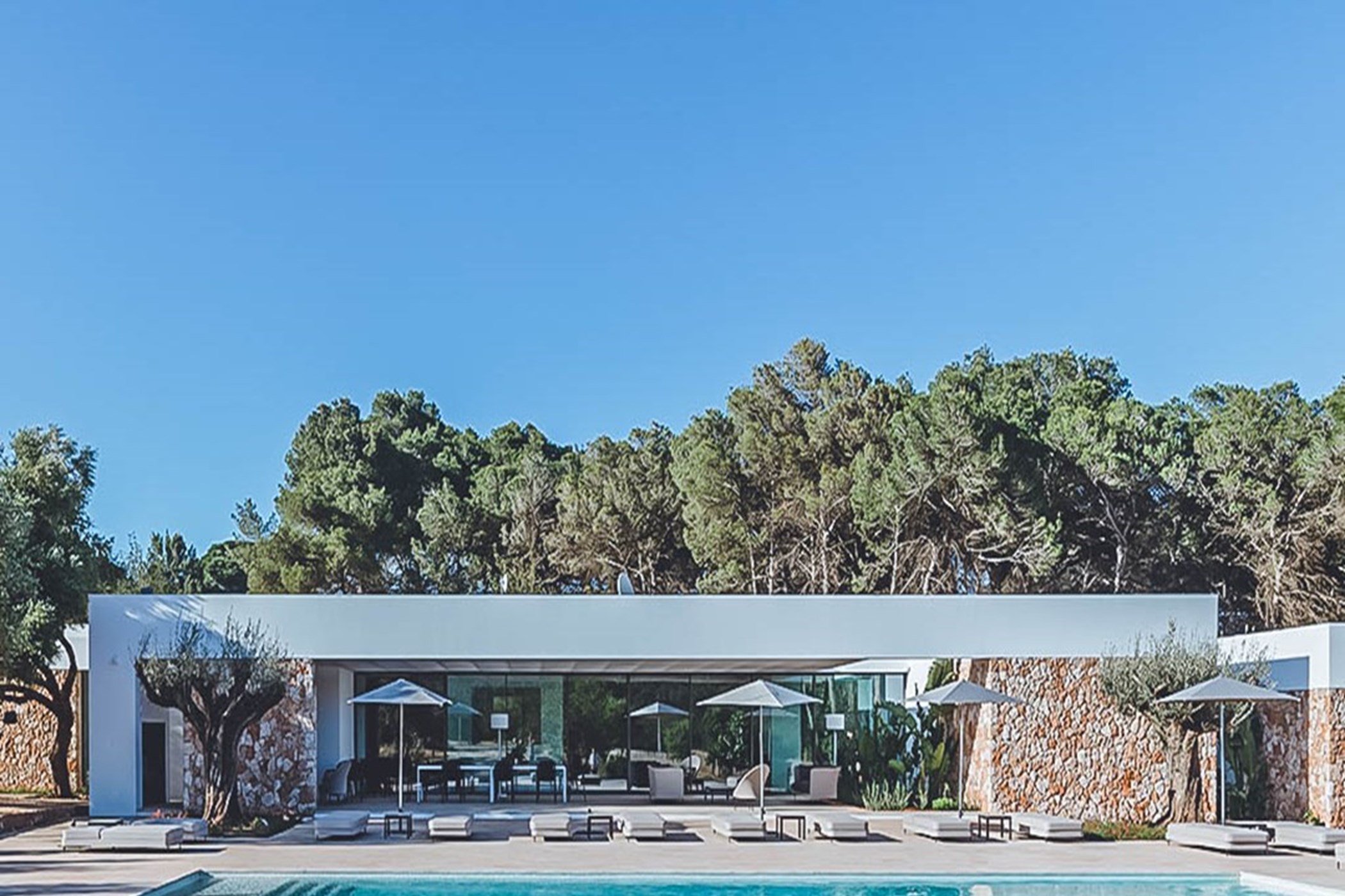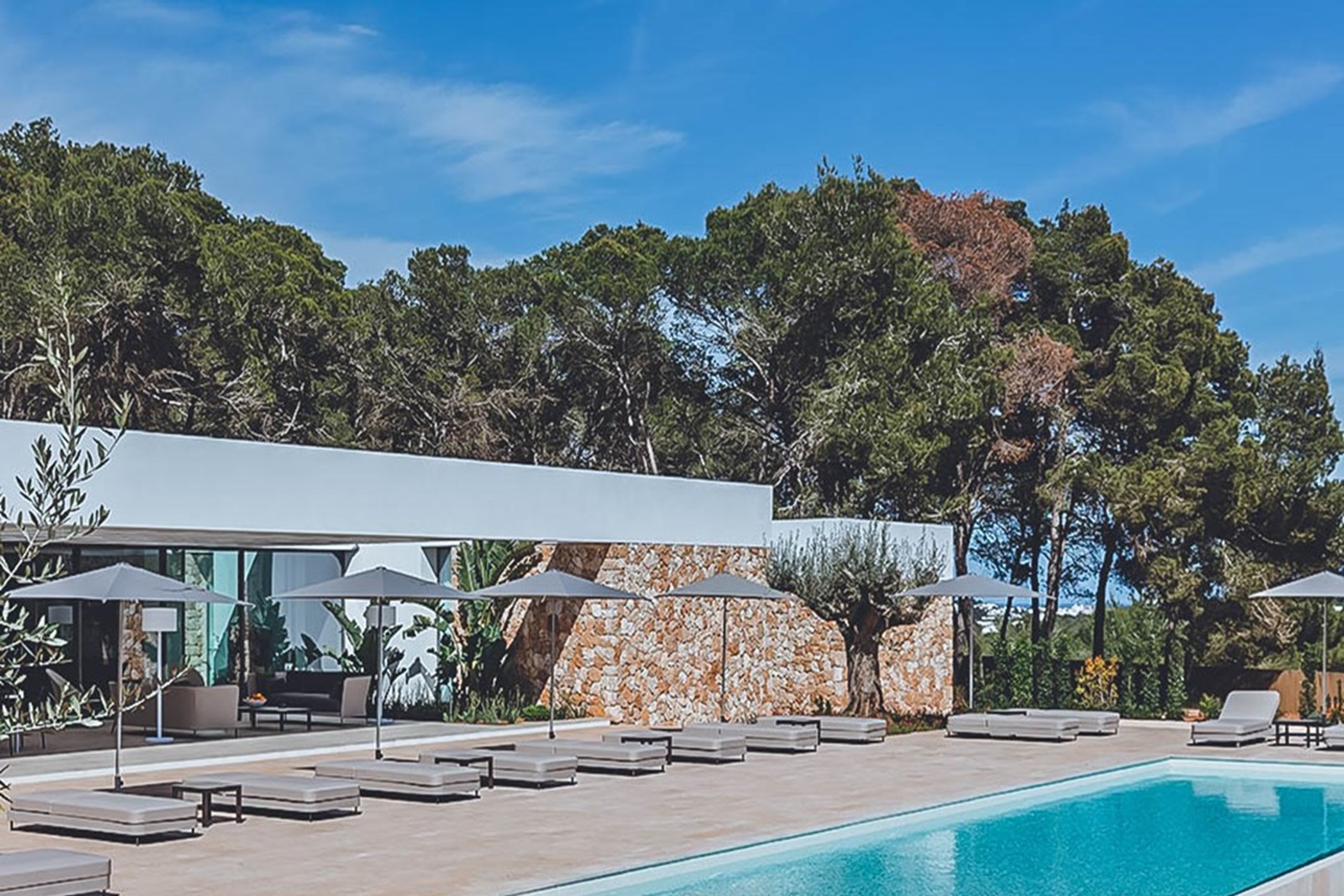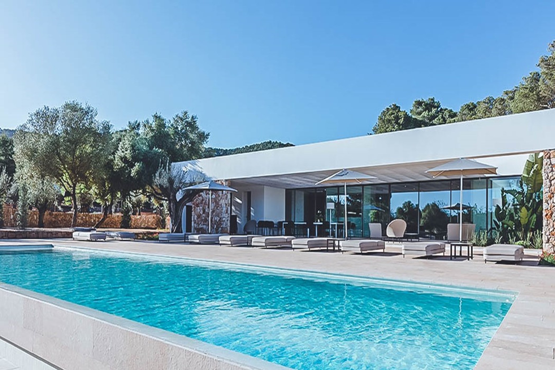 Among its distinguishing elements: an infinity pool that merges visually with the horizon and an outdoor kitchen. The interiors are generous and well-proportioned, with neutral tones that allow the Mediterranean light to do the rest.