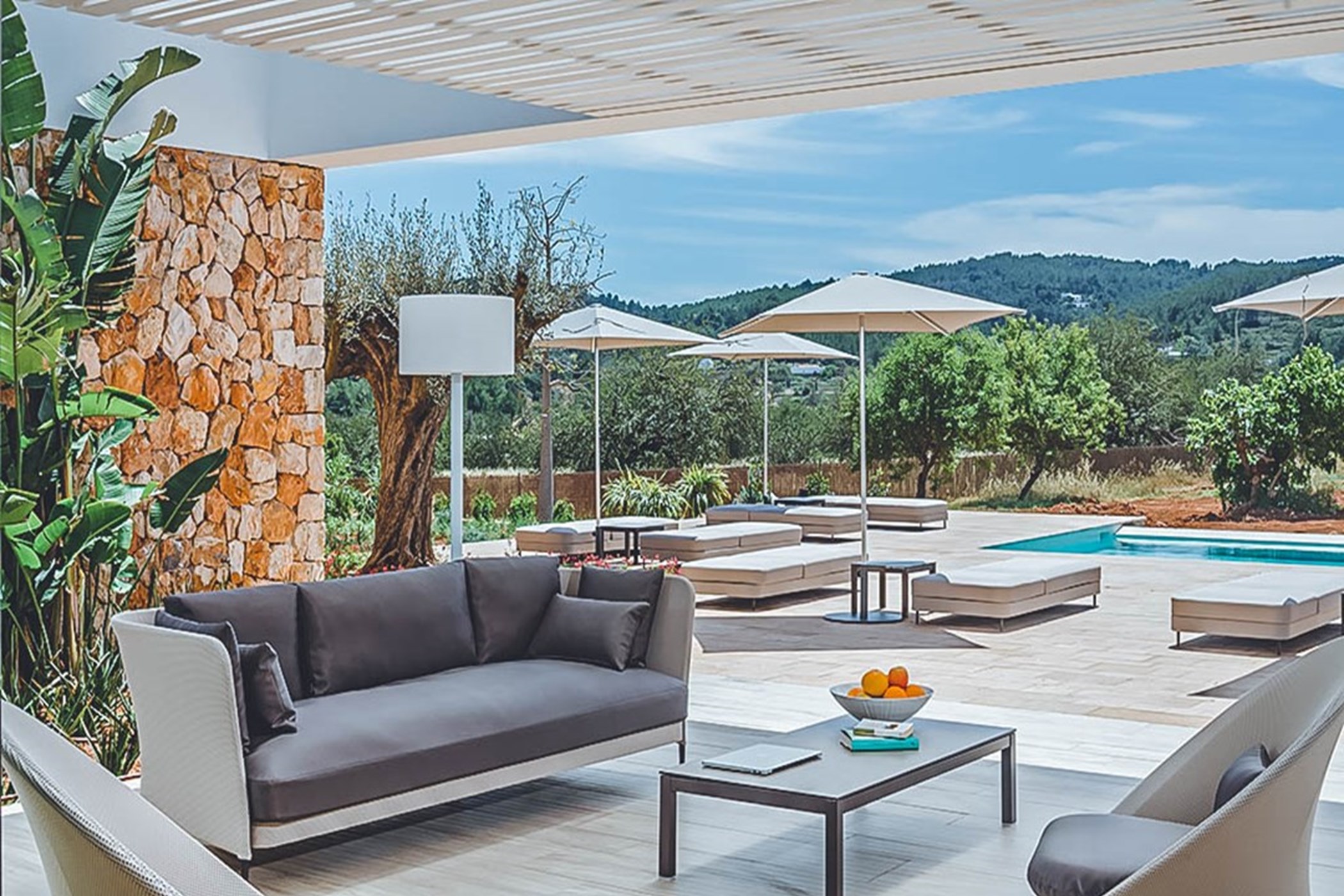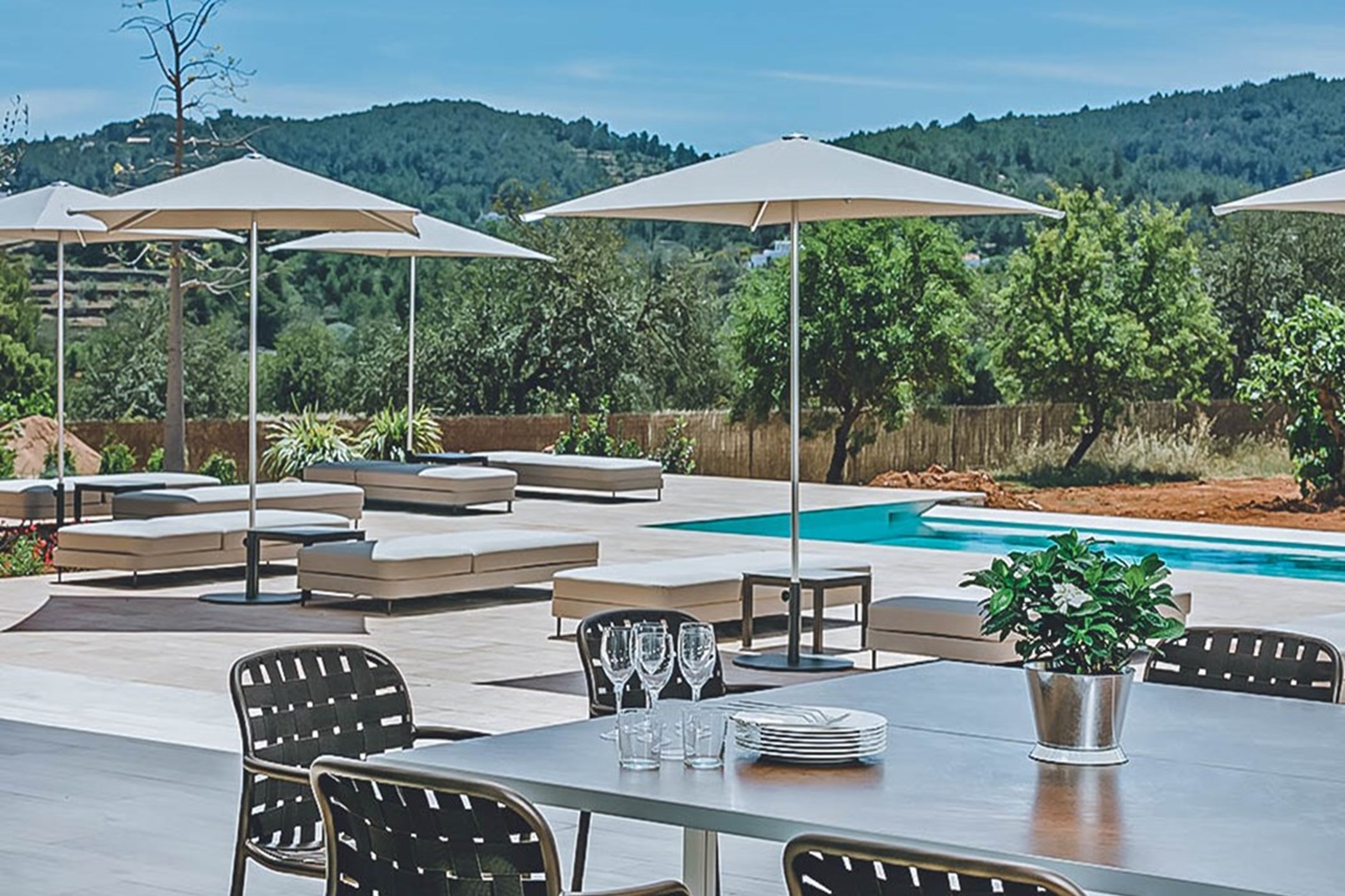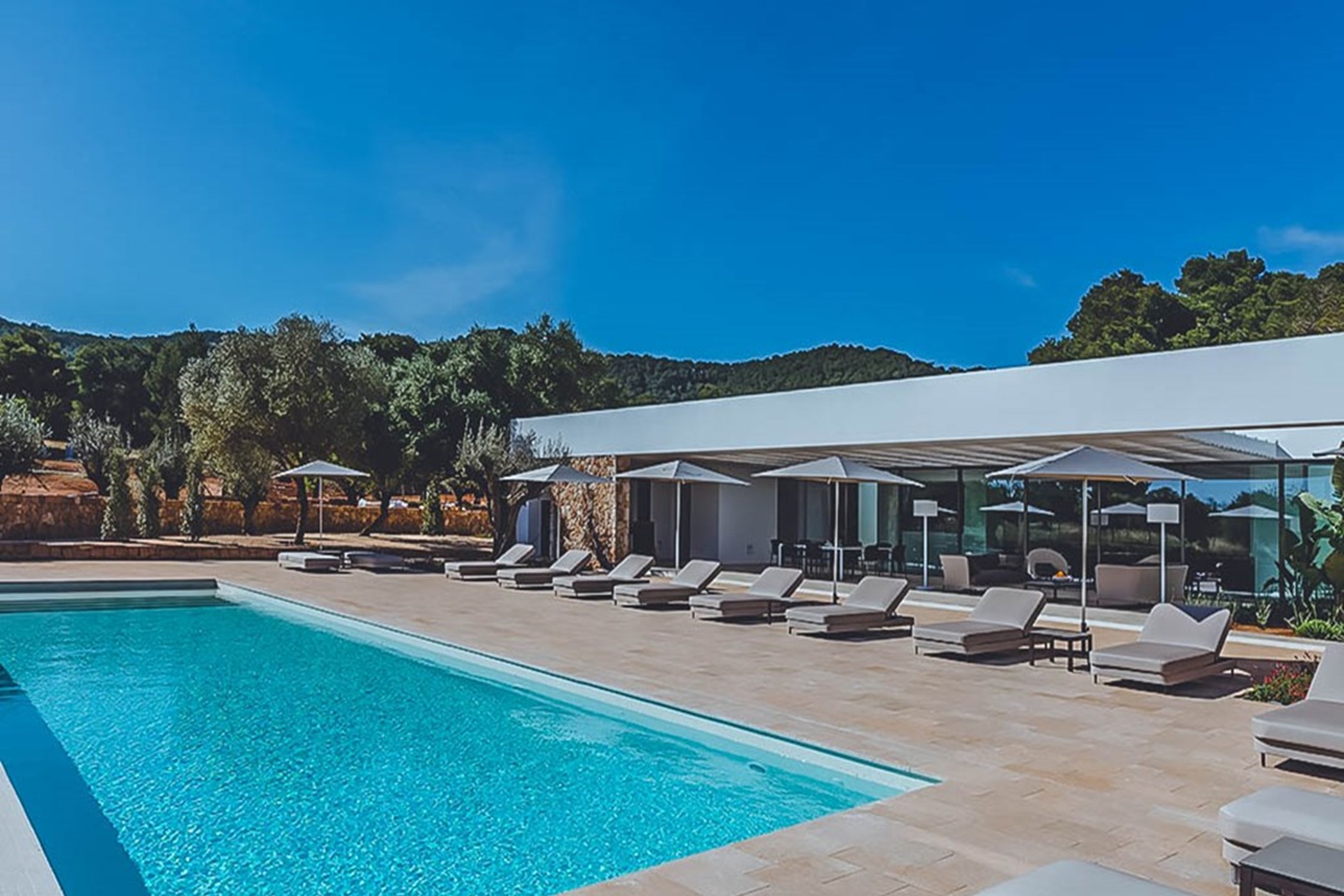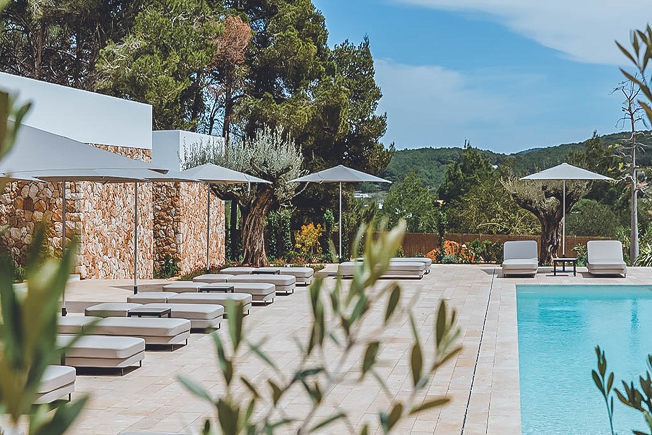 Among its distinguishing elements: an infinity pool that merges visually with the horizon and an outdoor kitchen. The interiors are generous and well-proportioned, with neutral tones that allow the Mediterranean light to do the rest.