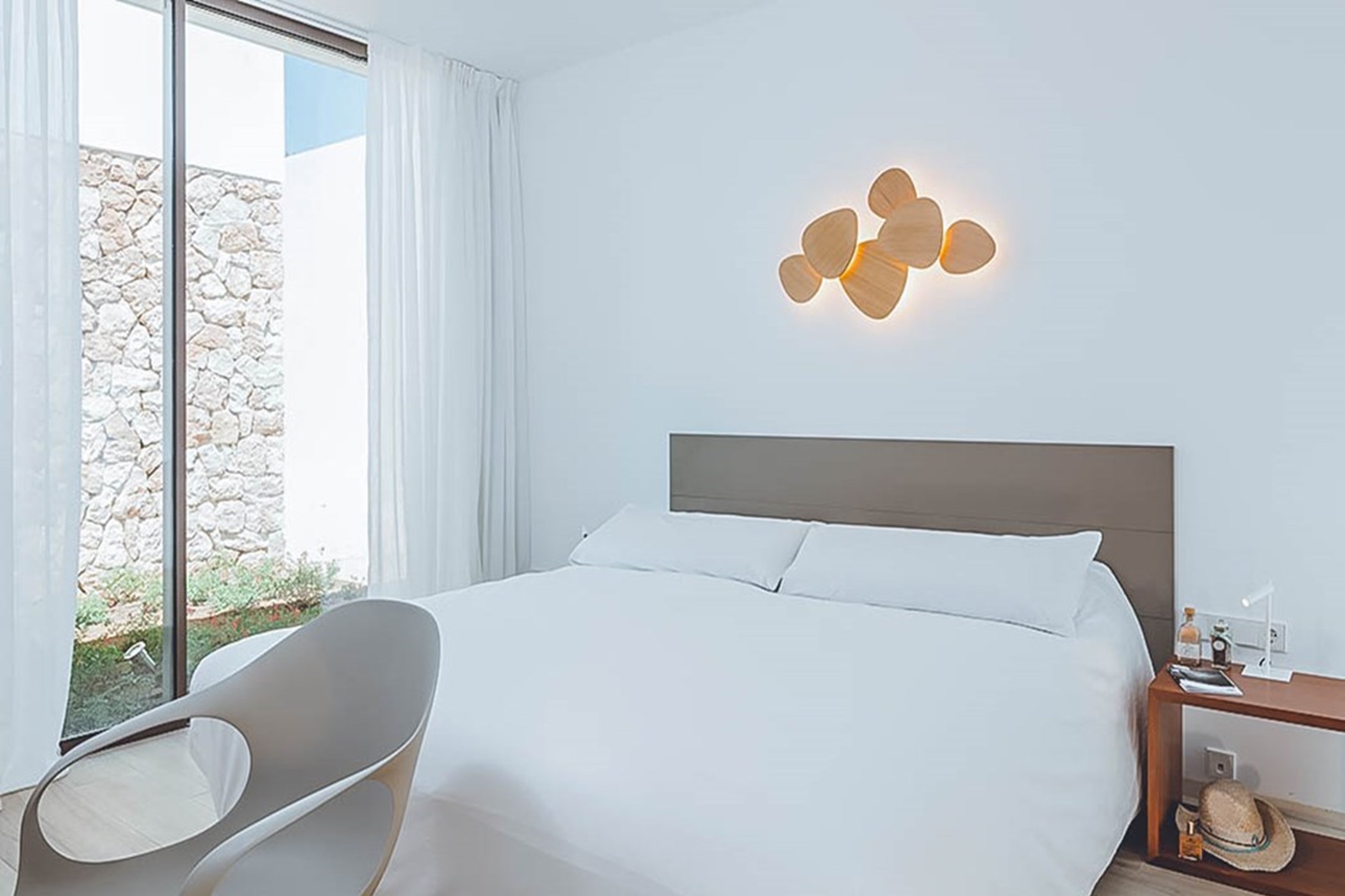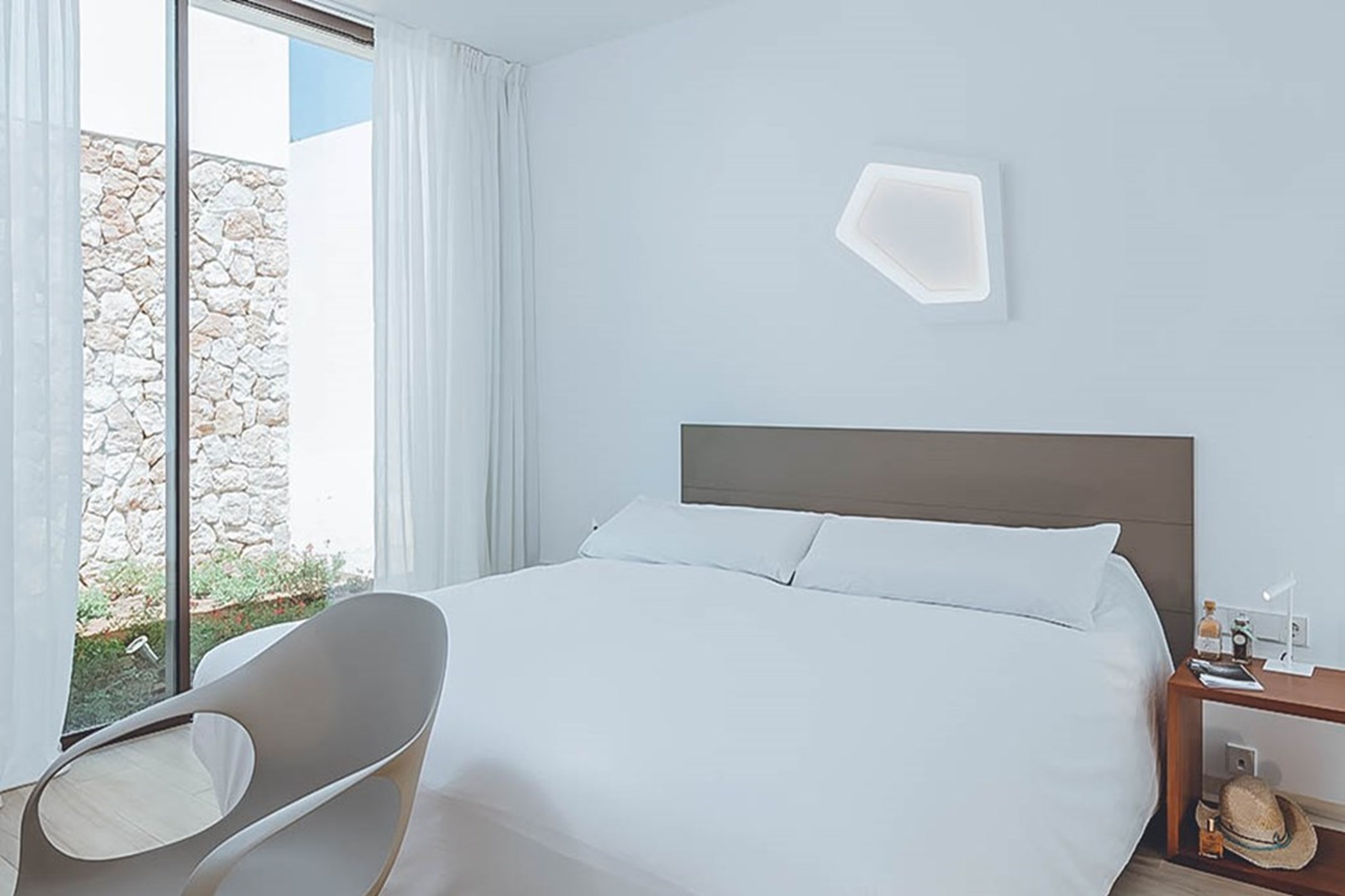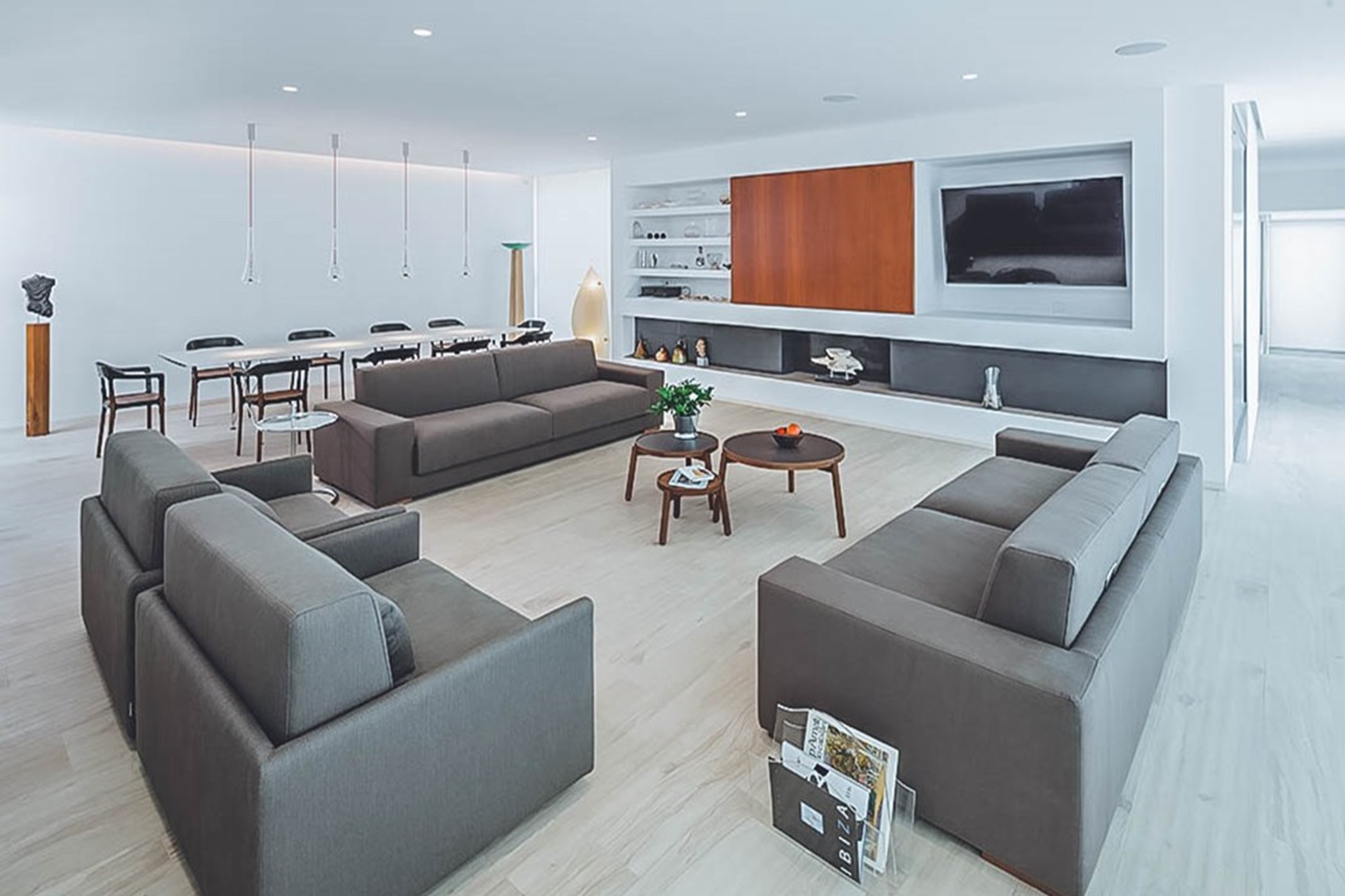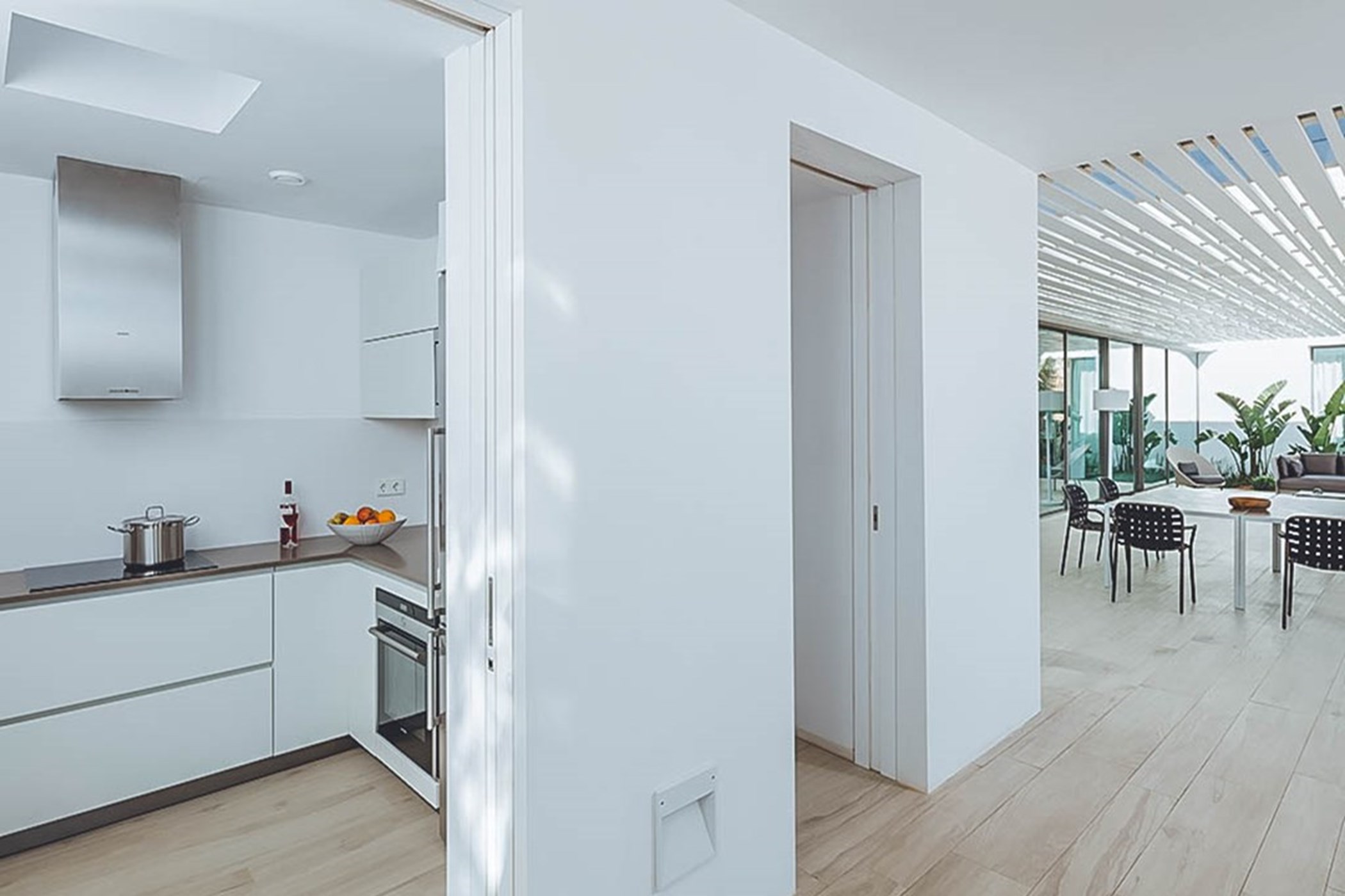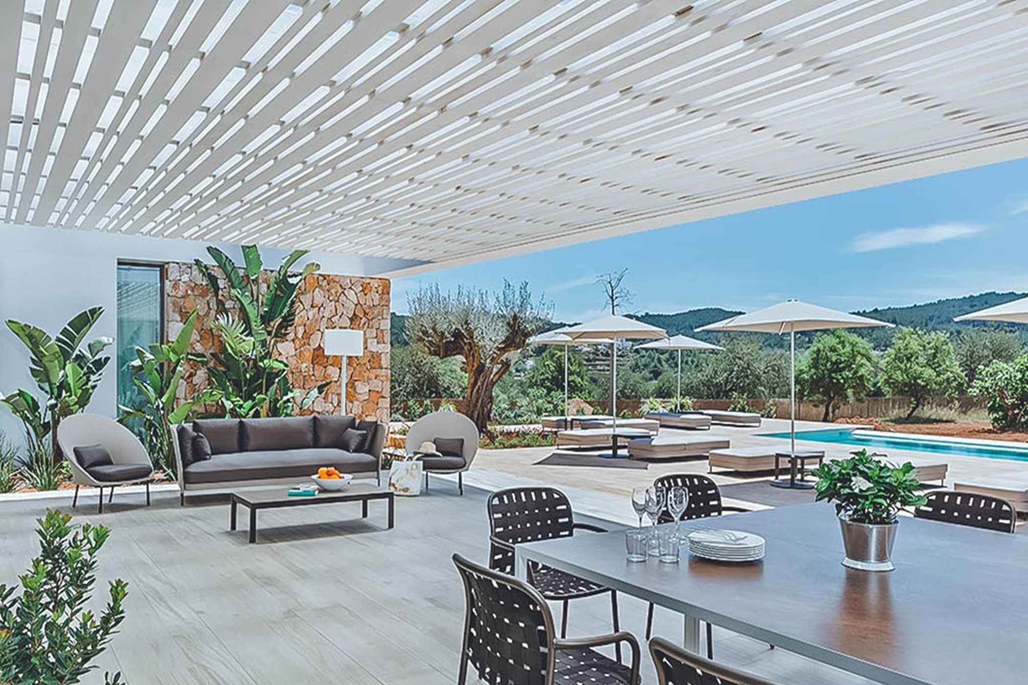 Among its distinguishing elements: an infinity pool that merges visually with the horizon and an outdoor kitchen. The interiors are generous and well-proportioned, with neutral tones that allow the Mediterranean light to do the rest.