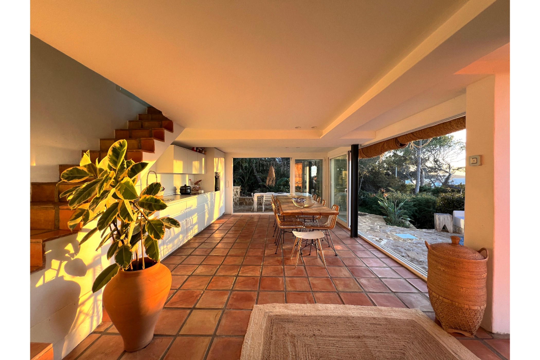 Built into the western hillside of Cala Salada, Rubí Ocaso is a 4-bedroom villa that understands its geography. The architecture opens toward the sea in a series of layered terraces, each one catching the light differently as the day draws to its close.