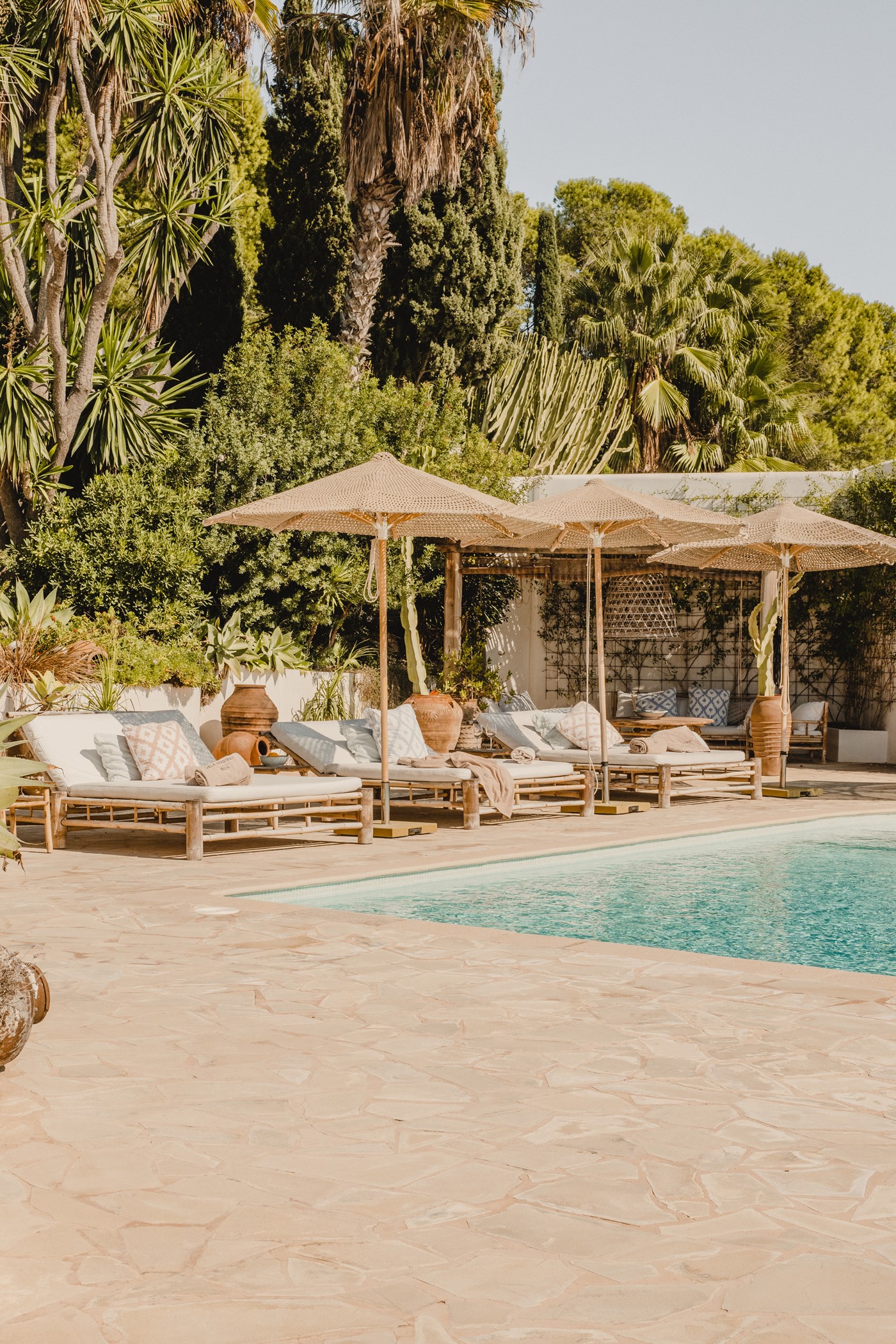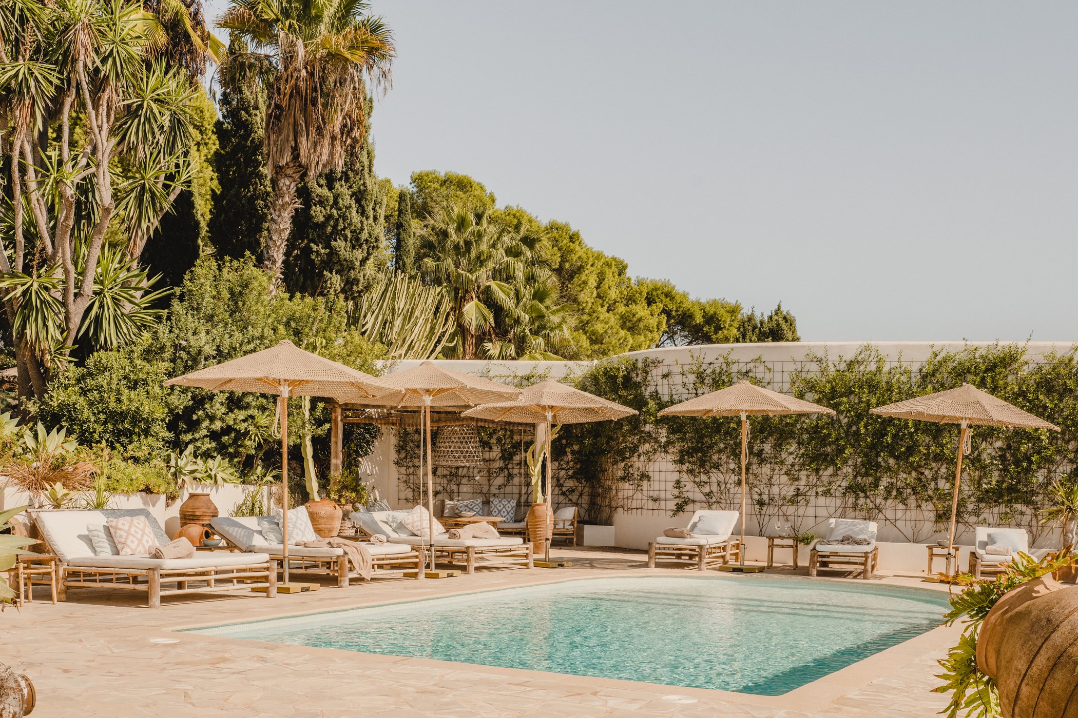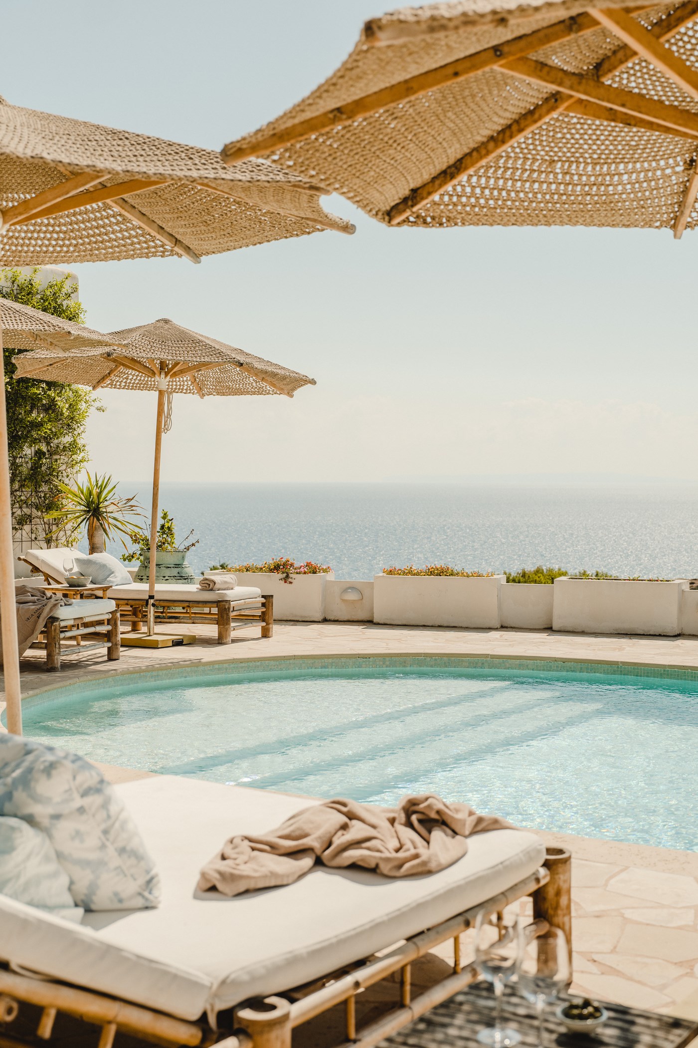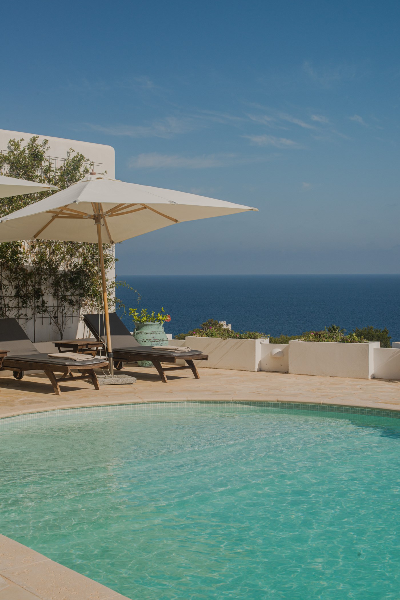 Among its distinguishing elements: a generous private pool at the centre of the grounds. The interiors are generous and well-proportioned, with neutral tones that allow the Mediterranean light to do the rest.