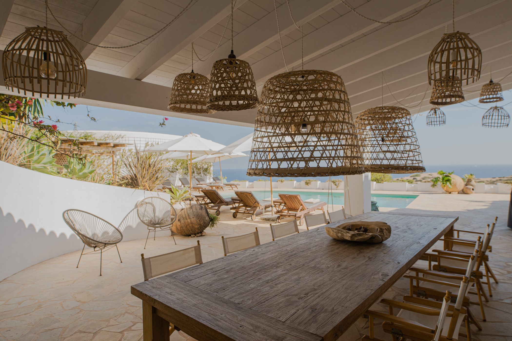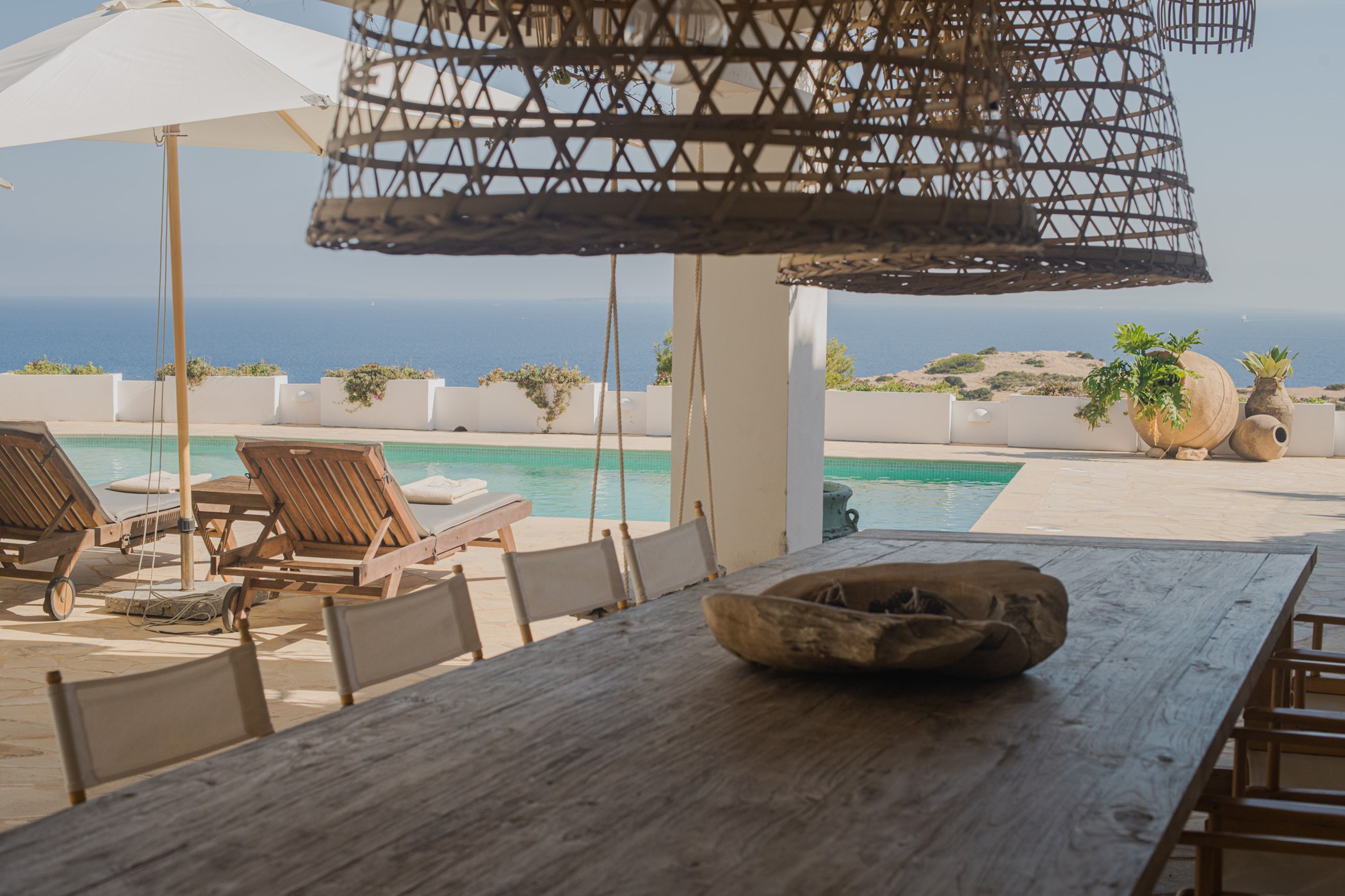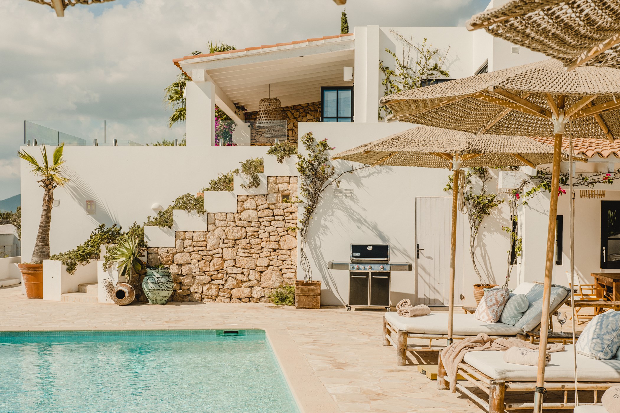 A private swimming pool anchors the outdoor space, framed by sun loungers and shaded seating. The barbecue and al fresco dining area invite long outdoor meals. Terraces are oriented to maximise the sea views.