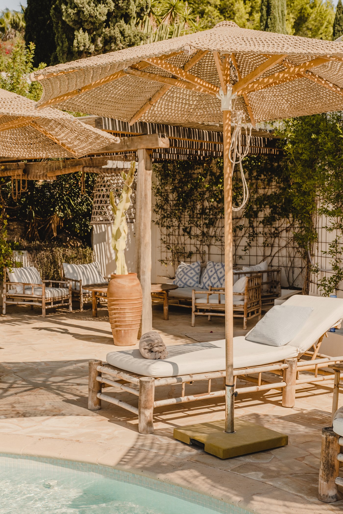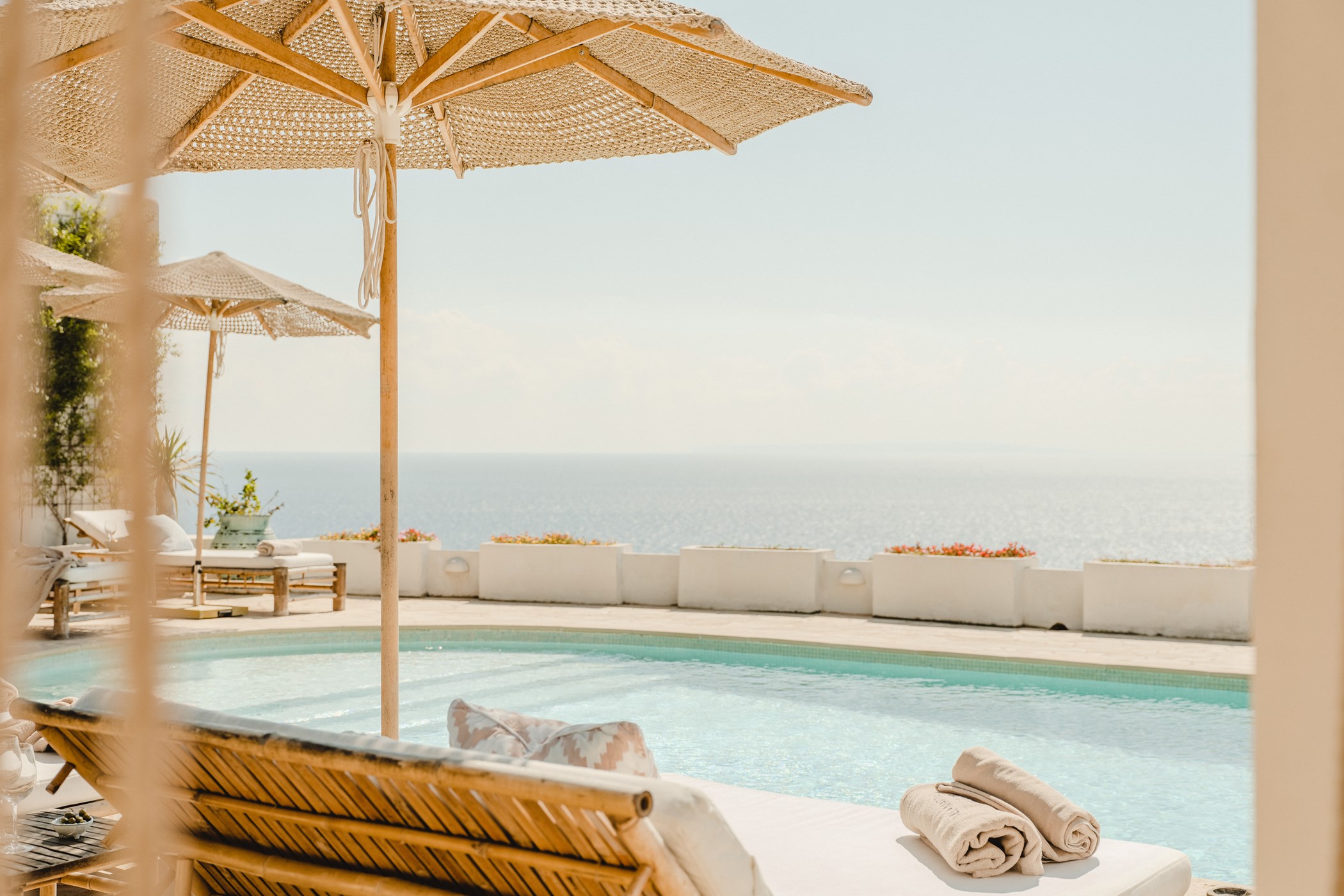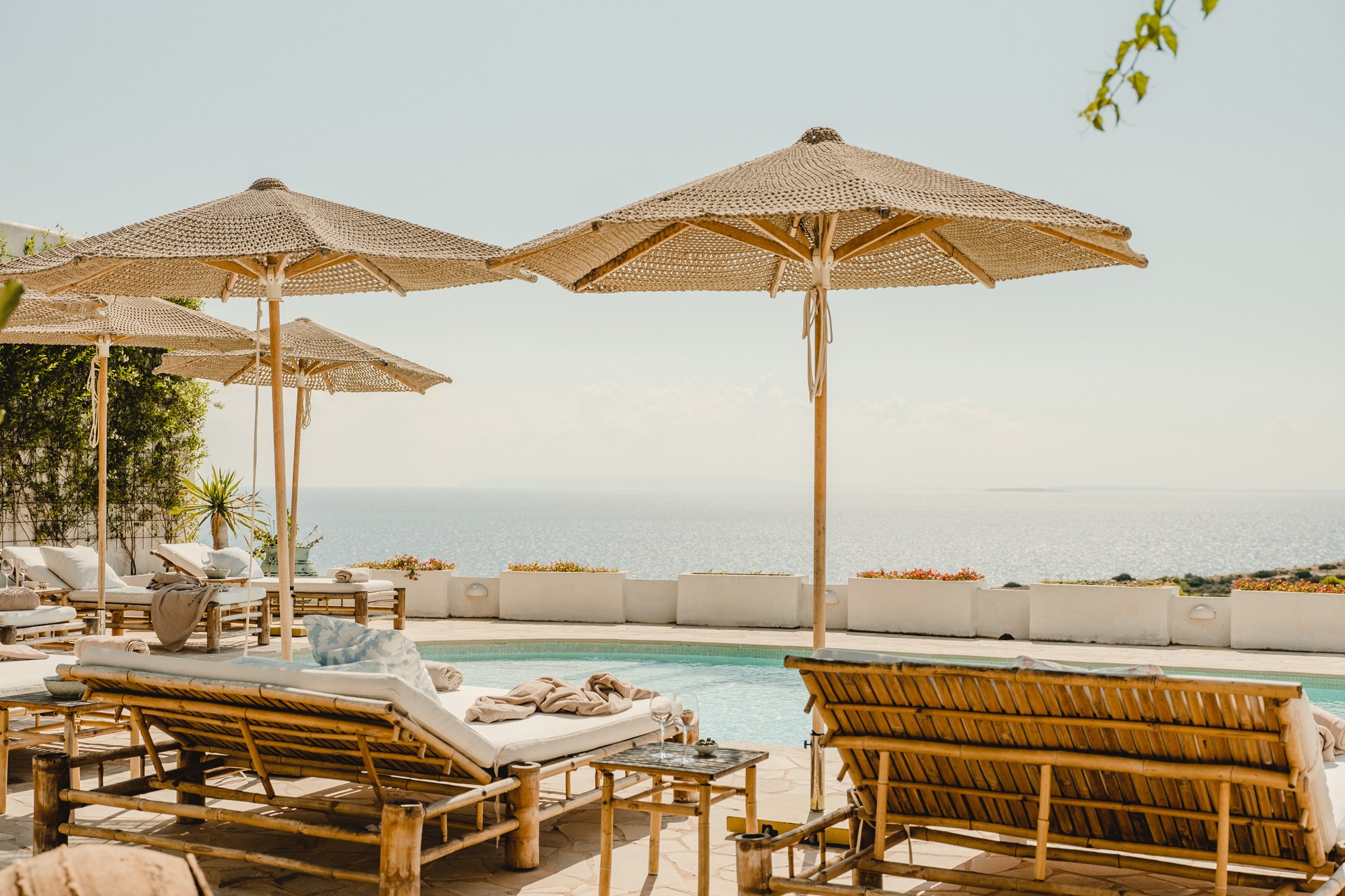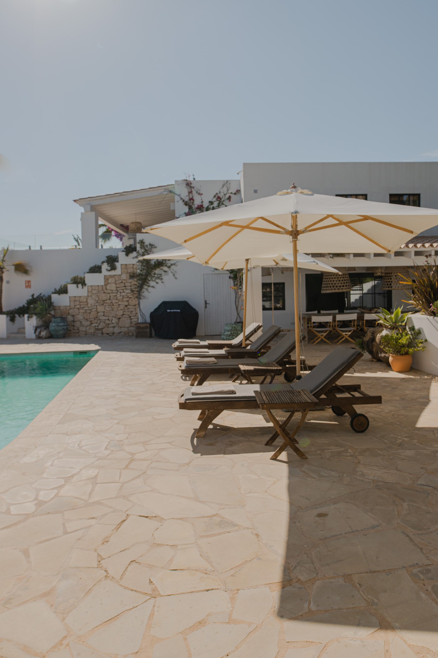 A private swimming pool anchors the outdoor space, framed by sun loungers and shaded seating. The barbecue and al fresco dining area invite long outdoor meals. Terraces are oriented to maximise the sea views.