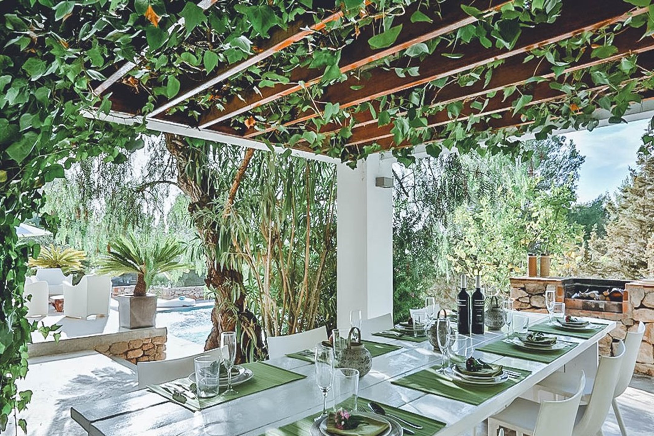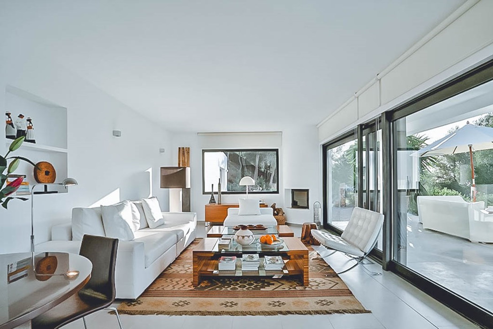 The infinity pool commands the outdoor space, its vanishing edge drawing the eye to the horizon beyond. The barbecue and al fresco dining area invite long outdoor meals. Mature Mediterranean gardens provide both shade and fragrance. West-facing terraces capture the evening light in full.