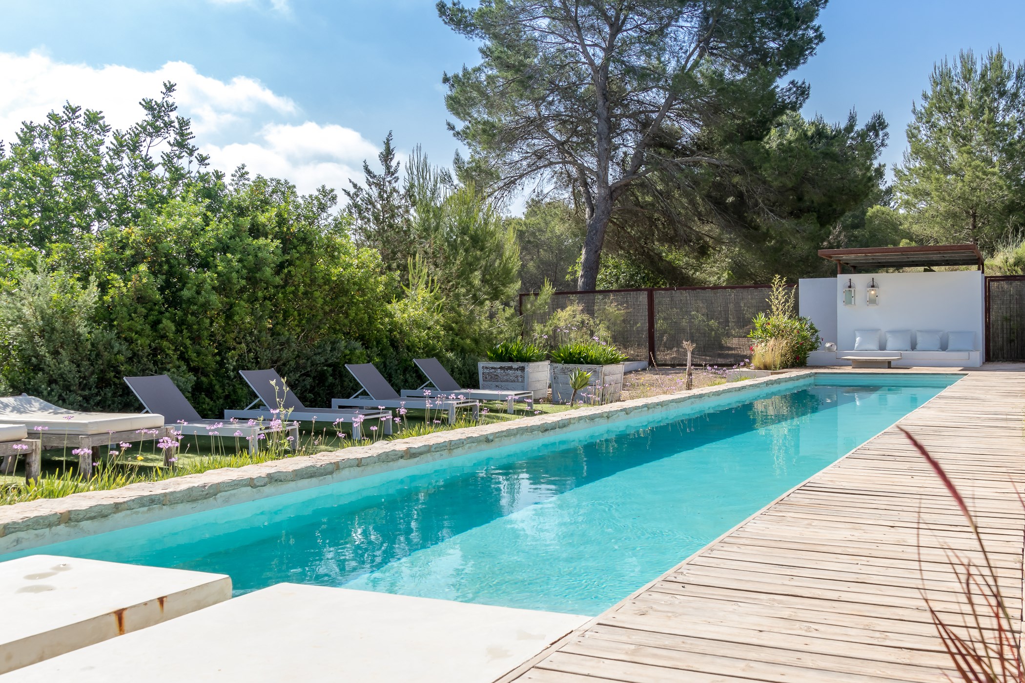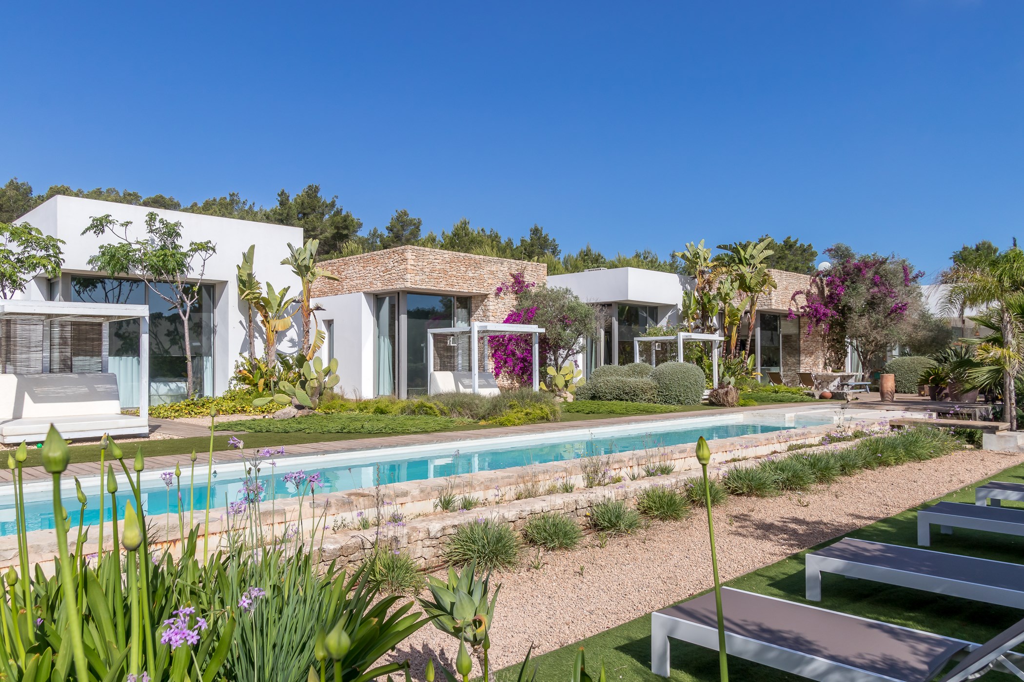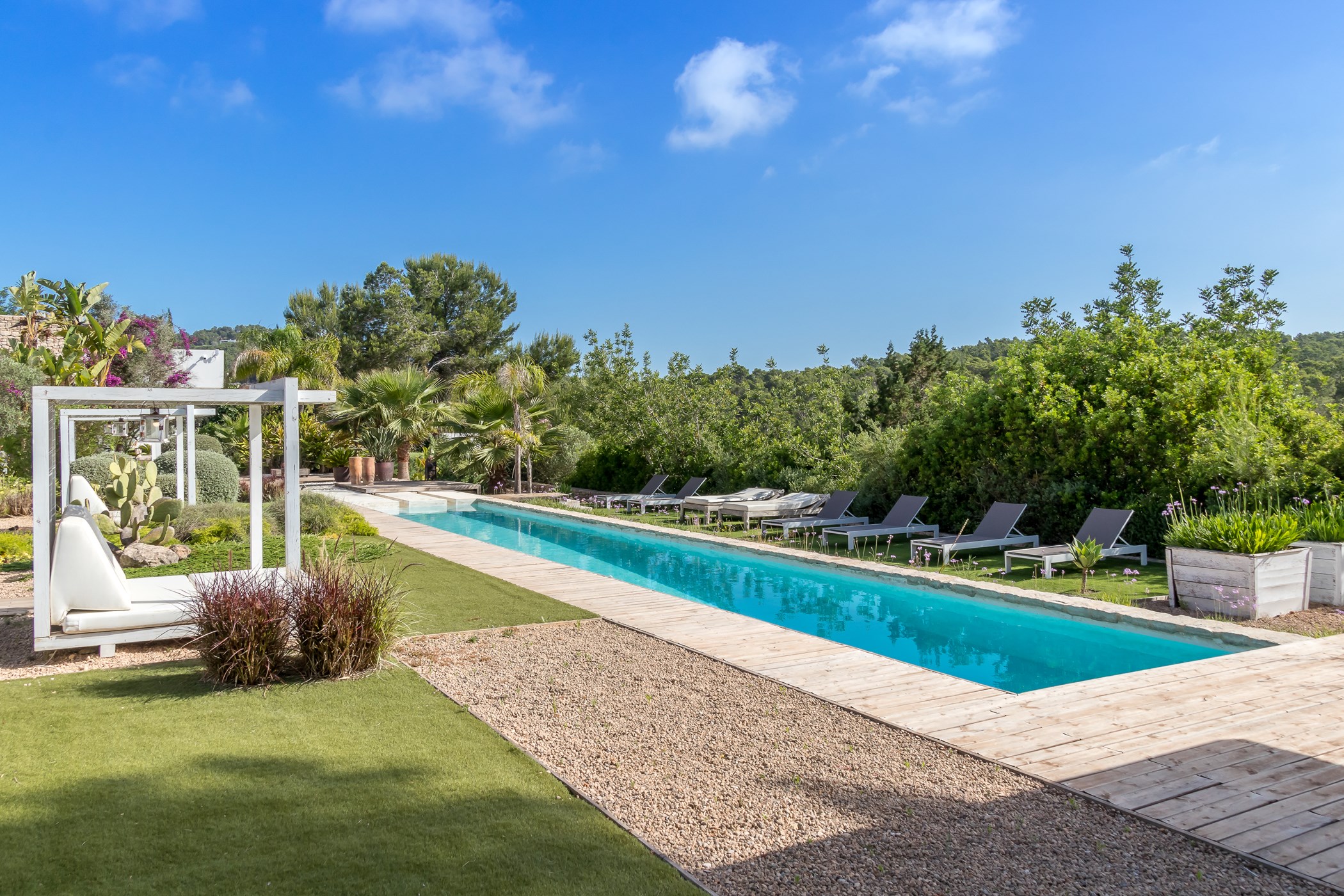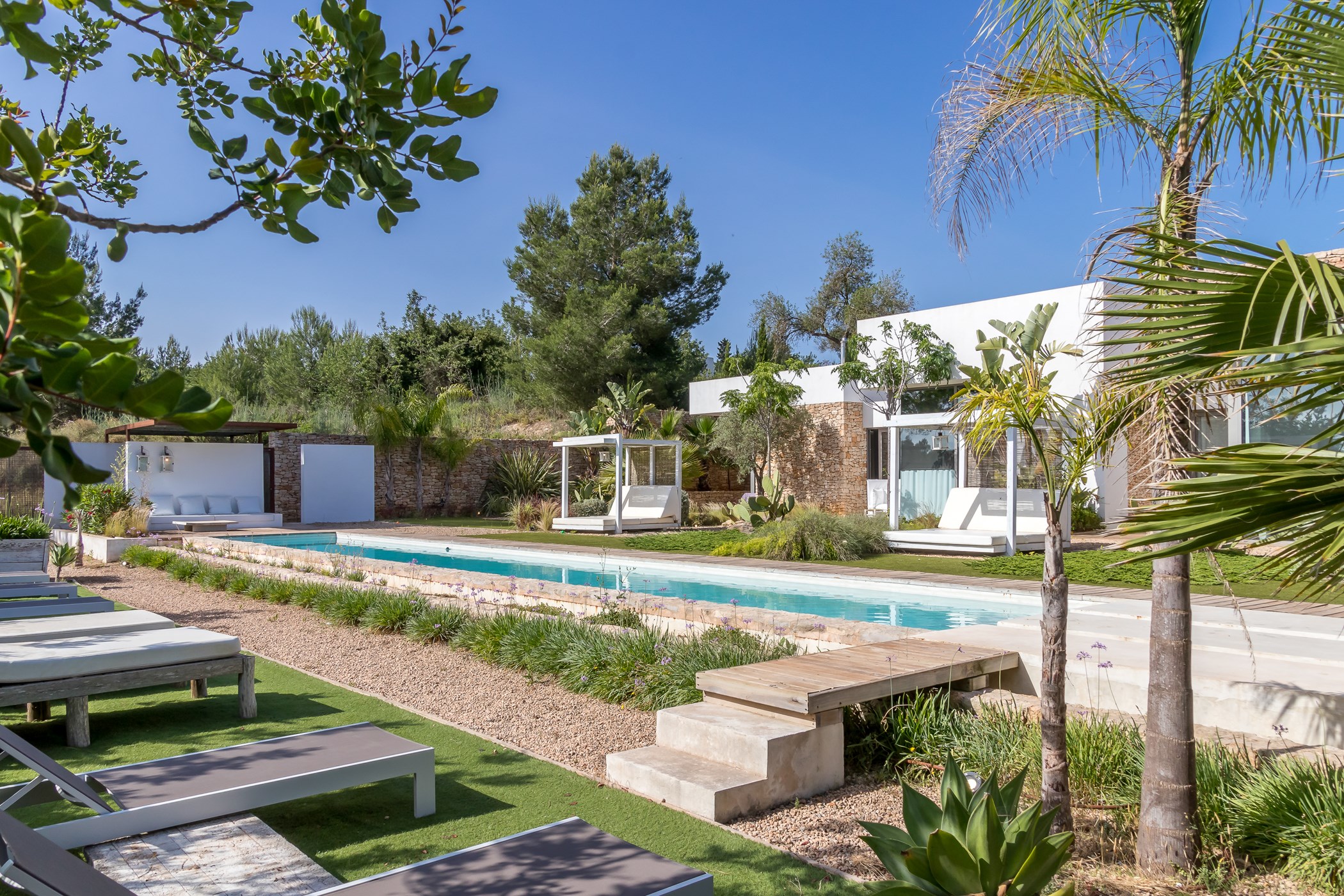 Among its distinguishing elements: a generous private pool at the centre of the grounds. The interiors are generous and well-proportioned, with neutral tones that allow the Mediterranean light to do the rest.