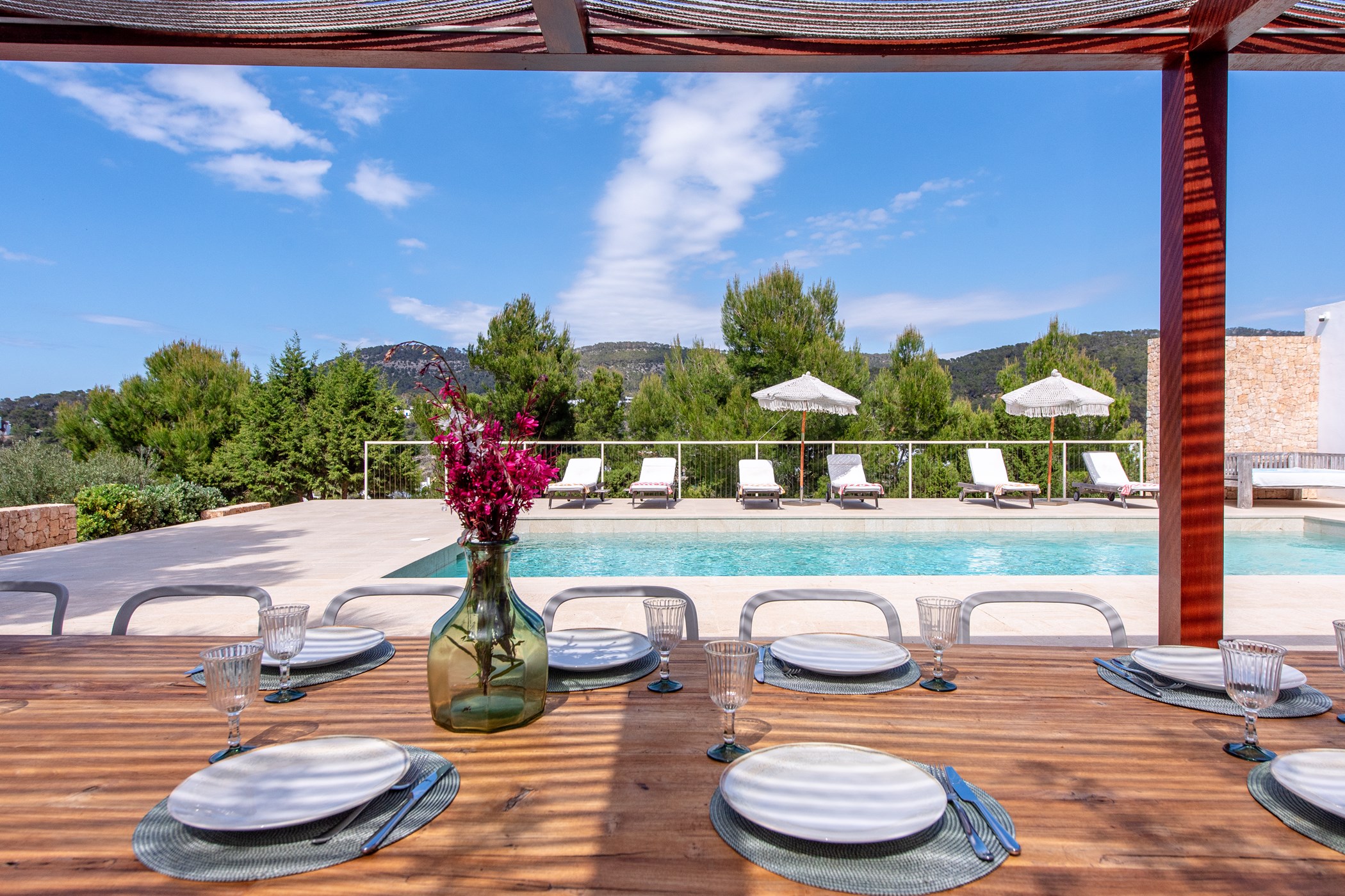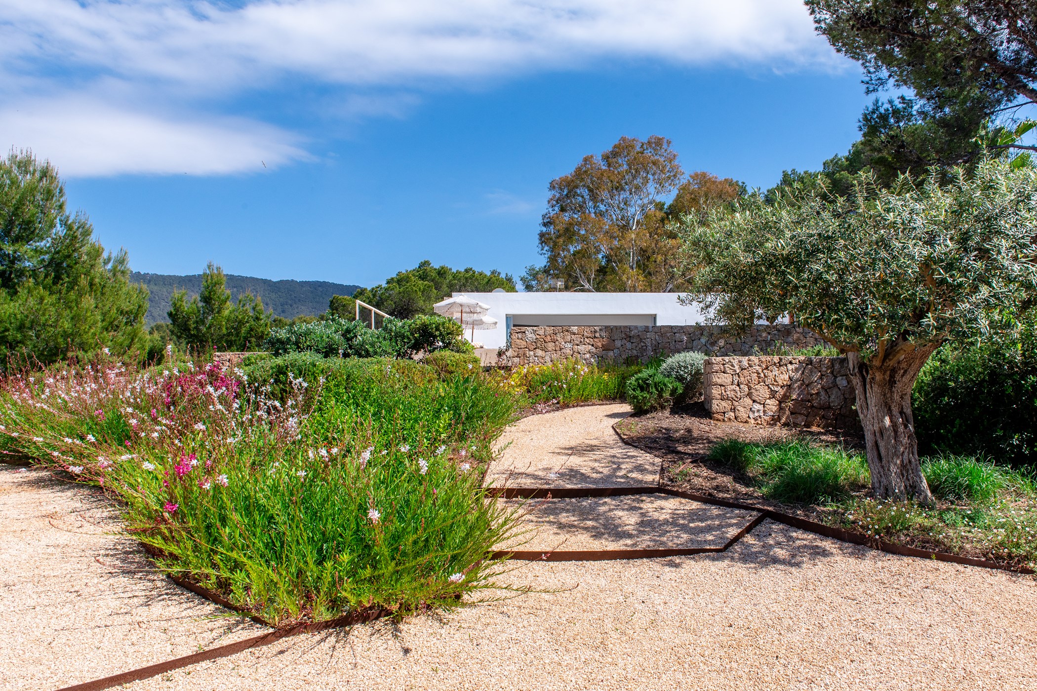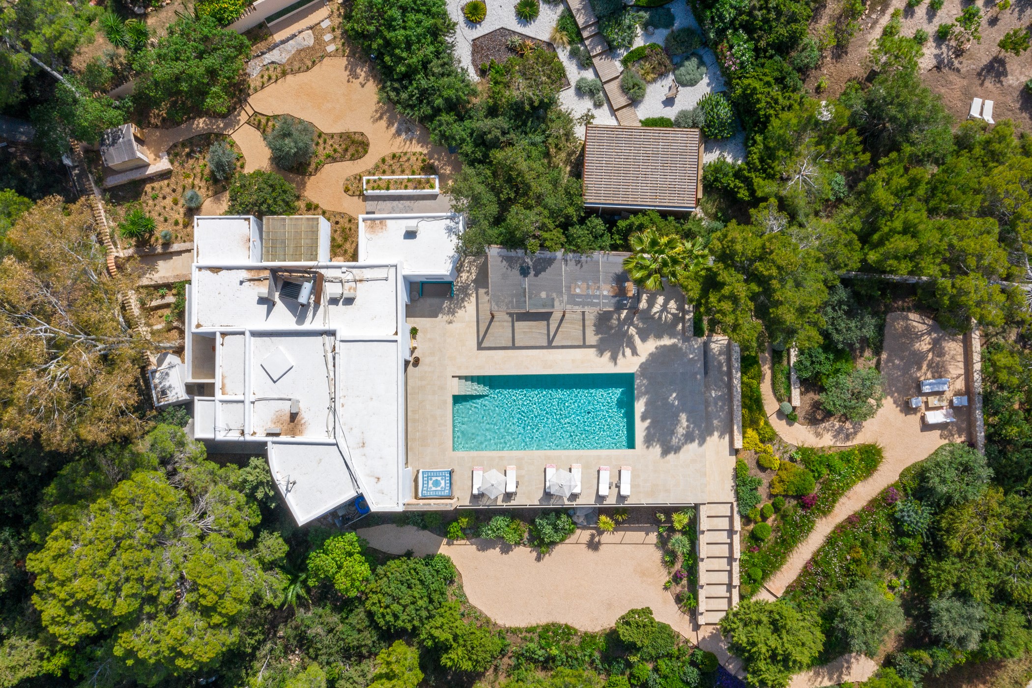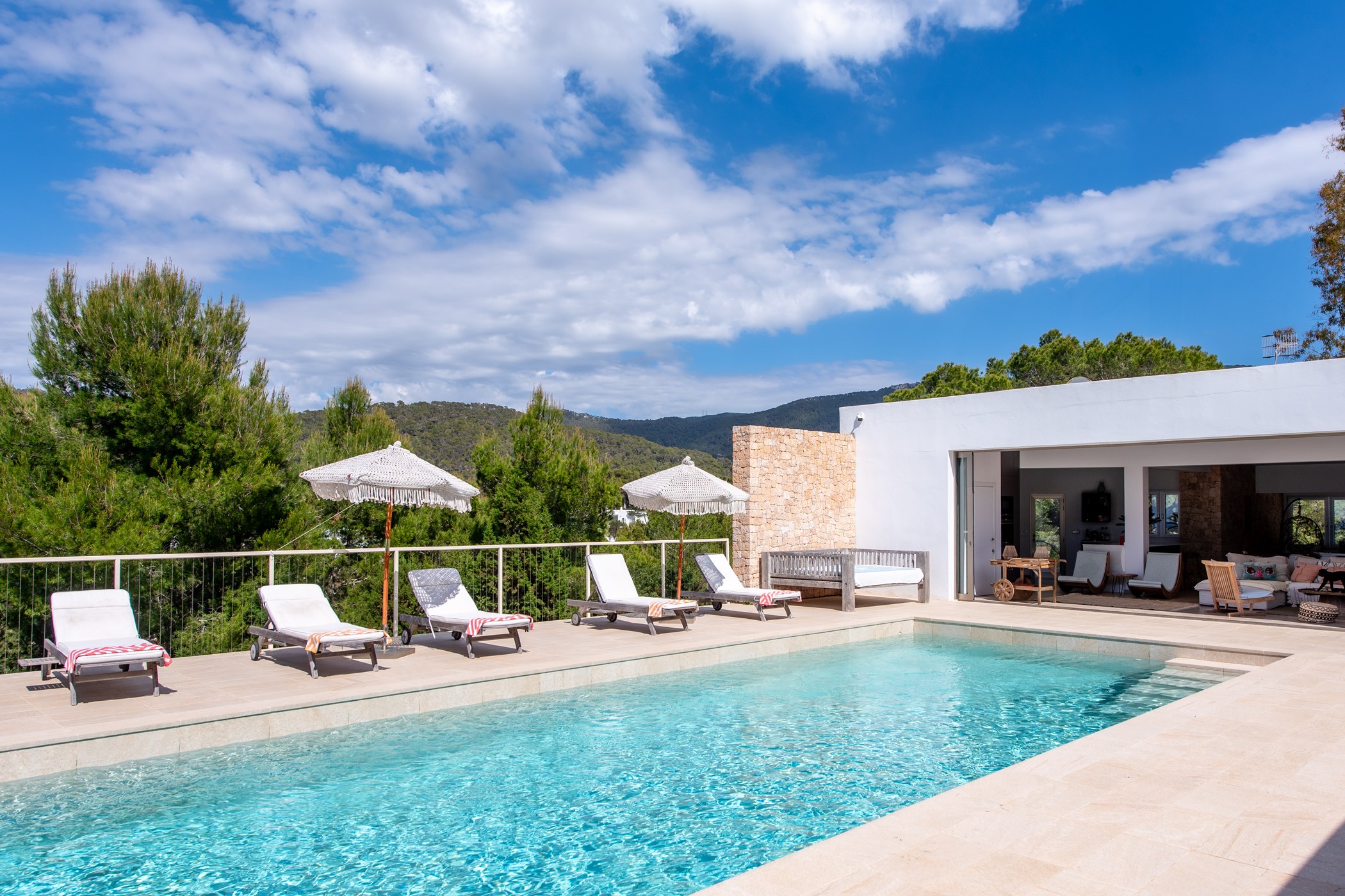 Among its distinguishing elements: a generous private pool at the centre of the grounds. The interiors are generous and well-proportioned, with neutral tones that allow the Mediterranean light to do the rest.