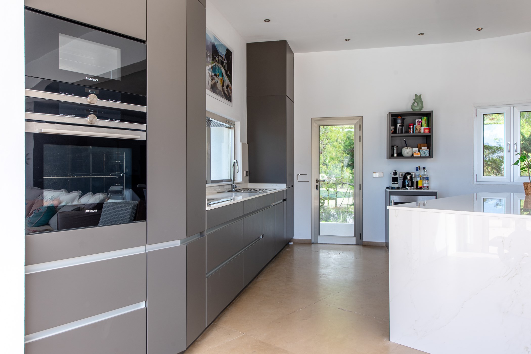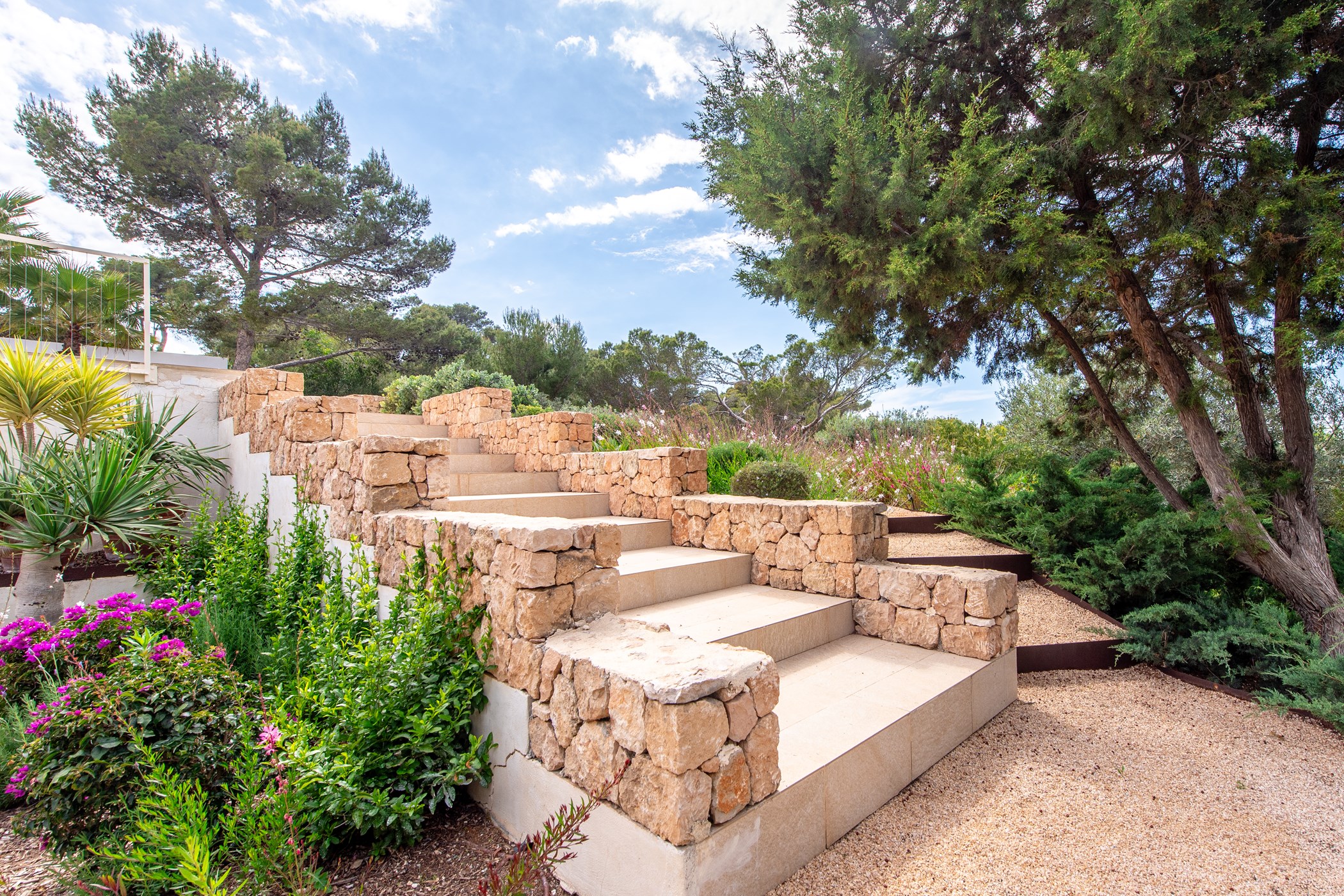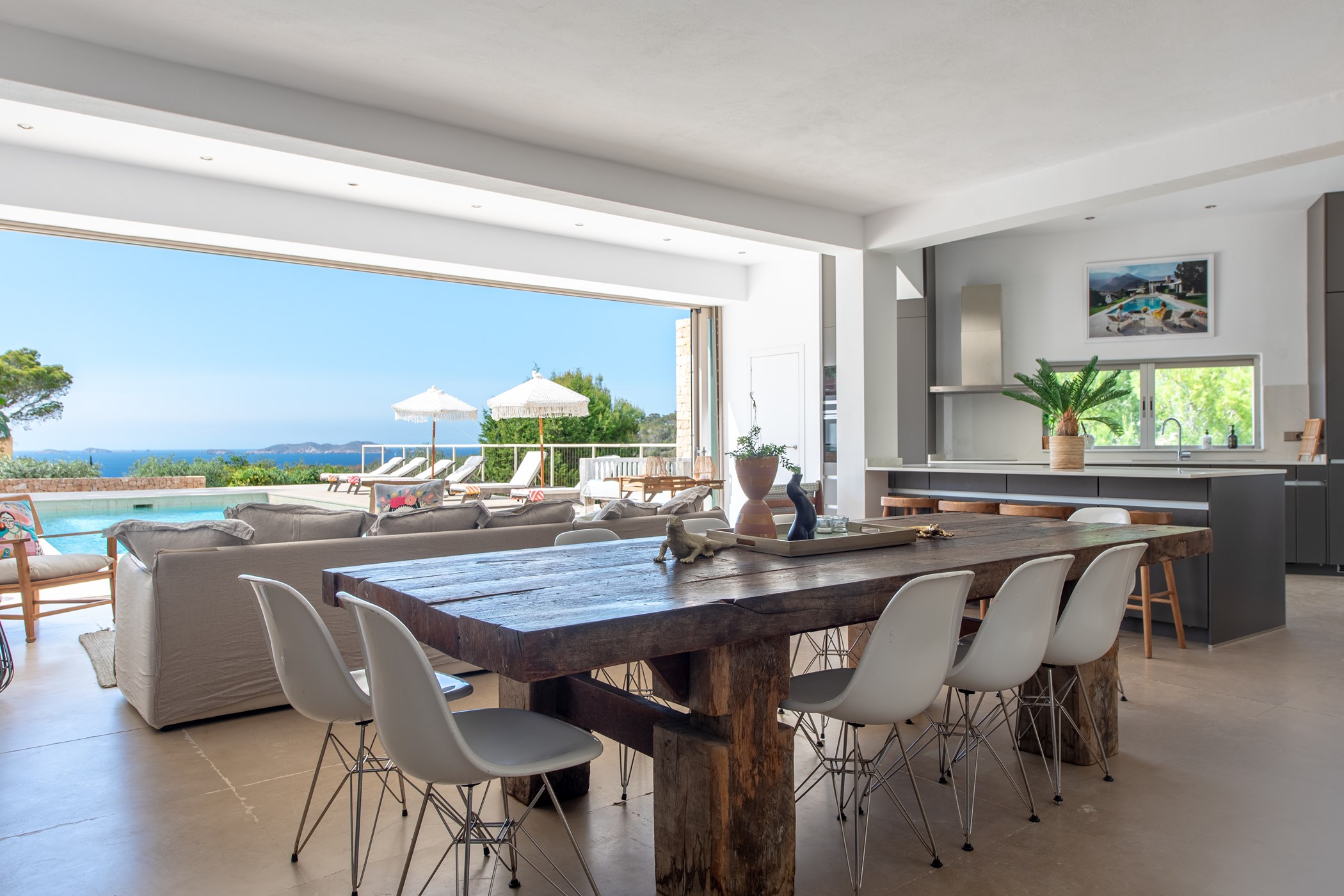 Among its distinguishing elements: a generous private pool at the centre of the grounds. The interiors are generous and well-proportioned, with neutral tones that allow the Mediterranean light to do the rest.