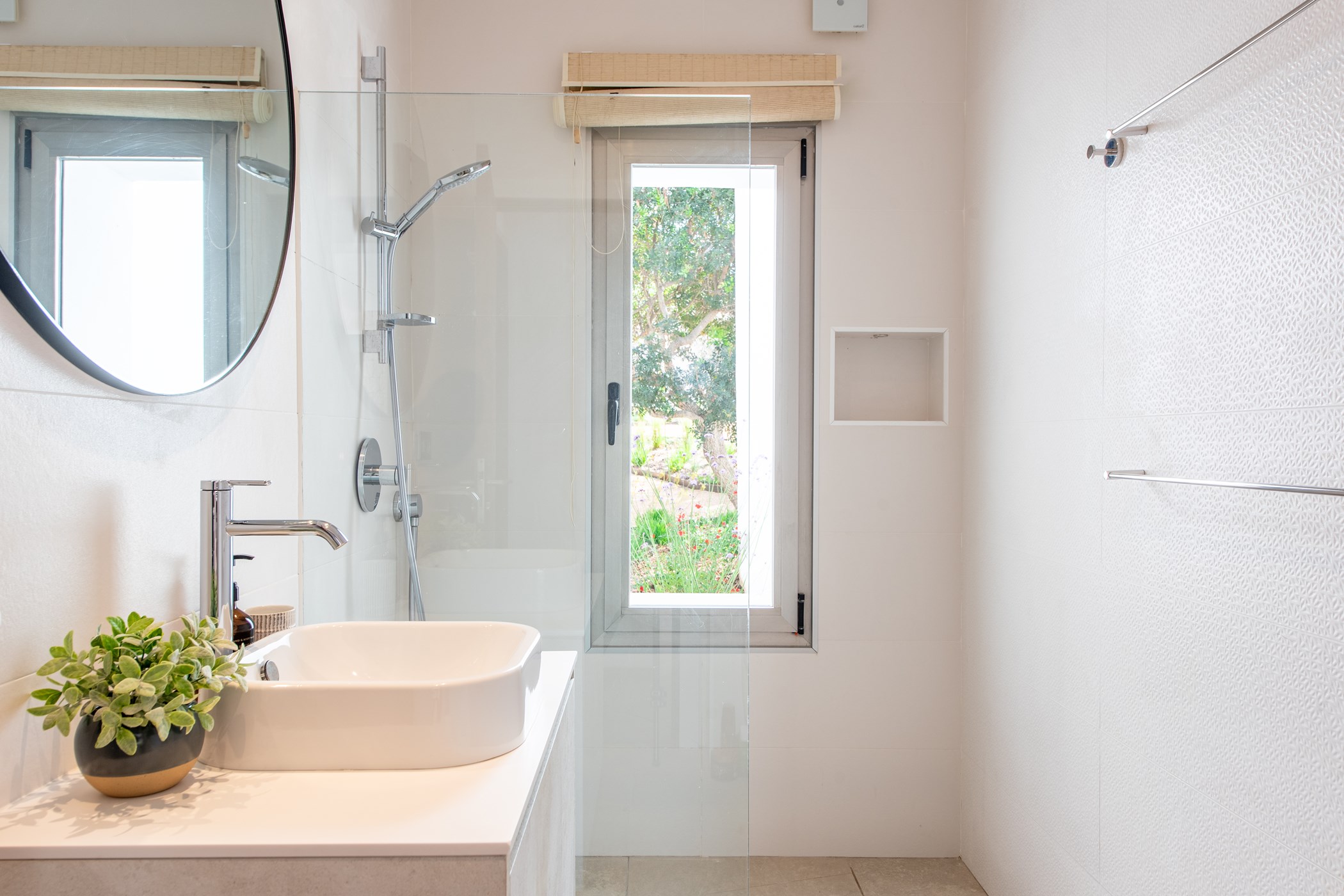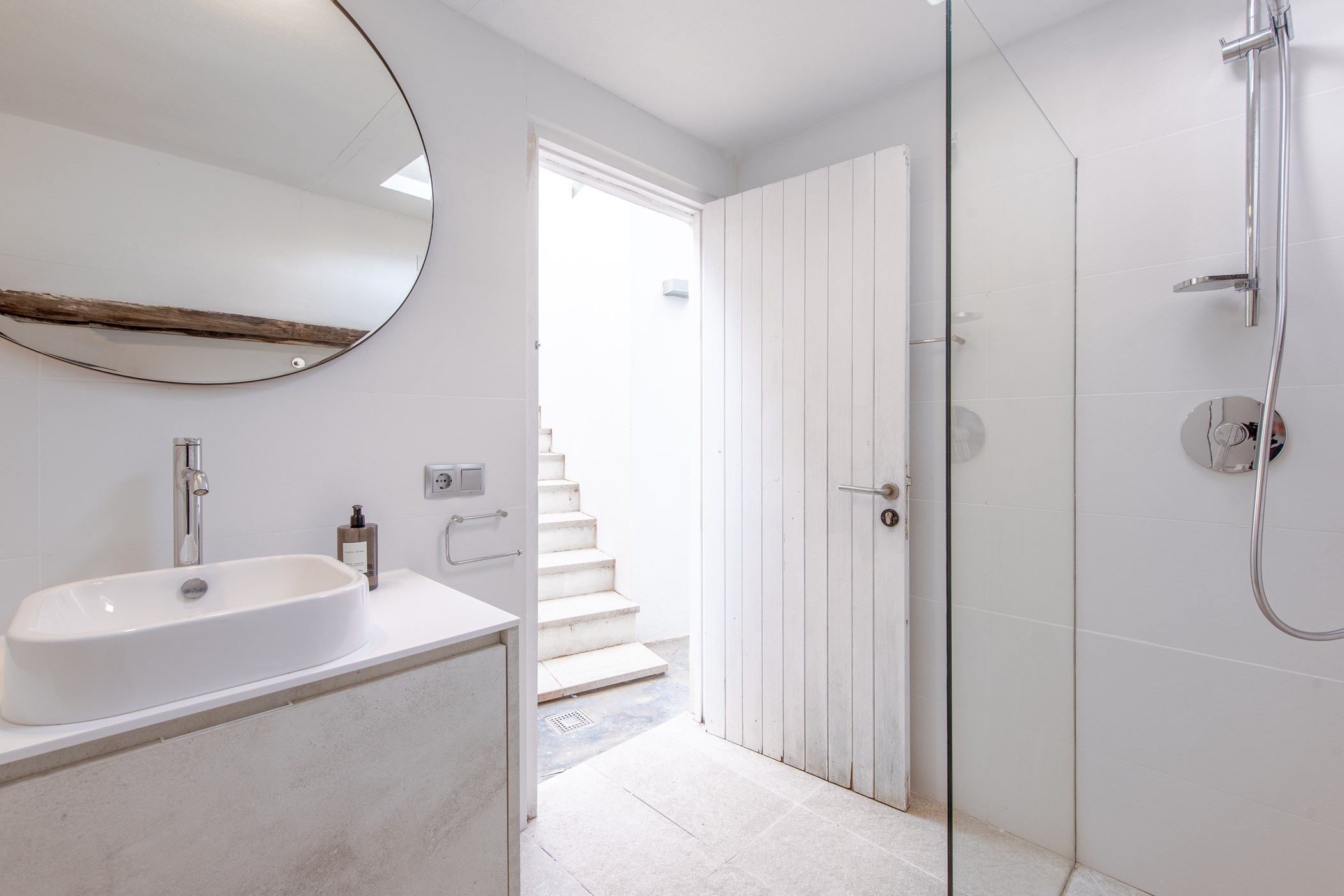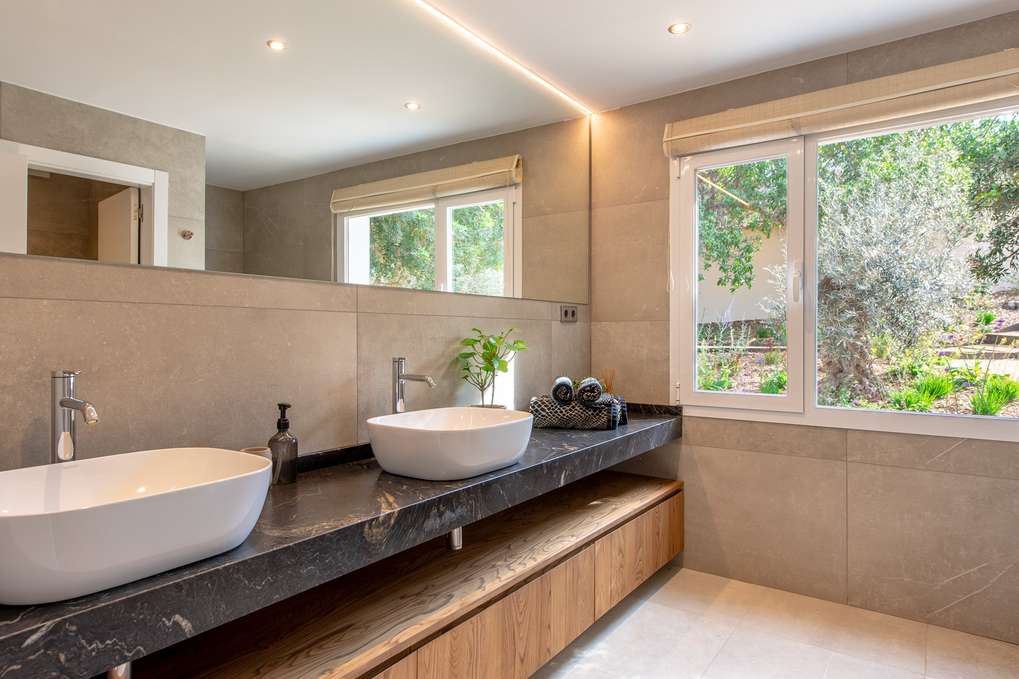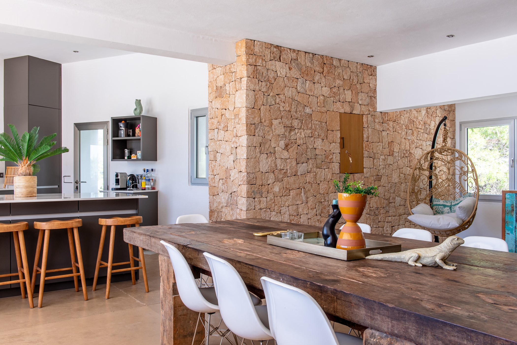Among its distinguishing elements: a generous private pool at the centre of the grounds. The interiors are generous and well-proportioned, with neutral tones that allow the Mediterranean light to do the rest.