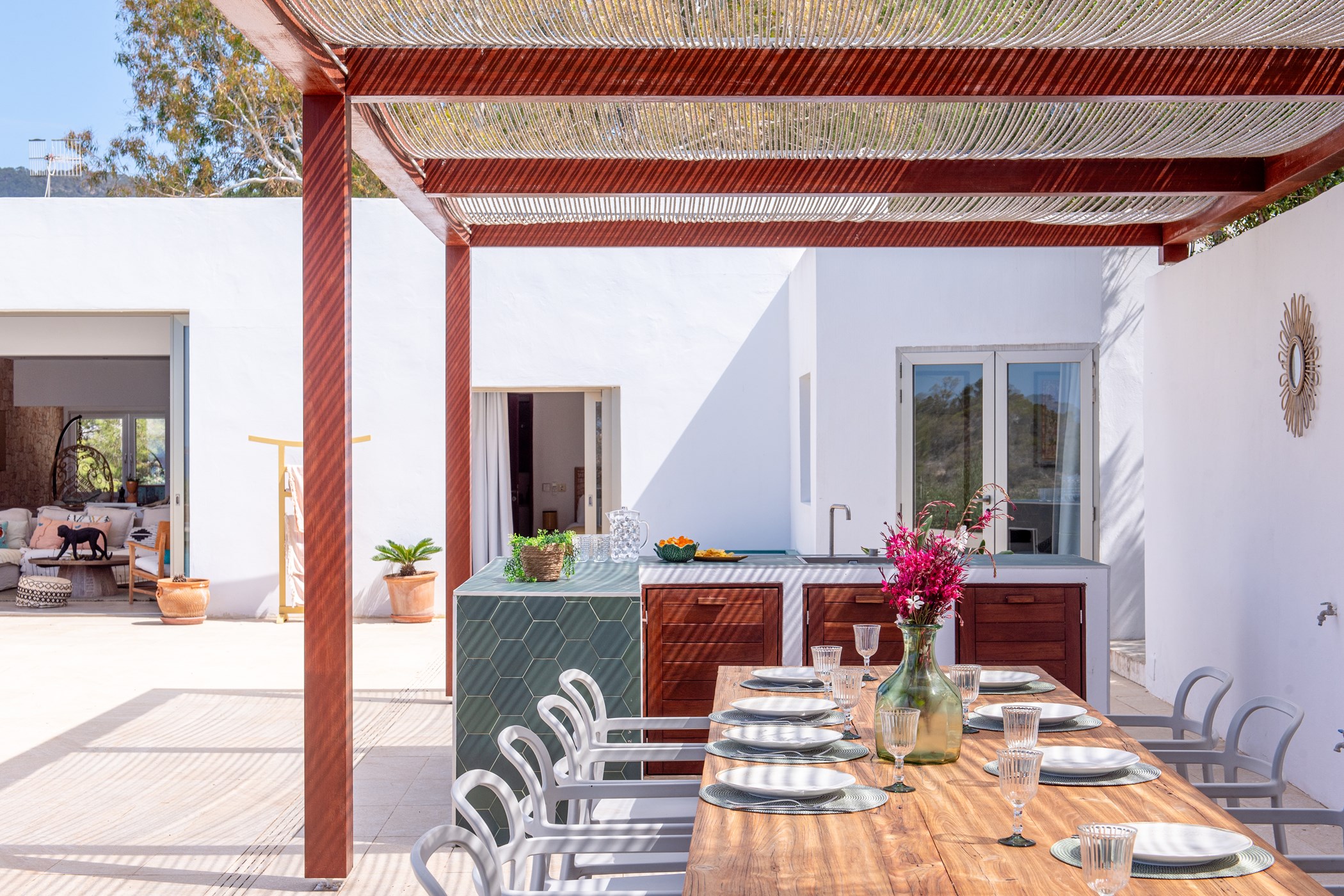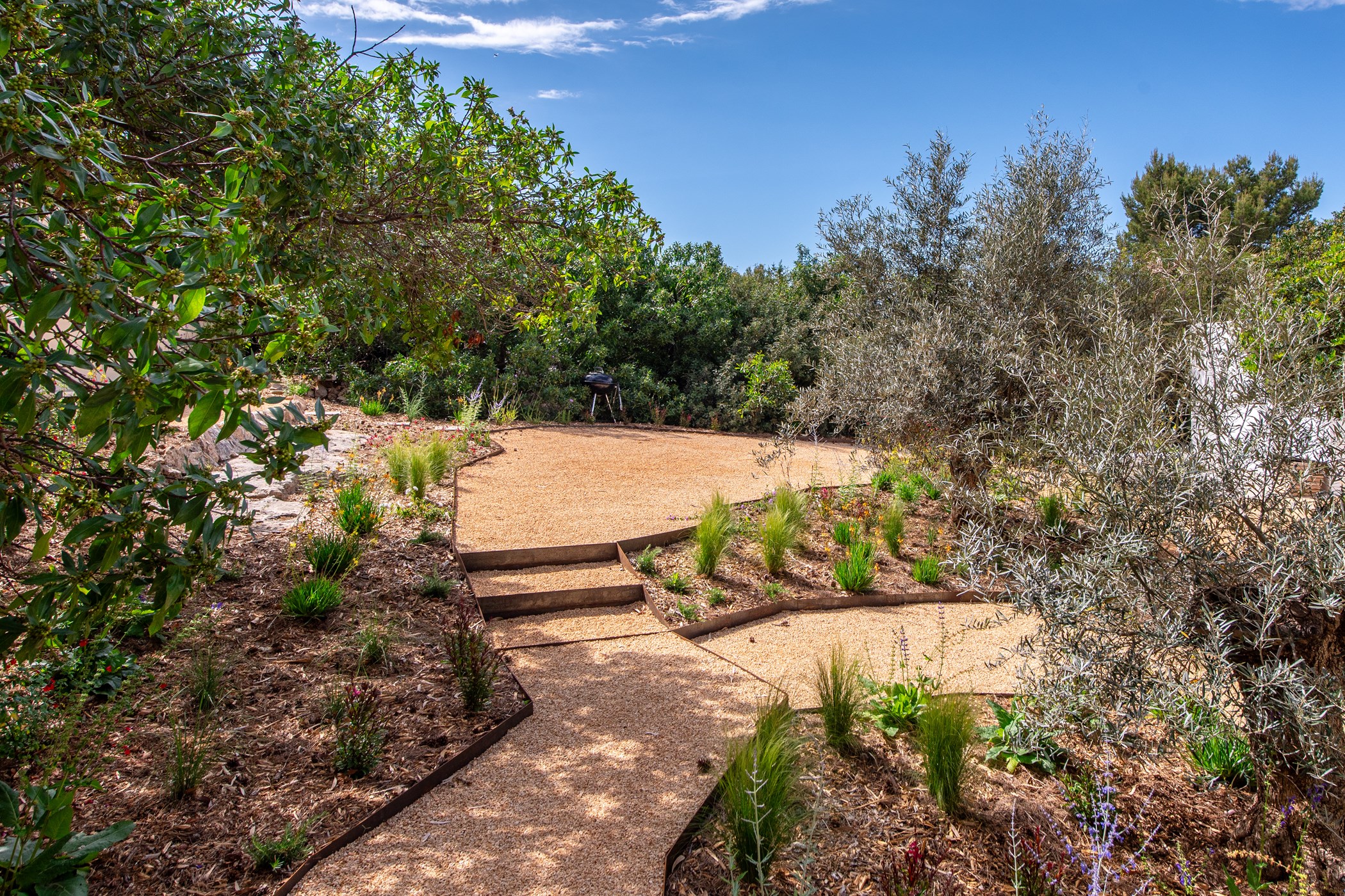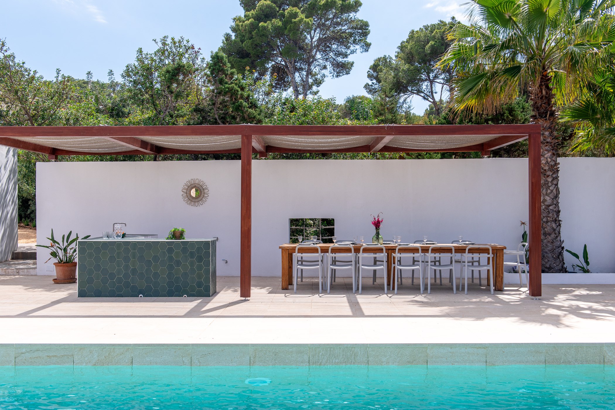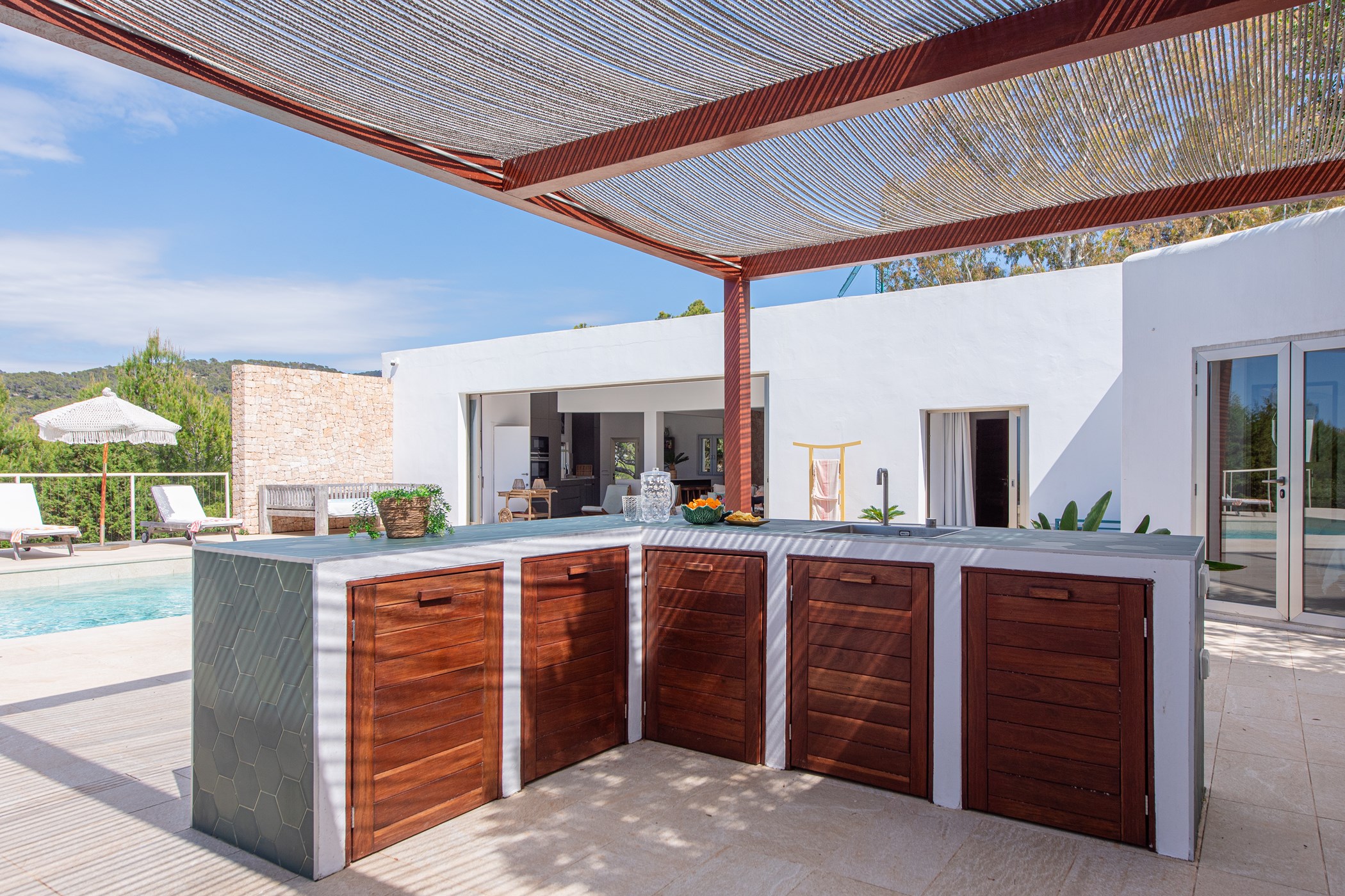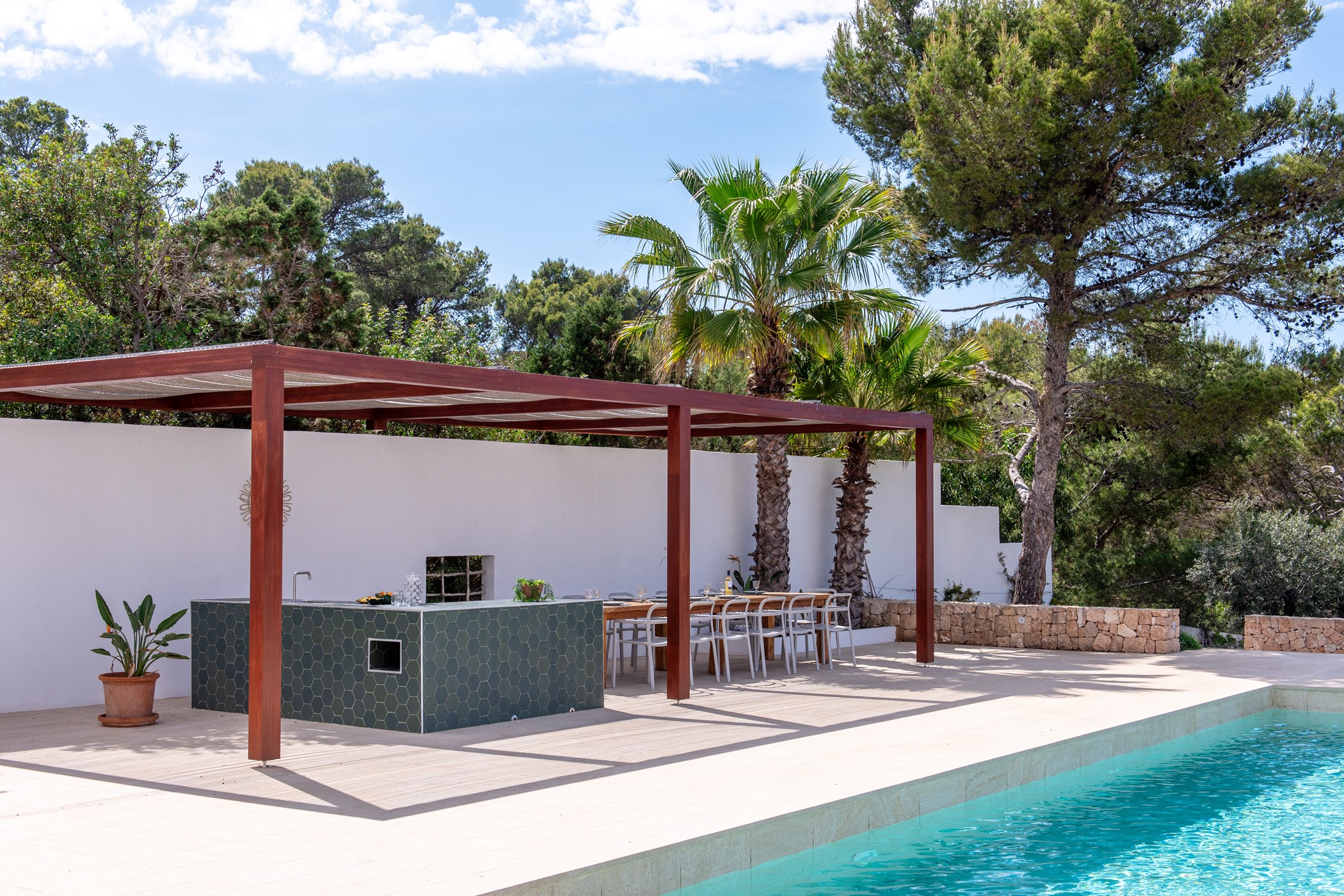 A private swimming pool anchors the outdoor space, framed by sun loungers and shaded seating. The barbecue and al fresco dining area invite long outdoor meals. Mature Mediterranean gardens provide both shade and fragrance. West-facing terraces capture the evening light in full.